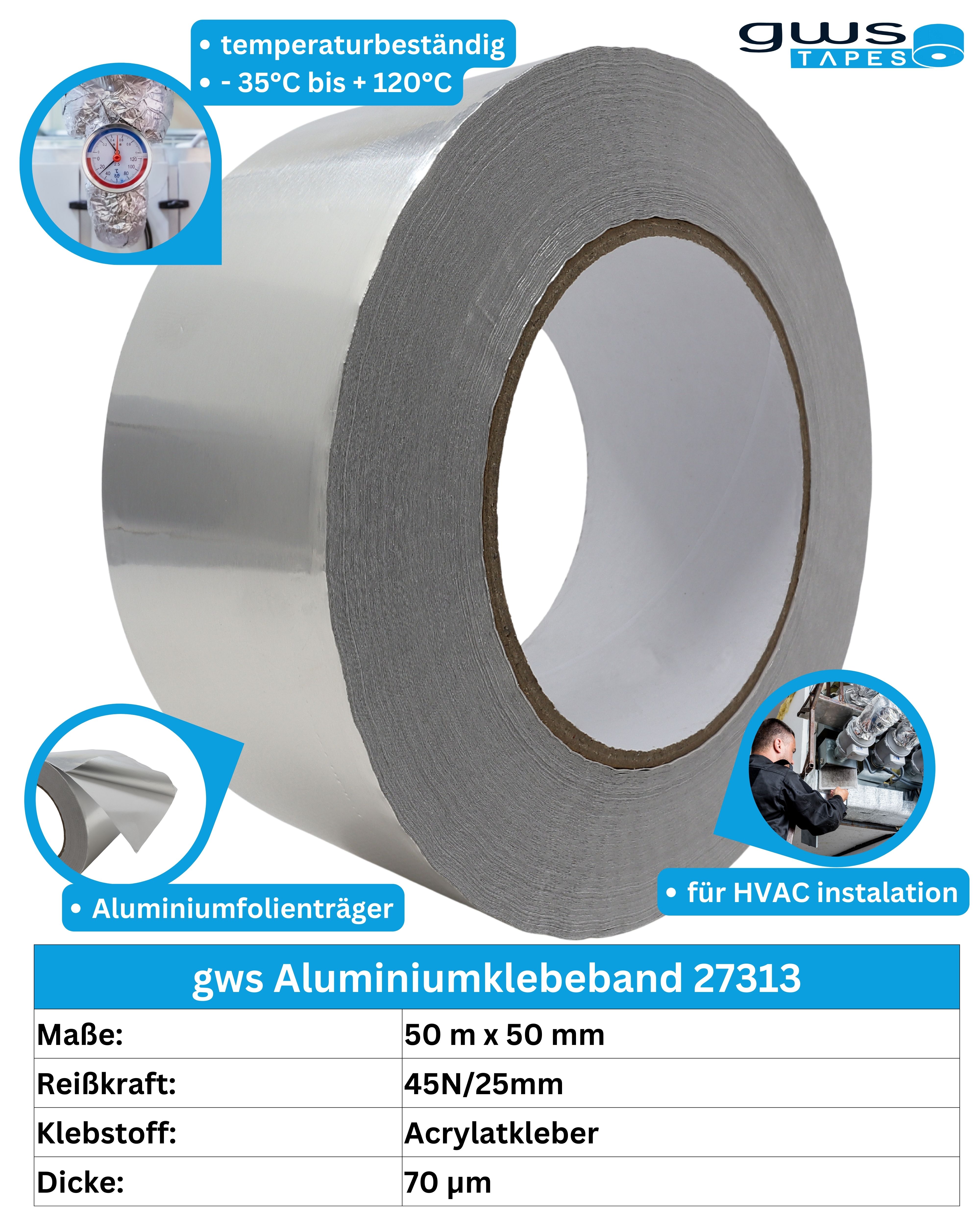 Das gws 27313 ist ein 30 Mikrometer (1,2 mil) starkes Aluminiumklebeband mit hoher Zugfestigkeit. Es verfügt über einen kältebeständigen Acrylkleber, der durch ein silikonbeschichtetes Abdeckpapier geschützt wird, welches sich leicht ablösen lässt.