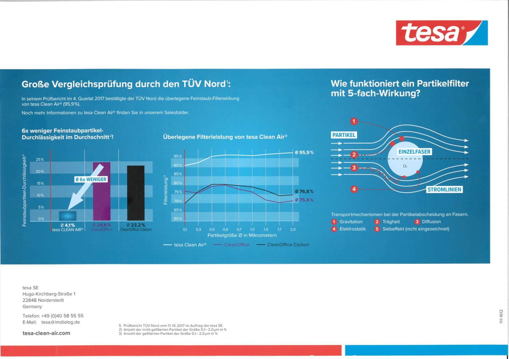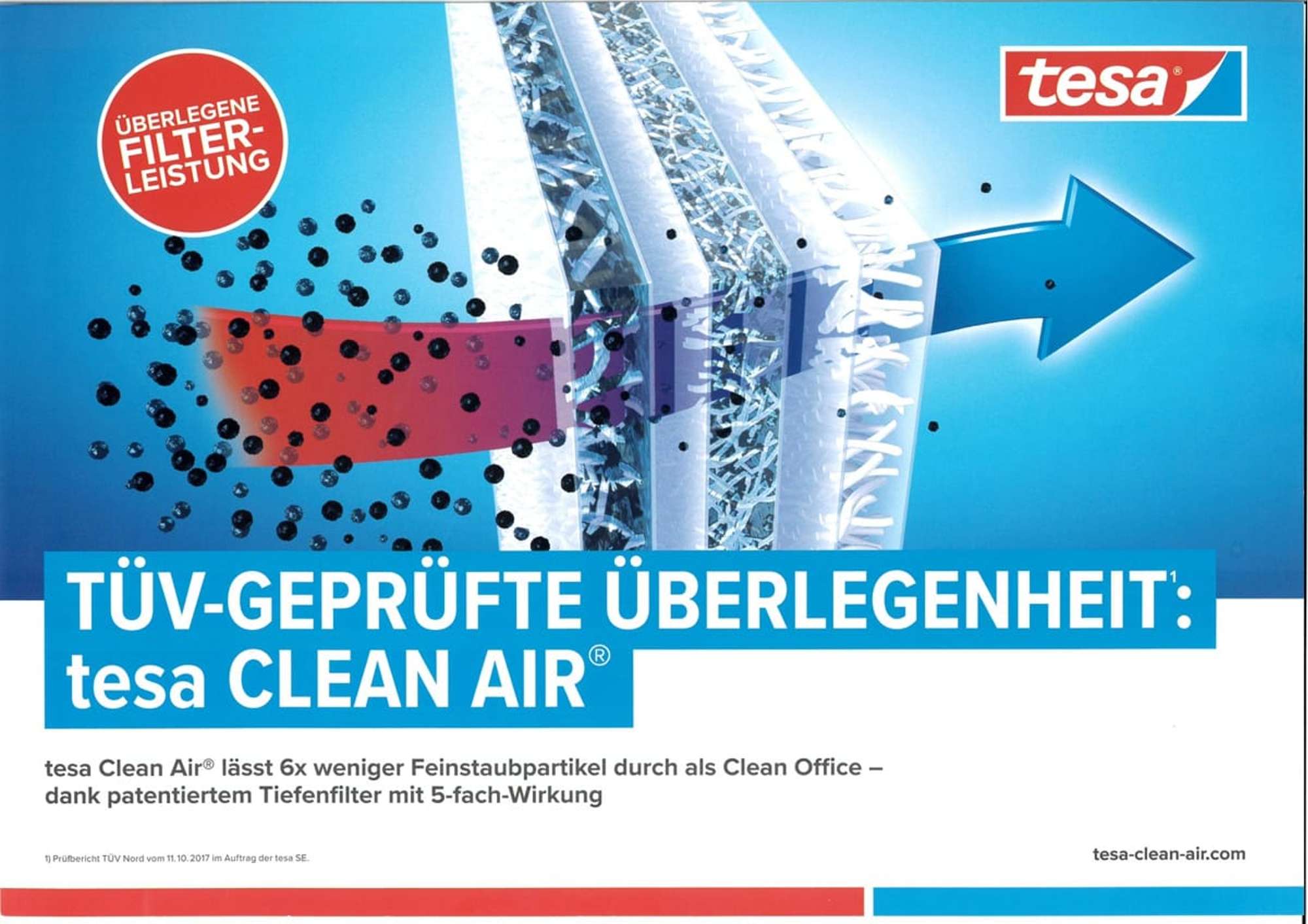 Der Feinstaubfilter, den tesa® gemeinsam mit dem Filterproduzenten Freudenberg entwickelt hat, reduziert die Feinstaubemission deutlich und sorgt für eine gesündere Raumluft. Die Wirksamkeit des Filters wurde von der TÜV Nord AG zertifiziert.