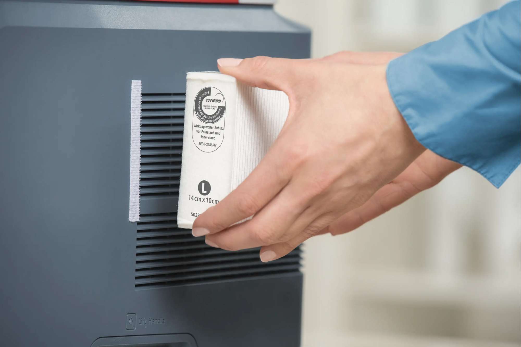Hätten Sie es gewusst? Manche Drucker sondern soviel Feinstaub ab, dass die Belastung der Luft stärker ist als an einer durchschnittlich befahrenen Autobahn. tesa Clean Air® ist ein effizienter Druckerfilter, der bis zu 94% aller Feinstaubpartikel zurückhält. Er besteht aus einem dreilagigen Spezialvlies, lässt sich mit einem Klettsystem komfortabel befestigen, sorgt für einen langfristigen Schutz und kann mit dem Hausmüll entsorgt werden. Der Feinstaubfilter eignet sich für alle Laserdrucker mit einer zentralen Lüftung. Der Drucker funktioniert natürlich weiterhin ohne Einschränkungen.