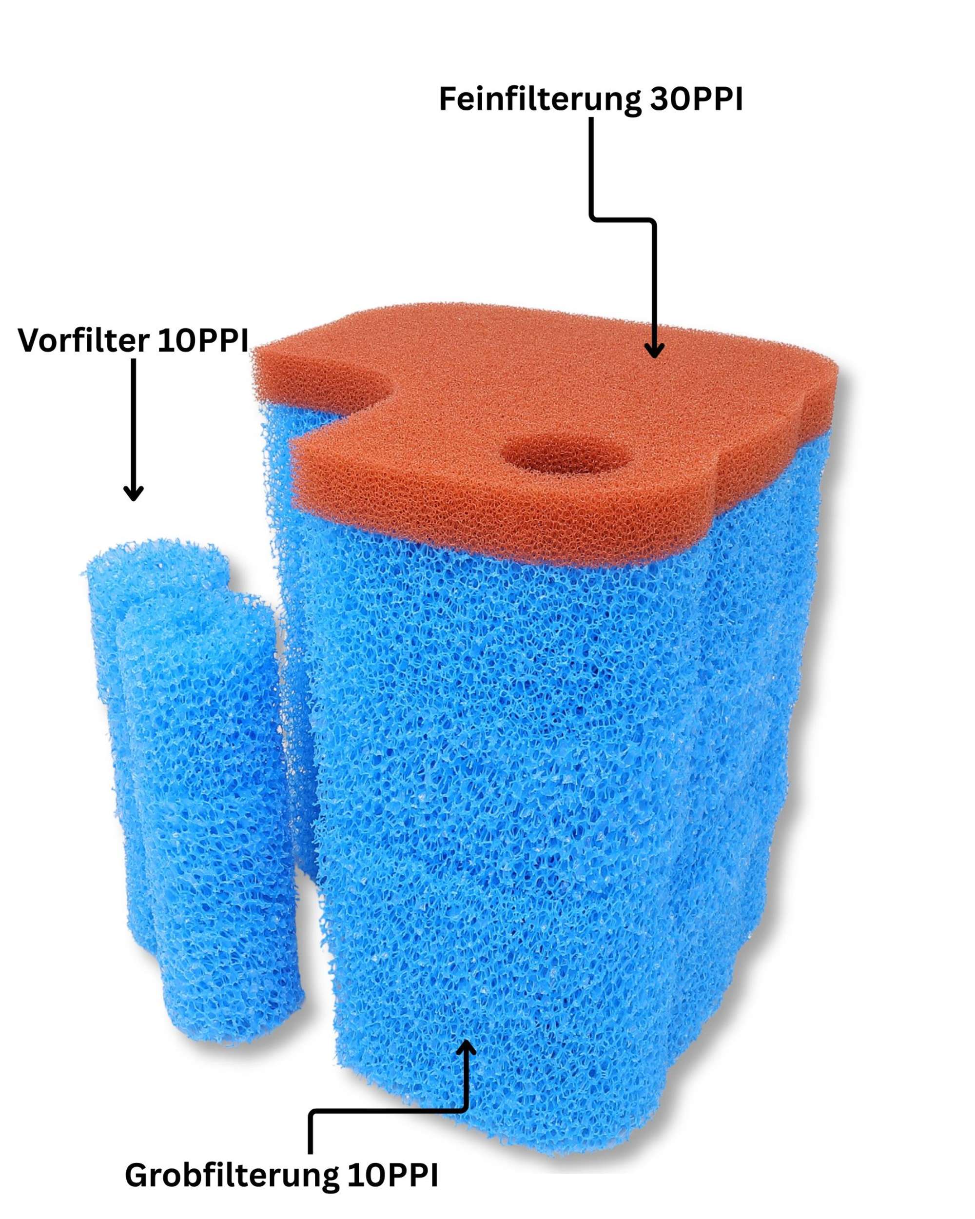 Das Set besteht aus Hauptfilterschwämmen in verschiedenen Porendichten sowie runden Vorfilterschwämmen für das EasyClean-Modul. Die Schwämme ermöglichen eine kombinierte mechanische und biologische Filterung, indem sie grobe und feine Schmutzpartikel zurückhalten und gleichzeitig die Ansiedlung nützlicher Bakterien fördern.
