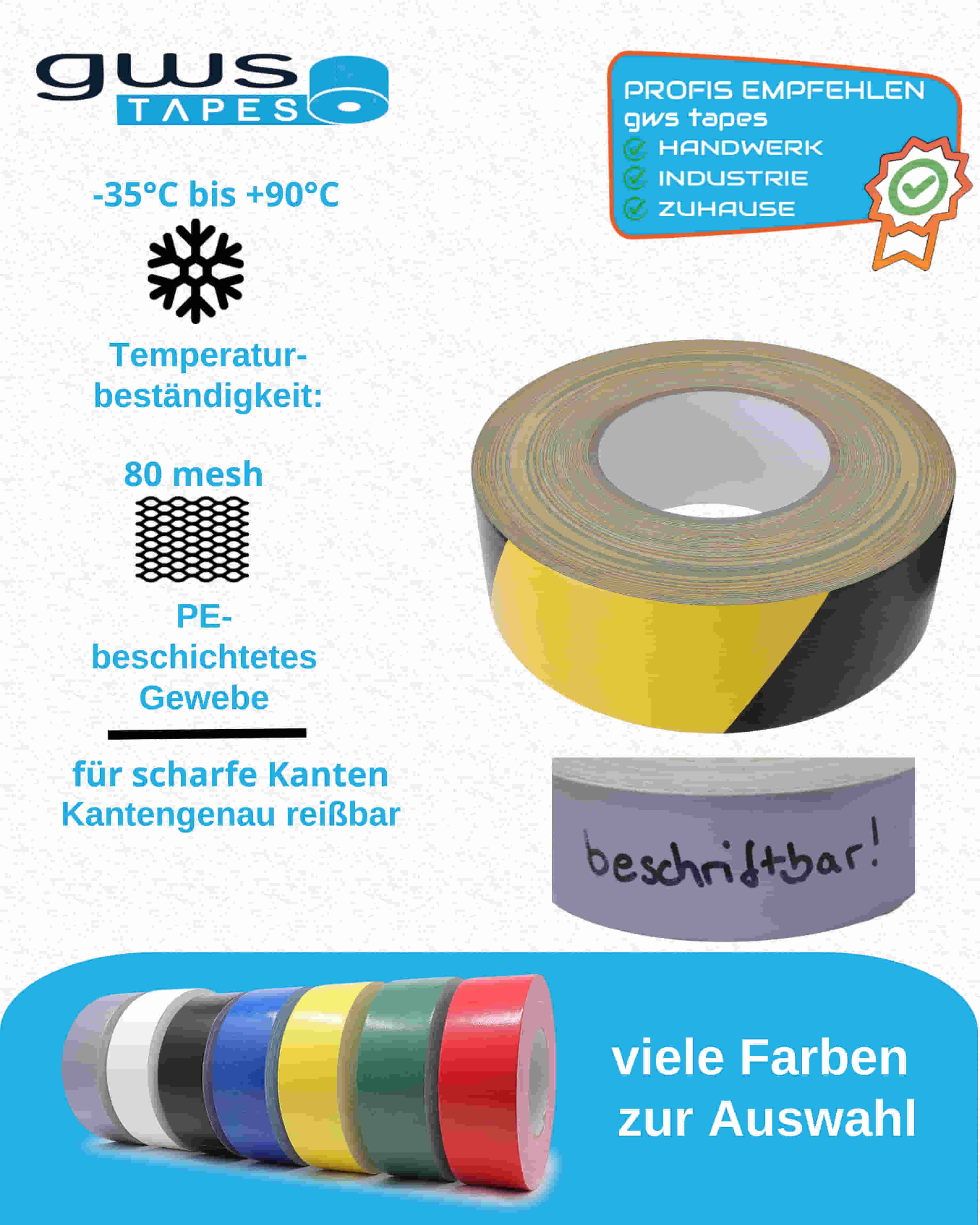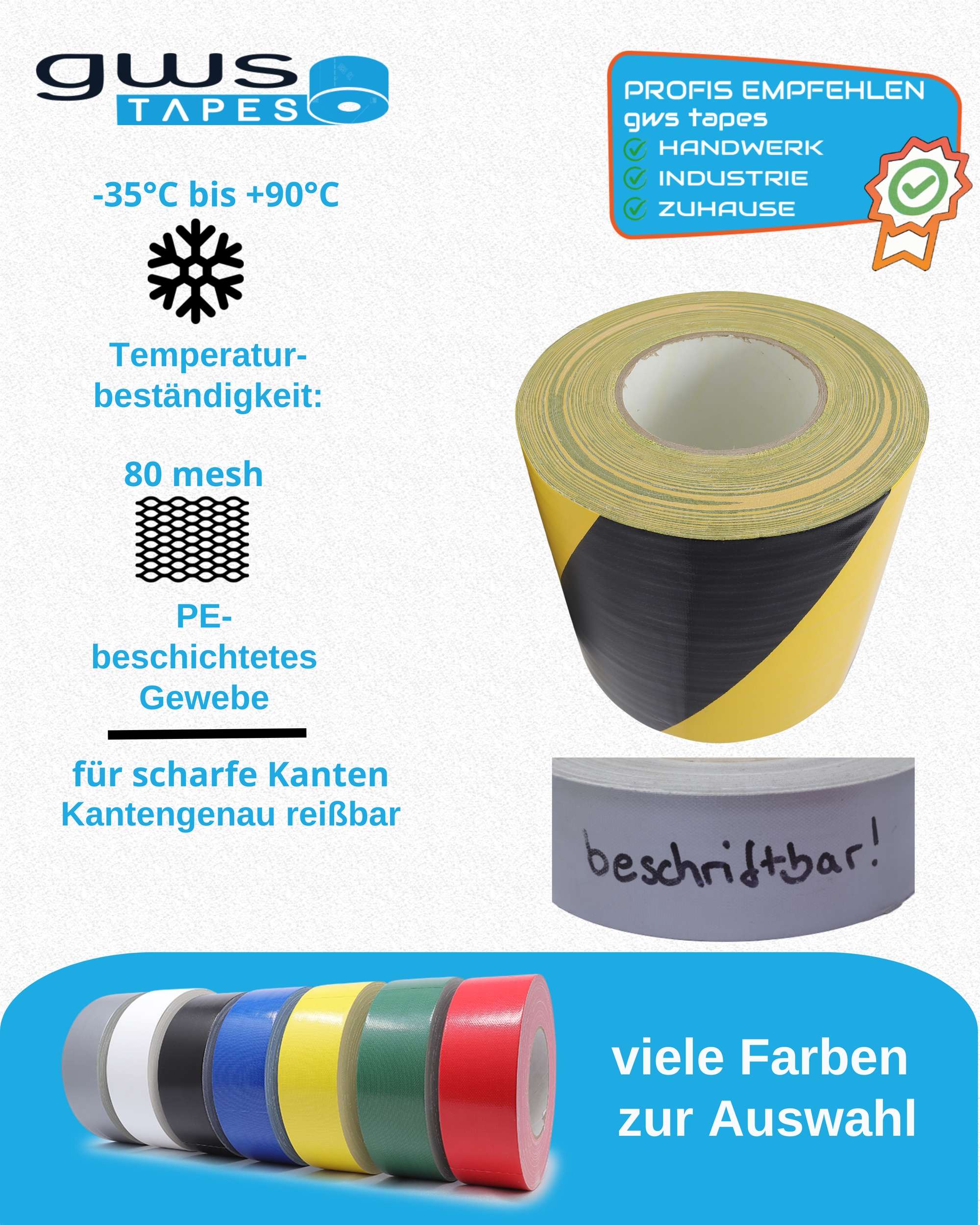 - PREMIUM QUALITÄT: Das hochwertige gws Premium Gewebeband begeistert mit seiner hohen Beständigkeit und seiner erstklassigen Klebkraft. Durch seine Beschriftbarkeit eignet es sich auch hervorragend als Markierungsband. Wählen Sie zwischen verschiedenen Farben und Längen/Breiten!