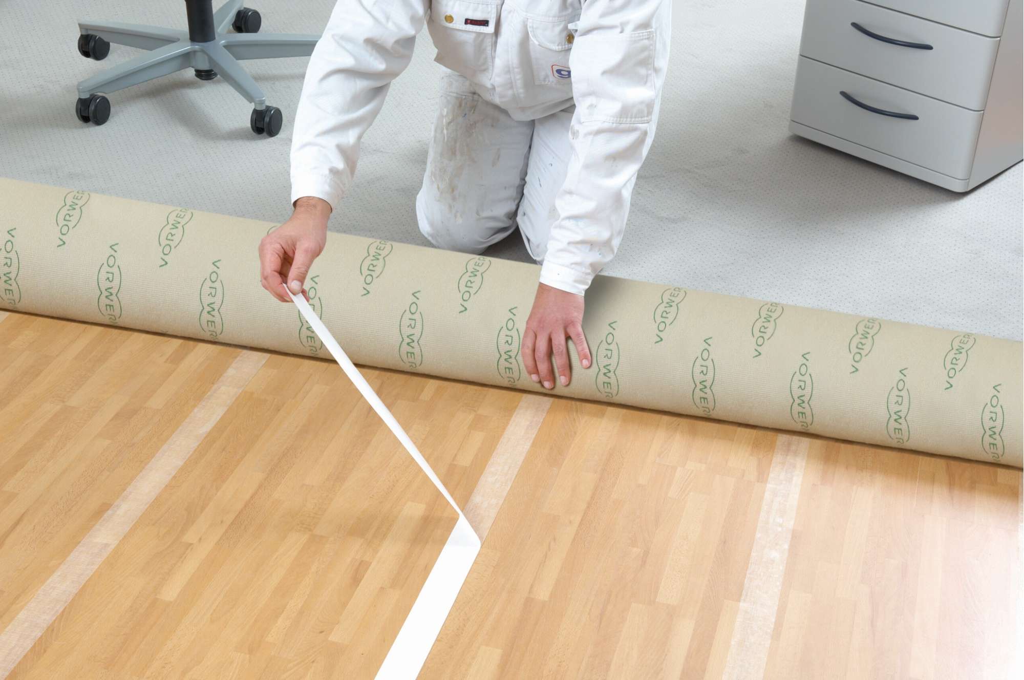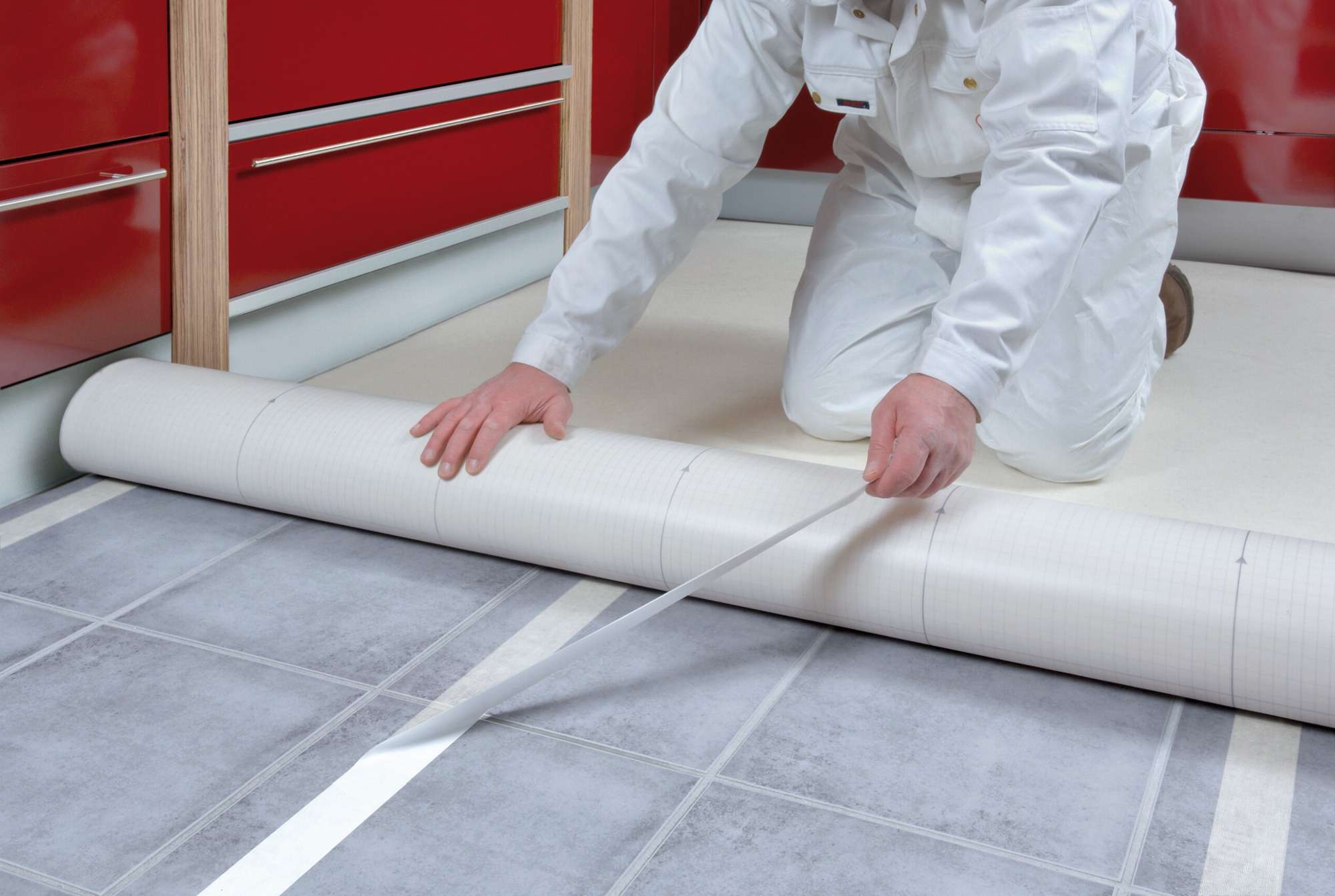 - Gemäß der DIN 18365 muss der Untergrund eben, festliegend, sauber, dauertrocken sowie frei von Fett- oder Wachsschichten sein. (Nicht geeignet für Naturstein)