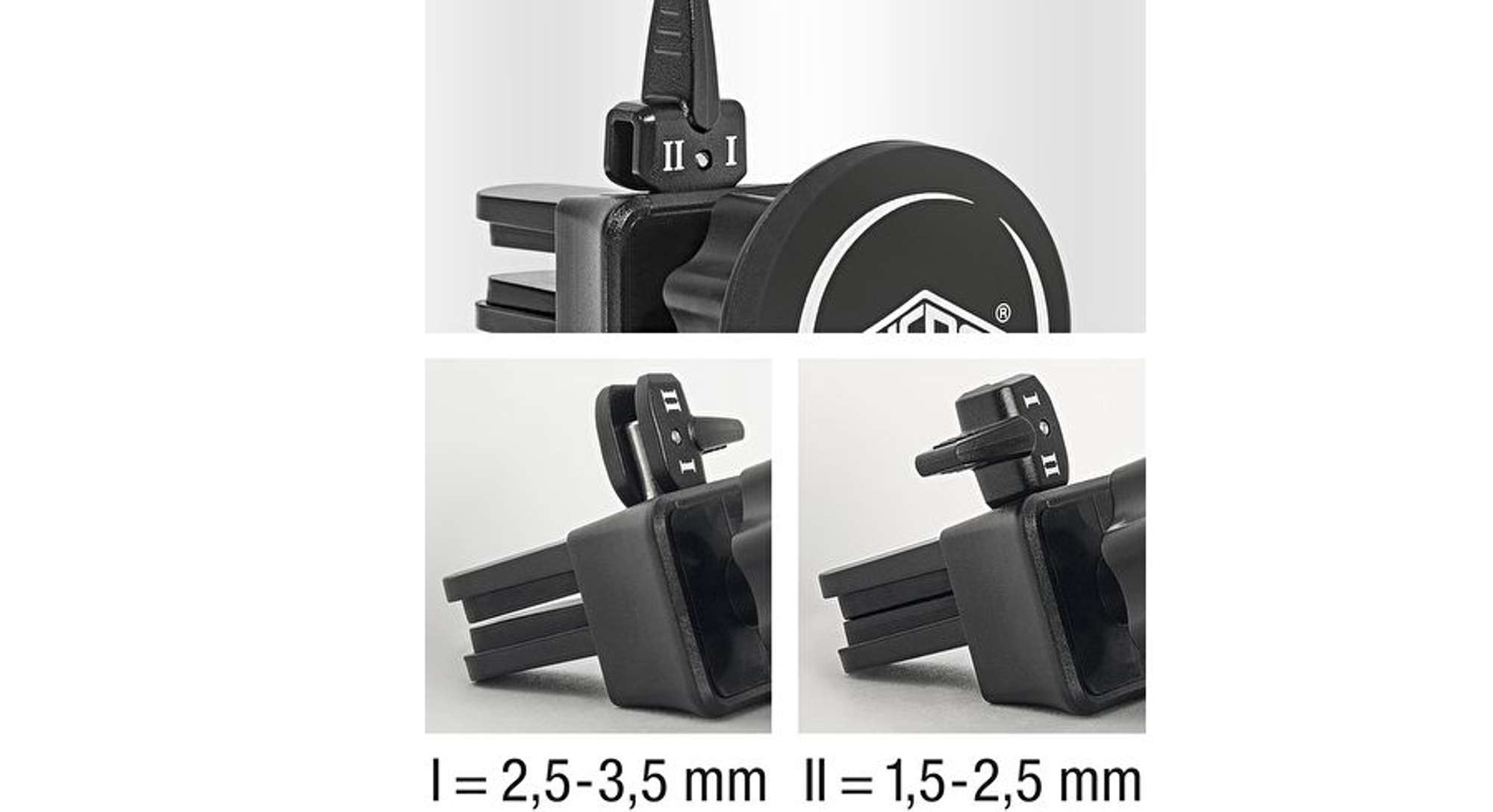 Schnell anzubringen – der gummierte Stecker mit Kippschalter lässt sich in 2 Stufen (1,5 - 2,5 mm und 2,5 - 3,5 mm) auf die Dicke der Lüftungslamelle einstellen und sorgt so für eine sichere und stabile Fixierung der Smartphone-Halterung.