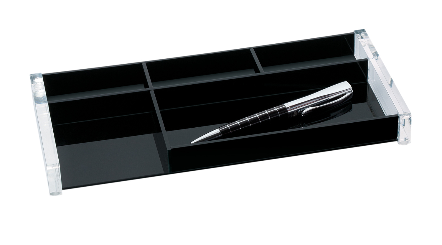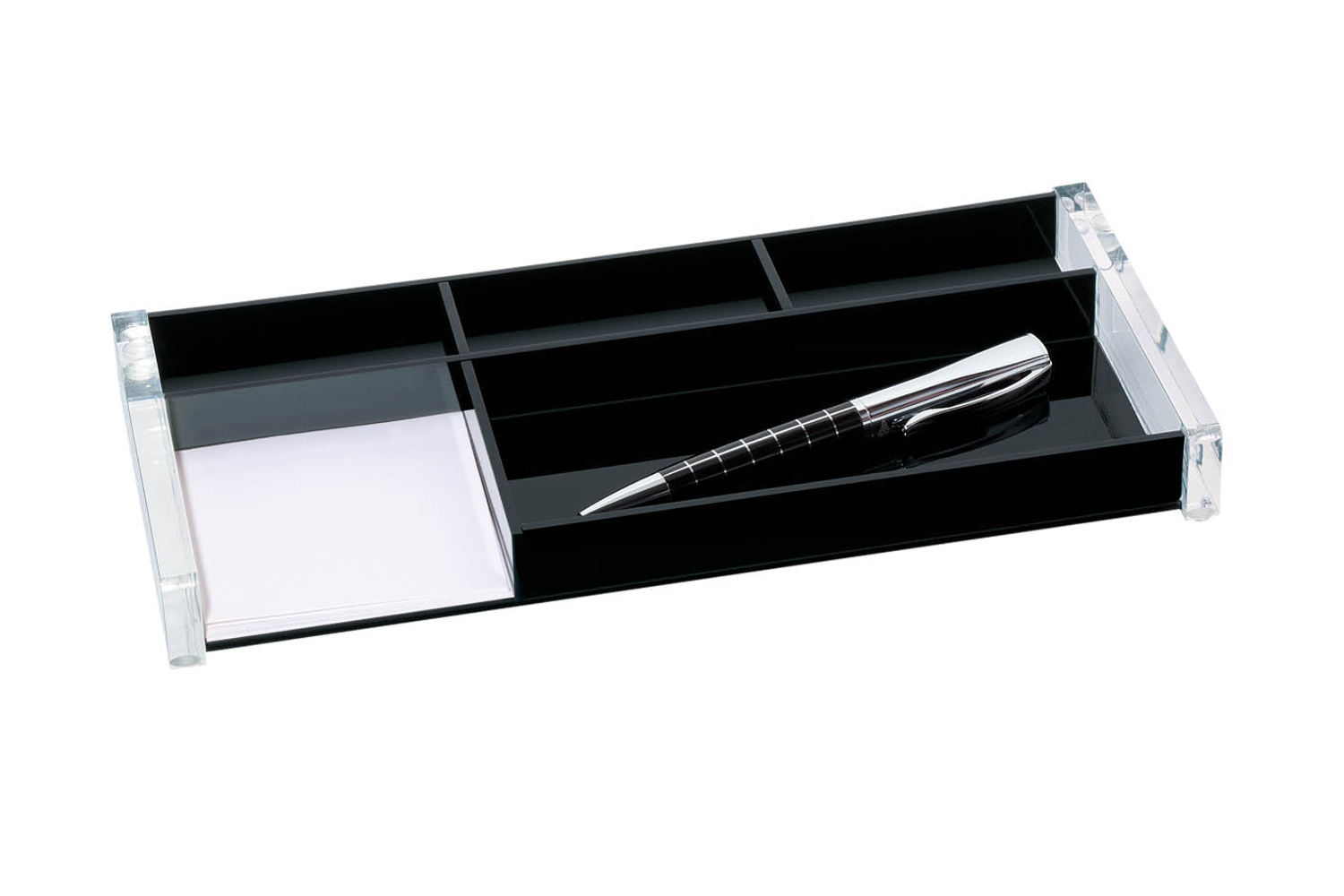 WEDO Acryl-Stiftschale, hochwertiges Accessoire aus der Schreibtischserie Acryl Exklusiv. Glasklares Acryl kombiniert mit tiefem Schwarz und das innovative Design verleihen diesen Accessoires eine kühle Eleganz mit außergewöhnlicher Optik. Ein Schmuckstück auf dem modernen Schreibtisch. Neben einem großen Stiftfach bietet die Stiftschale mit einem Fach für Haftnotizblocks (76 x 76 mm) und drei Sammelfächern viel Platz für weitere Utensilien. Maße: 27,0 x 12,5 x 3,0 cm. Lieferung im attraktiven Geschenkkarton.