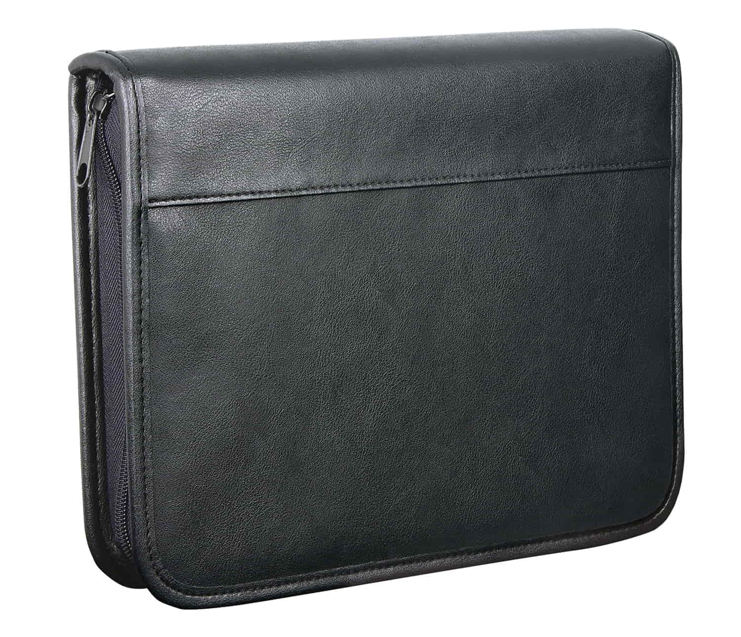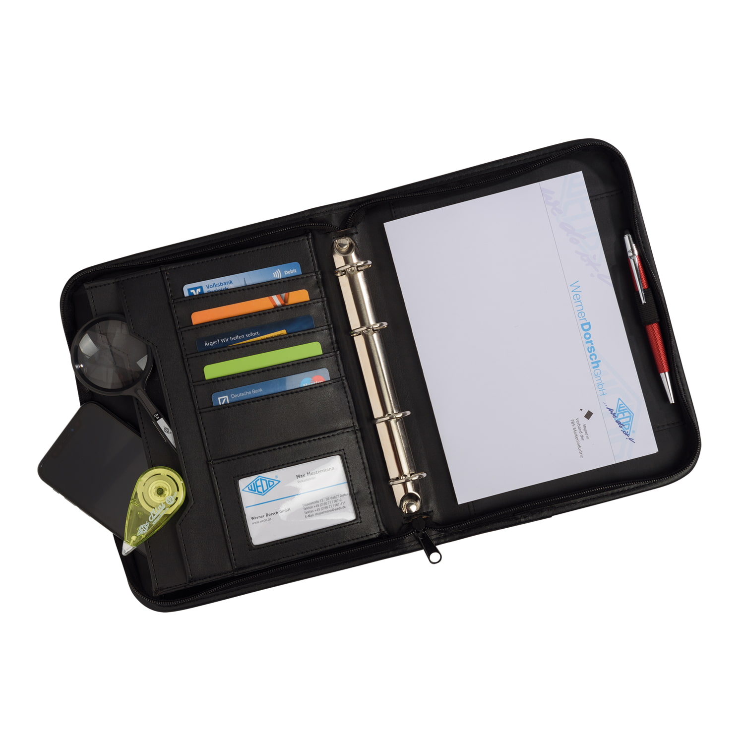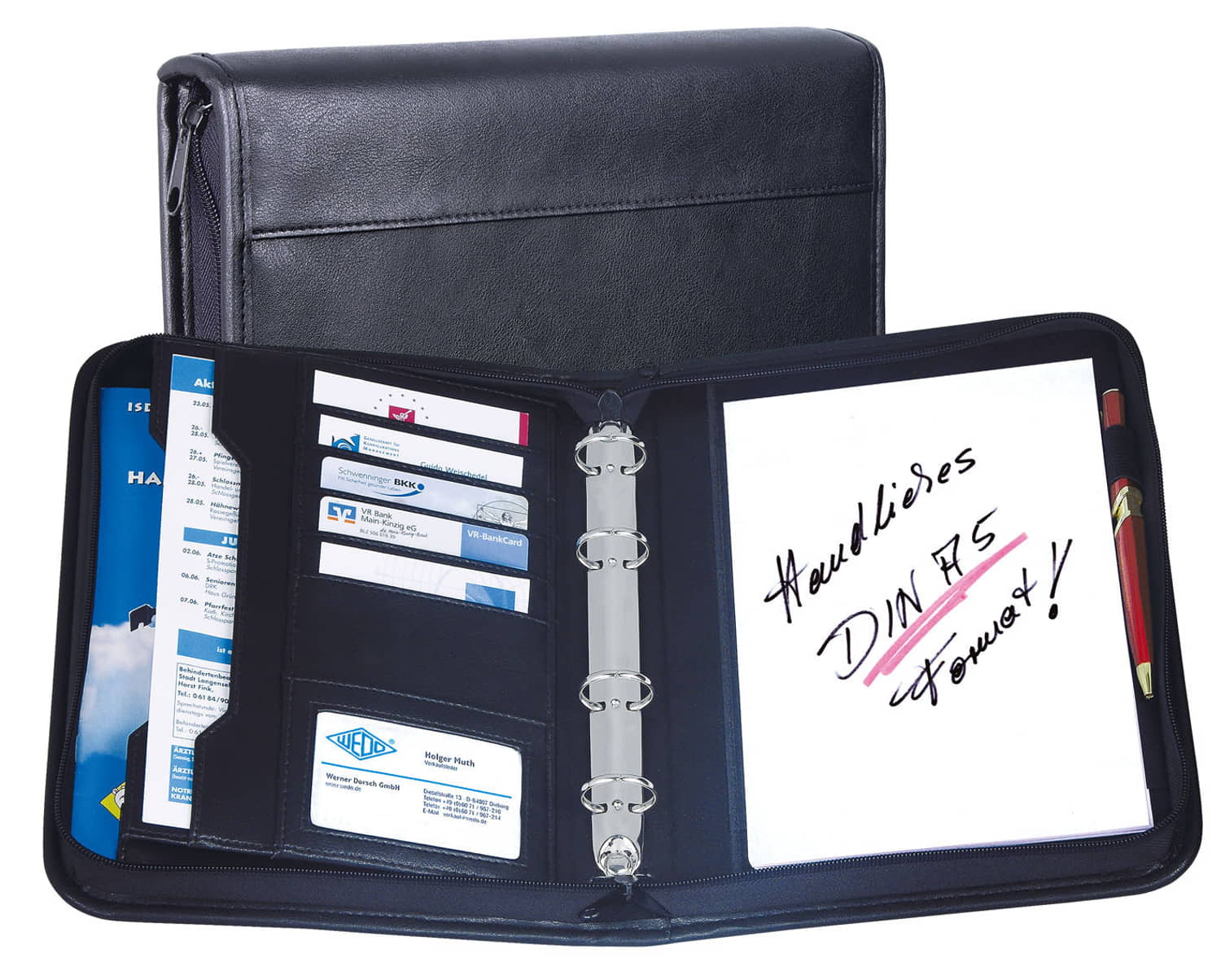 WEDO Collegemappe DIN A5. Diese kompakte, handliche Mappe aus hochwertigem, genarbtem Kunstleder ist mit einer 4-Ring-Mechanik (Ø 30 mm, Füllhöhe 20 mm) und einem Einsteckfach für einen DIN A5-Schreibblock ausgestattet. Sie verfügt darüber hinaus über eine Stiftschlaufe, fünf Kartenfächer, ein Sichtfenster für Visitenkarten, ein Einsteckfach A5 sowie ein großes Faltfach. Die Mappe wird mit einem umlaufenden Reißverschluss verschlossen und eignet sich damit besonders für handelsübliche Kalendereinlagen und Zeitplansysteme. Maße: ca. 260 x 45 x 200 mm, Farbe: schwarz, einzeln verpackt im Karton.