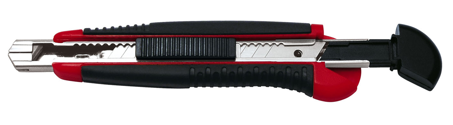 WEDO Auto-Load Profi-Cutter, 9 mm, mit automatischem Klingentausch aus integriertem Magazin. Robustes Abbrechmesser aus ABS-Kunststoff mit komfortablem, rutschsicher gummiertem Griff. Klingenführung aus Metall. Mit Rastervorschub und Auto-Stop. Automatischer Klingentausch aus dem integrierten Klingenmagazin für 5 Klingen. Dazu wird der Schieber ganz nach vorne geschoben und die verbrauchte Klinge schräg nach oben entnommen. Durch das erneute Zurück- und Vorschieben ist die neue Klinge automatisch geladen. Lieferung in farbig bedruckter Kartonverpackung mit Hängelochung, inklusive Abbrechhilfe und fünf Klingen. Maße: ca. 14,0 x 1,5 x 3,0 cm, Gewicht: 58 g, Farbe: schwarz/rot