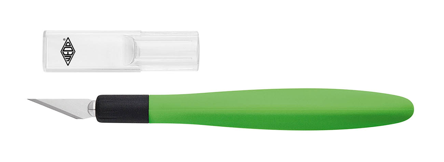 WEDO Skalpell Comfortline mit Softgriff. Das Skalpell Comfortline ist nicht nur ein präzises Werkzeug, das komfortabel in der Hand liegt und sich ausgezeichnet führen lässt, es überzeugt auch durch seine Form und Farbgebung. Der dreieckig geformte Messerschaft hat eine samtige Haptik und bringt in trendigem Apfelgrün Farbe auf den Arbeitstisch. Die spitze, extrem scharfe Klinge ist ideal für feine Schneidearbeiten. Zur sicheren Aufbewahrung immer die Schutzkappe aufstecken. Maße: 16,5 x 1,8 x 1,8 cm, Länge ohne Schutzkappe 15 cm, Farbe: apfelgrün/schwarz. Lieferung auf SB-Karte mit 5 Ersatzklingen.