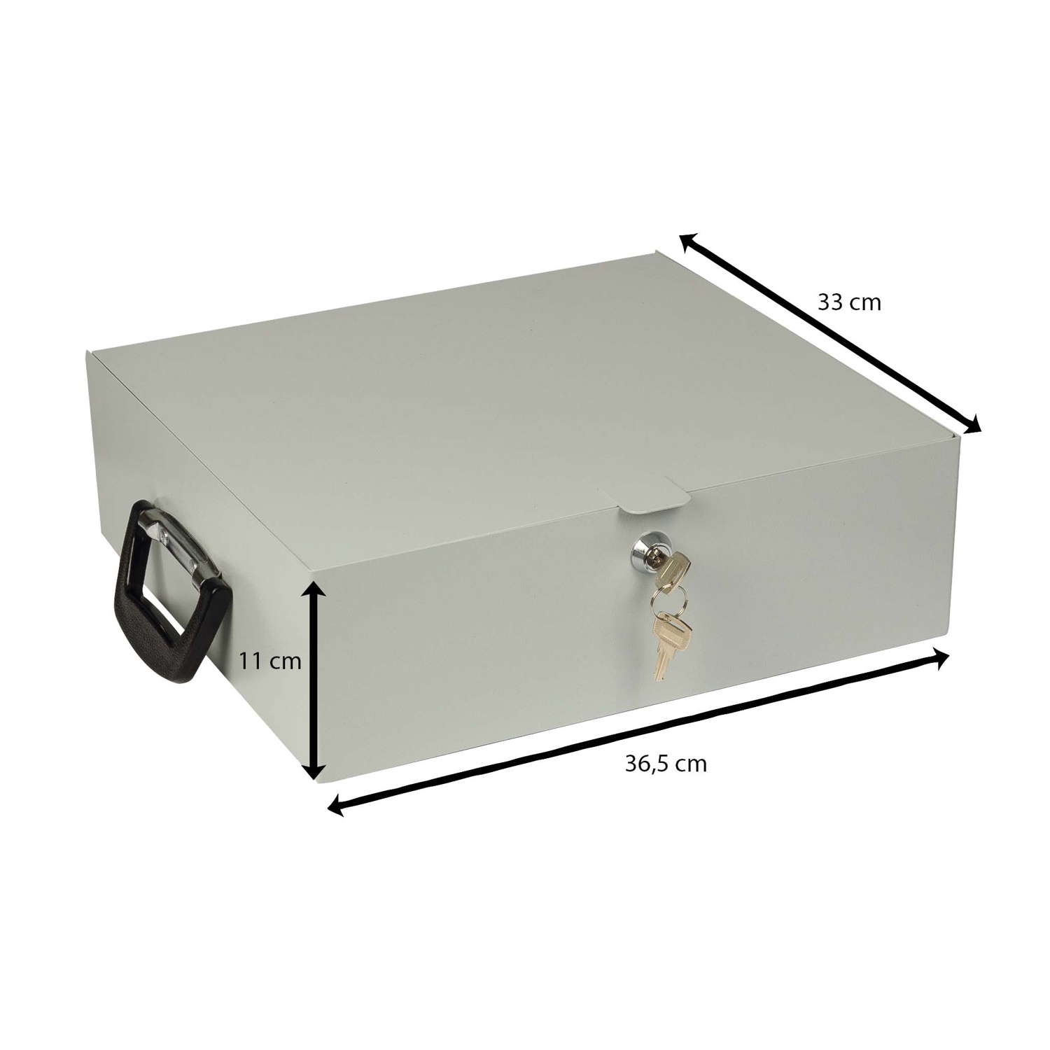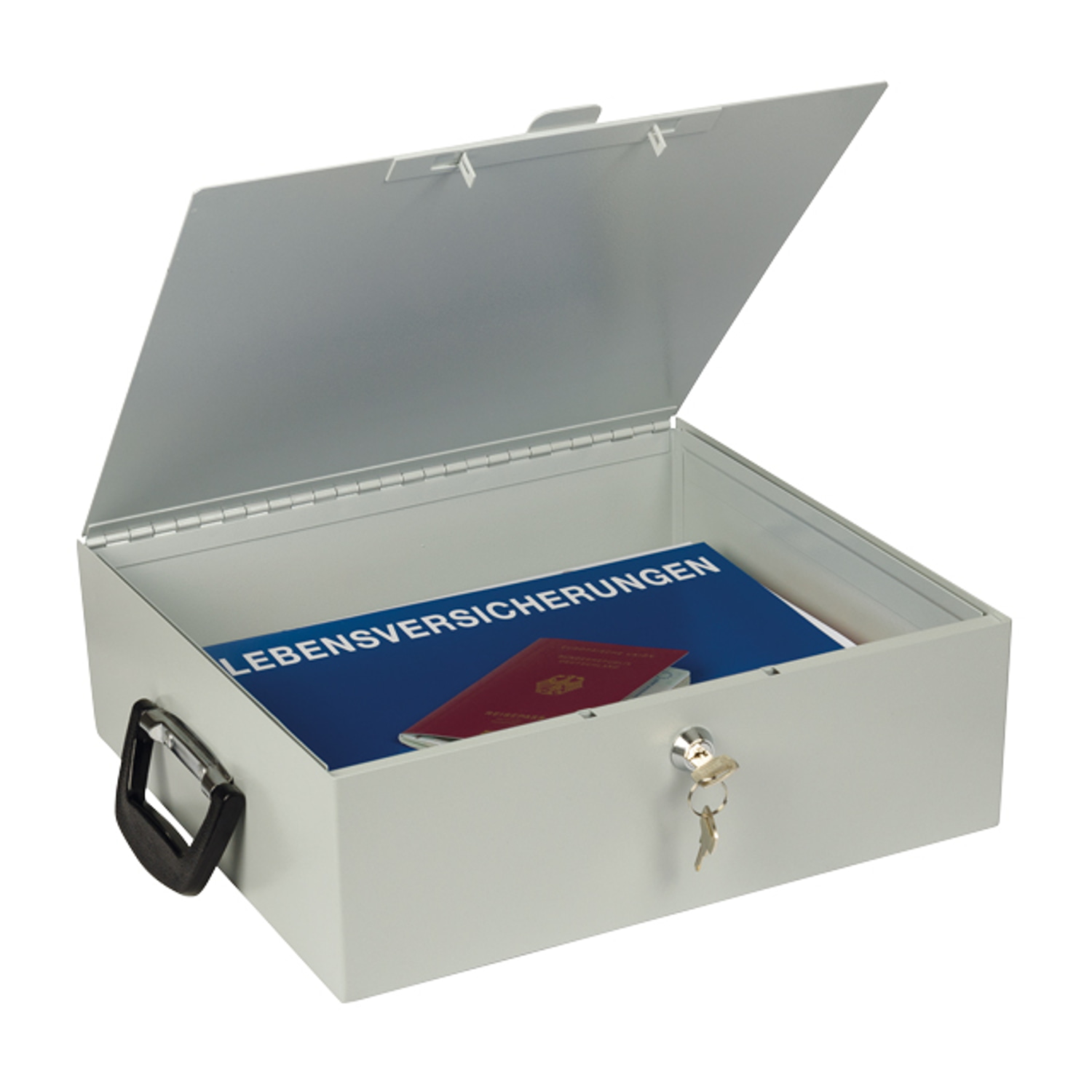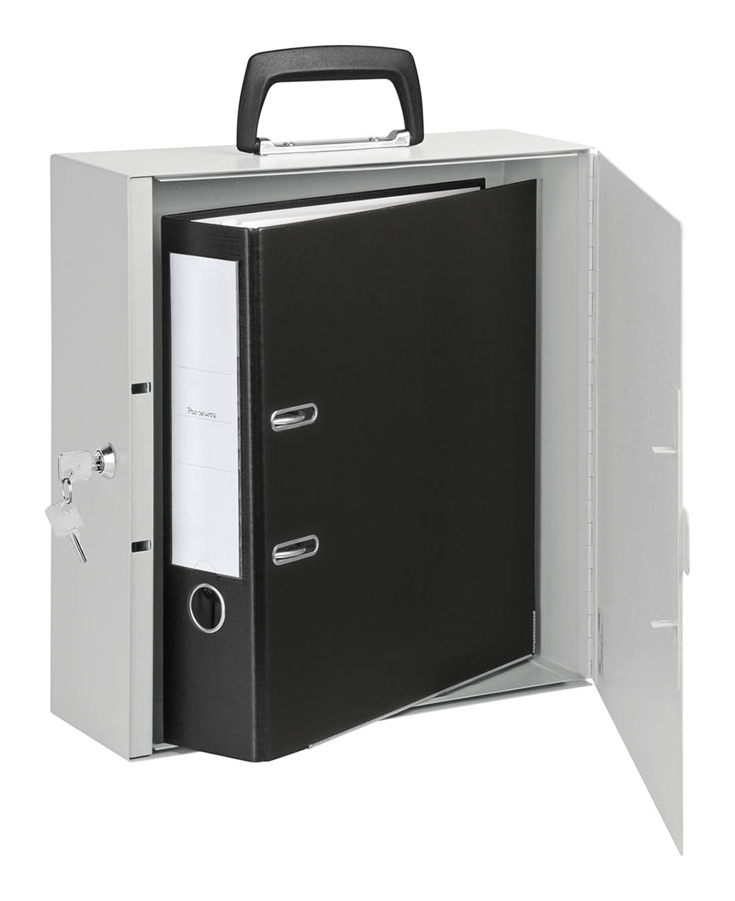 WEDO Ordner-Metallkassette, lichtgrau. Nimmt DIN A4 Ordner sicher in Verwahrung. Gefertigt aus pulverbeschichtetem Stahlblech mit mattierter, unempfindlicher Oberfläche und mit einem Koffergriff ausgestattet. Sicherheitsschloss auf der Längsseite mit zwei Schlüsseln, deren Nummer auf dem Schloss eingraviert ist. Maße: 36,5 x 33,0 x 11,0 cm, Innenmaße: 34,0 x 30,4 x 11,0 cm.