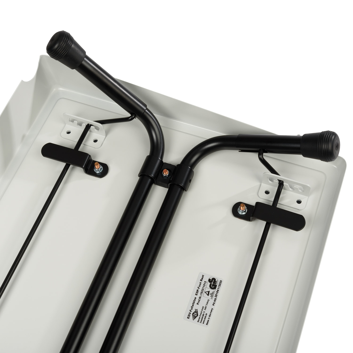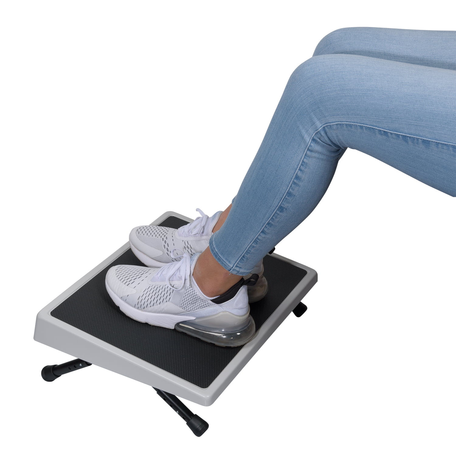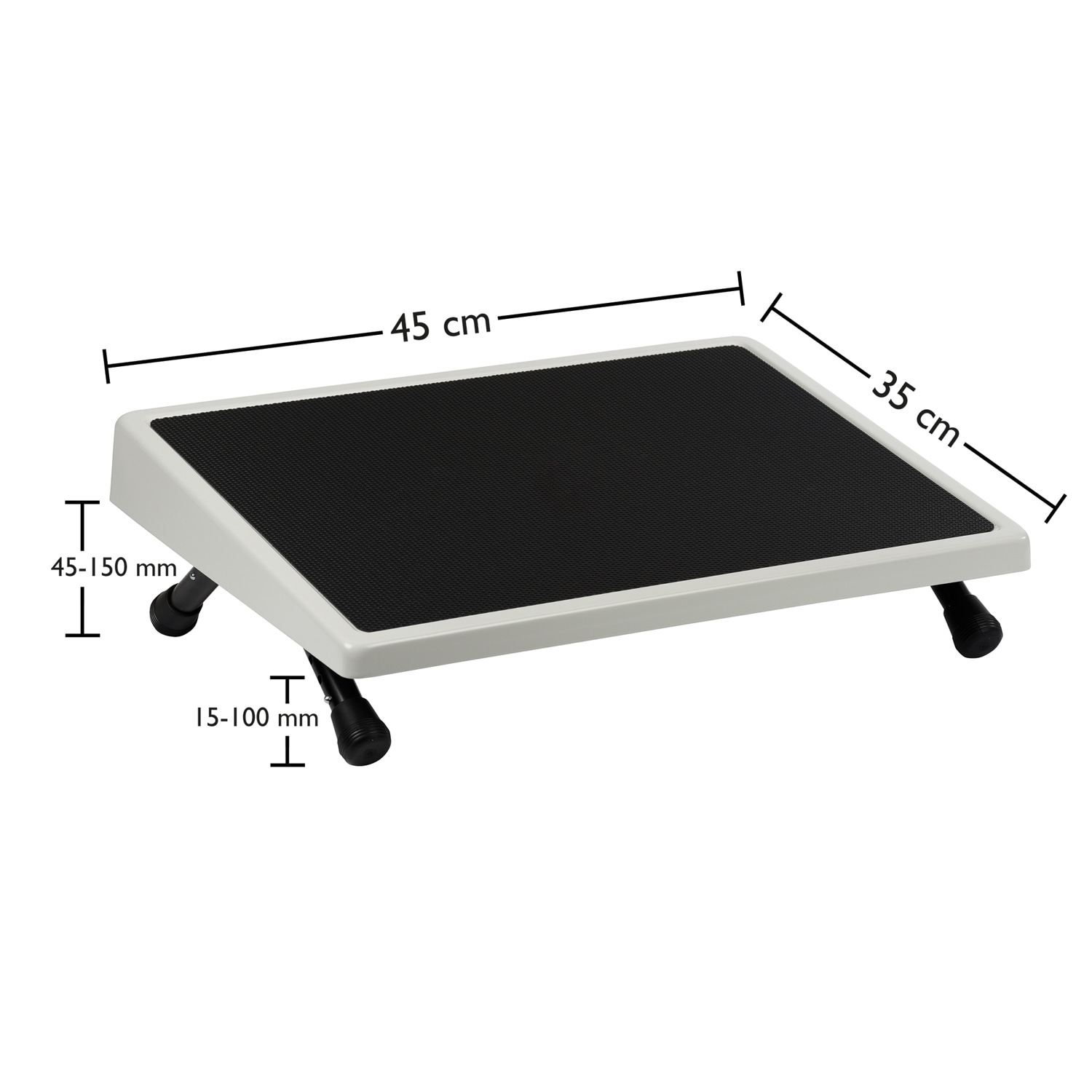 WEDO EDV Fußstütze. Eine stabile Konstruktion aus gezogenem Stahlblech mit abgerundeten Kanten. Die Trittfläche ( 45,0 x 35,0 cm) ist mit einem rutschfesten Gummibelag versehen. Die Neigung ist in vier Höhenstufen individuell einstellbar. Dicke Gummifüße garantieren gute Standfestigkeit. Entspricht DIN 4556, TÜV- und GS-geprüft, 3 Jahre Garantie. Höhen vorne 30 - 110 mm, hinten 60 - 175 mm. Farbe: lichtgrau (RAL 7035).