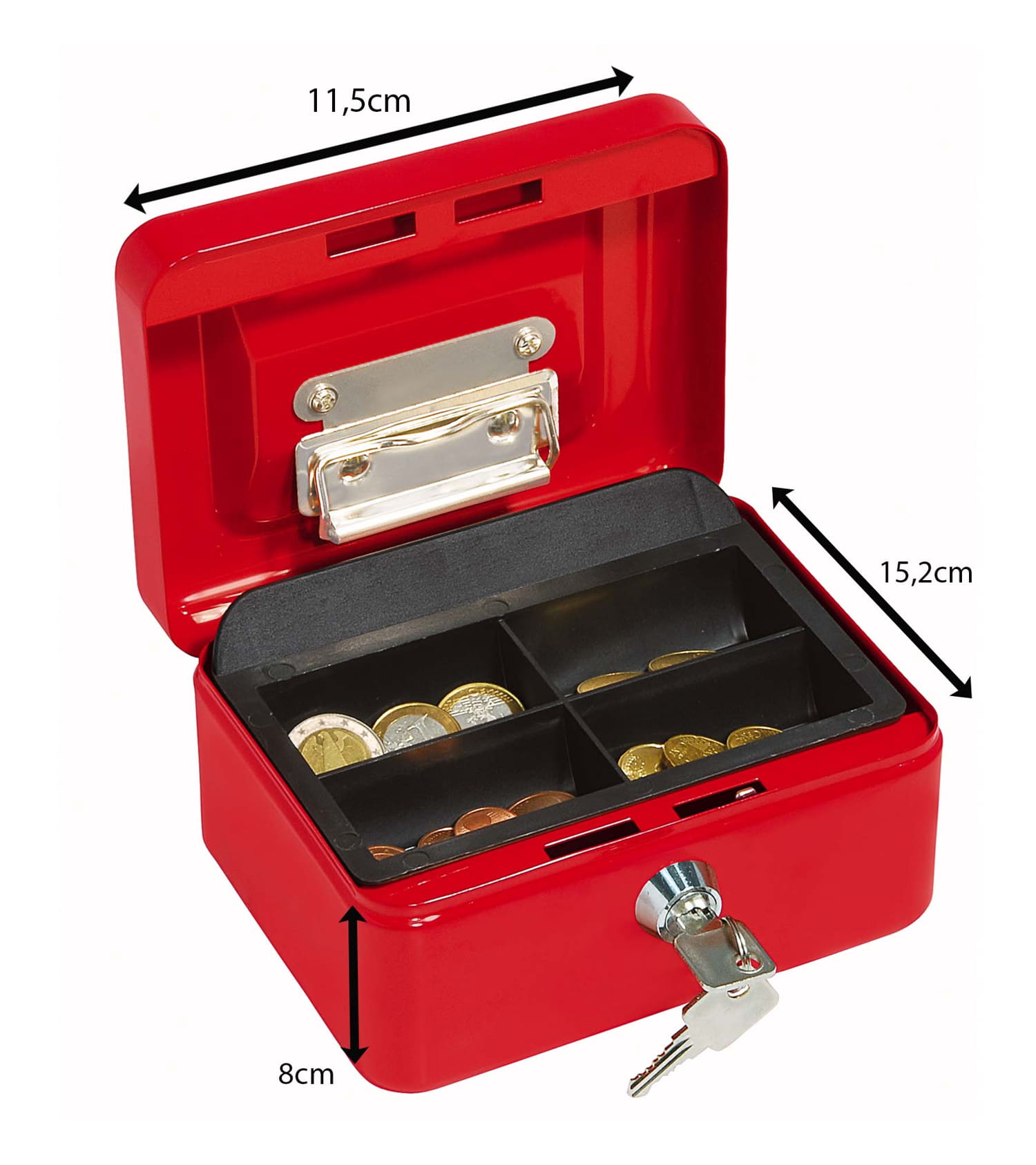 WEDO Geldkassette mit Geldnoten- und Belegklammer, Größe 1, rot. Die Geldkassetten der H-Serie bieten einen zusätzlichen praktischen Vorteil: Die im Innendeckel angebrachte Beleg- und Geldscheinklammer sammelt z.B. Tagesbelege, hält Scheine beim Kassieren etc. Die Geldkassetten sind aus nahtlos gezogenem Stahl mit Pulverbeschichtung gefertigt und mit einem versenkbaren Tragegriff, einem Münzeinsatz aus Kunststoff mit 4 Fächern sowie einem Sicherheits-Zylinderschloss mit 2 Schlüsseln ausgestattet. Die Schlüsselnummer ist auf dem Schloss eingraviert. Maße: 15,2 x 11,5 x 8,0 cm.