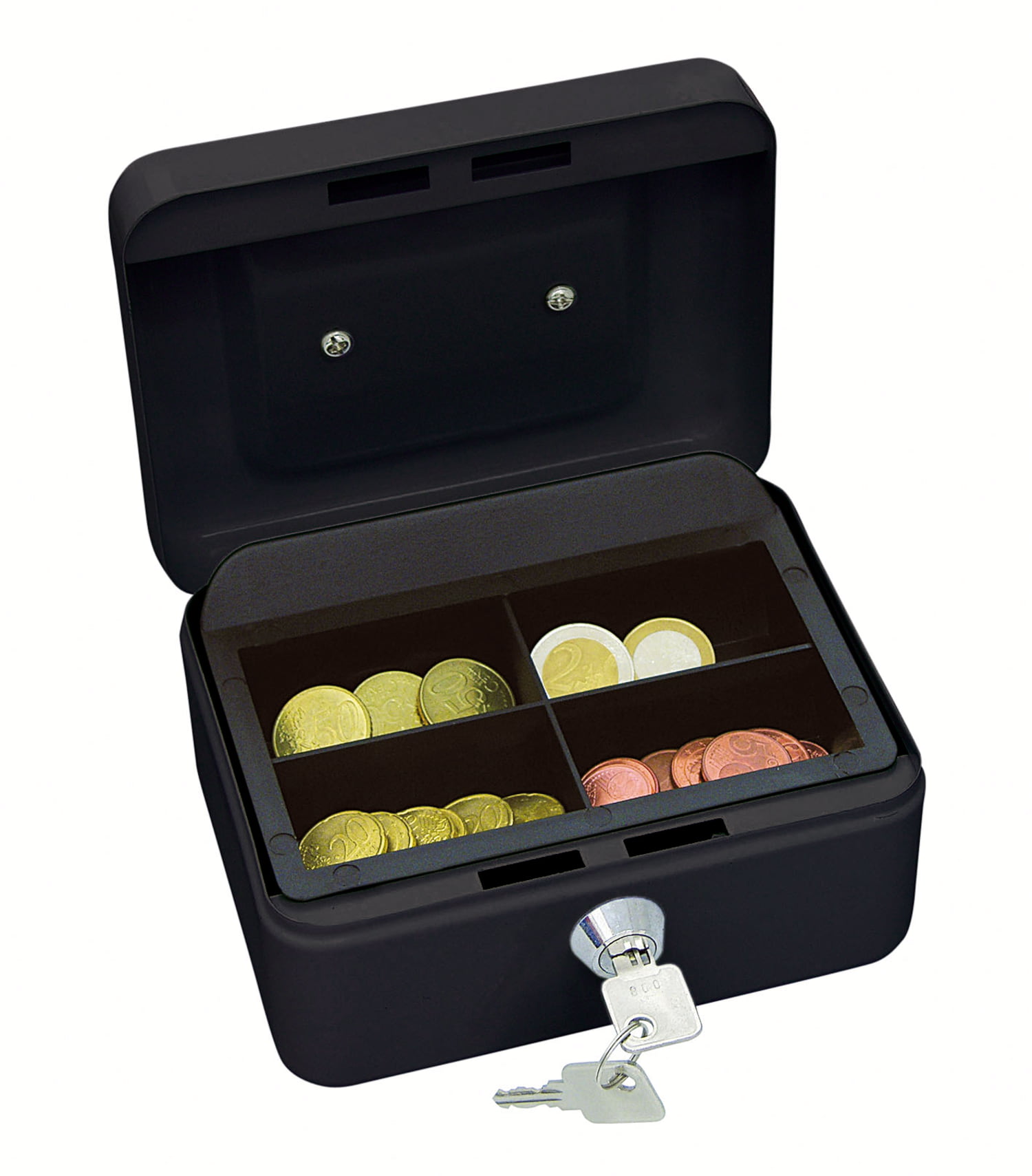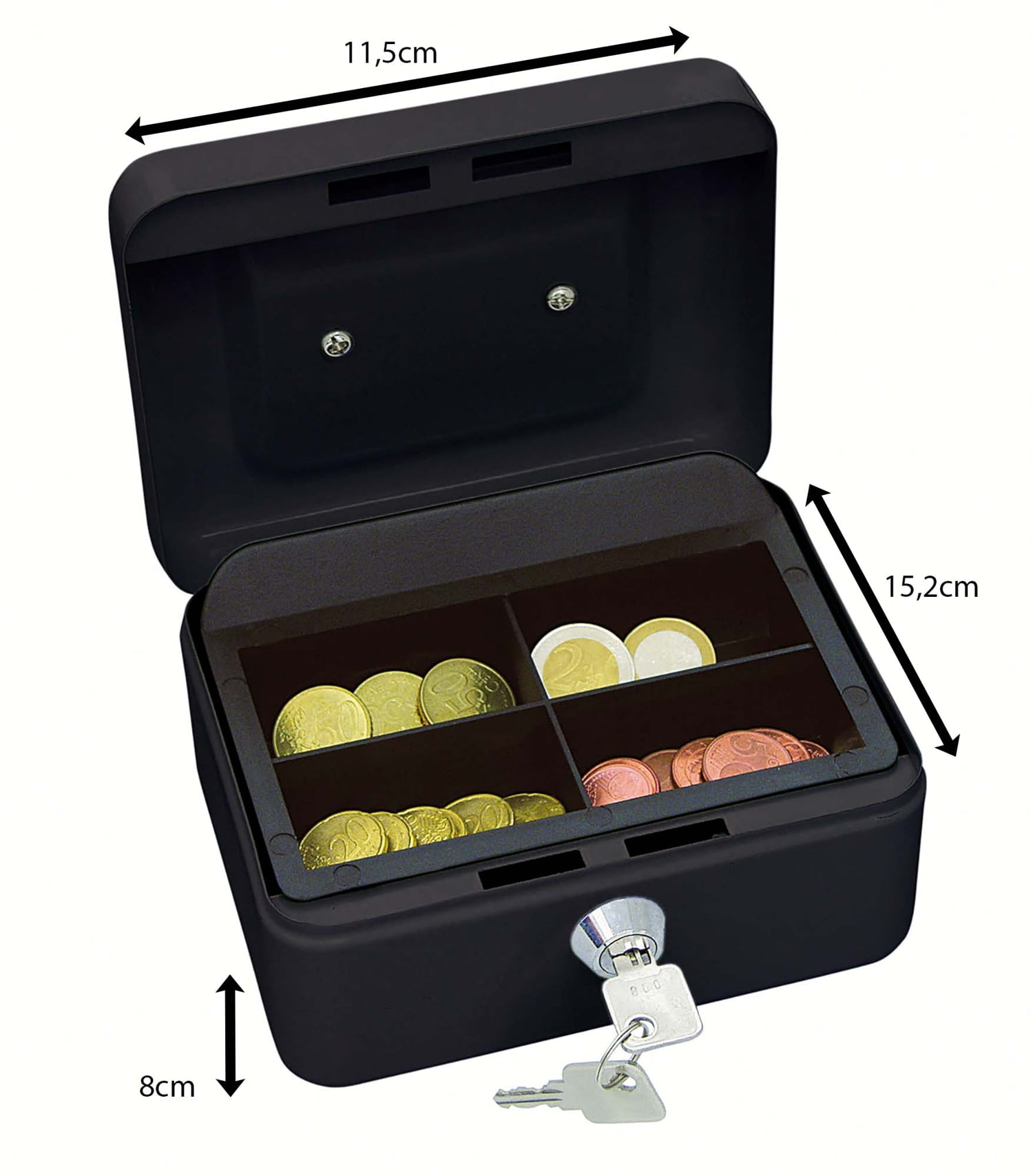 WEDO Geldkassette, Größe 1, schwarz. Die Geldkassetten sind aus nahtlos gezogenem Stahl mit Pulverbeschichtung gefertigt und mit einem versenkbaren Tragegriff, einem Münzeinsatz aus Kunststoff mit 4 Fächern sowie einem Sicherheits-Zylinderschloss mit 2 Schlüsseln ausgestattet. Die Schlüsselnummer ist auf dem Schloss eingraviert. Maße: 15,2 x 11,5 x 8,0 cm.