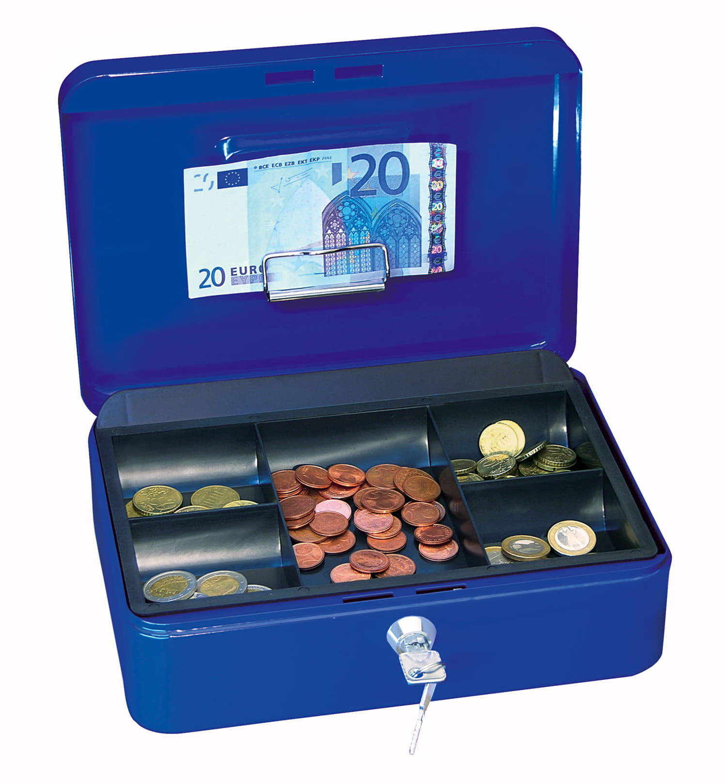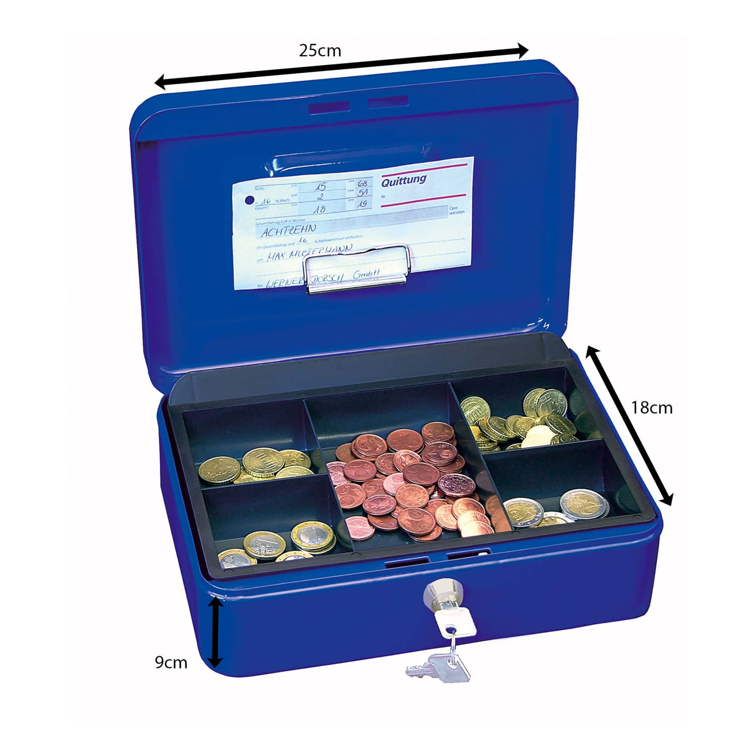 WEDO Geldkassette mit Geldnoten- und Belegklammer, Größe 3, blau. Die Geldkassetten der H-Serie bieten einen zusätzlichen praktischen Vorteil: Die im Innendeckel angebrachte Beleg- und Geldscheinklammer sammelt z.B. Tagesbelege, hält Scheine beim Kassieren etc. Die Geldkassetten sind aus nahtlos gezogenem Stahl mit Pulverbeschichtung gefertigt und mit einem versenkbaren Tragegriff, einem Münzeinsatz aus Kunststoff mit 5 Fächern sowie einem Sicherheits-Zylinderschloss mit 2 Schlüsseln ausgestattet. Die Schlüsselnummer ist auf dem Schloss eingraviert. Maße: 25,0 x 18,0 x 9,0 cm.