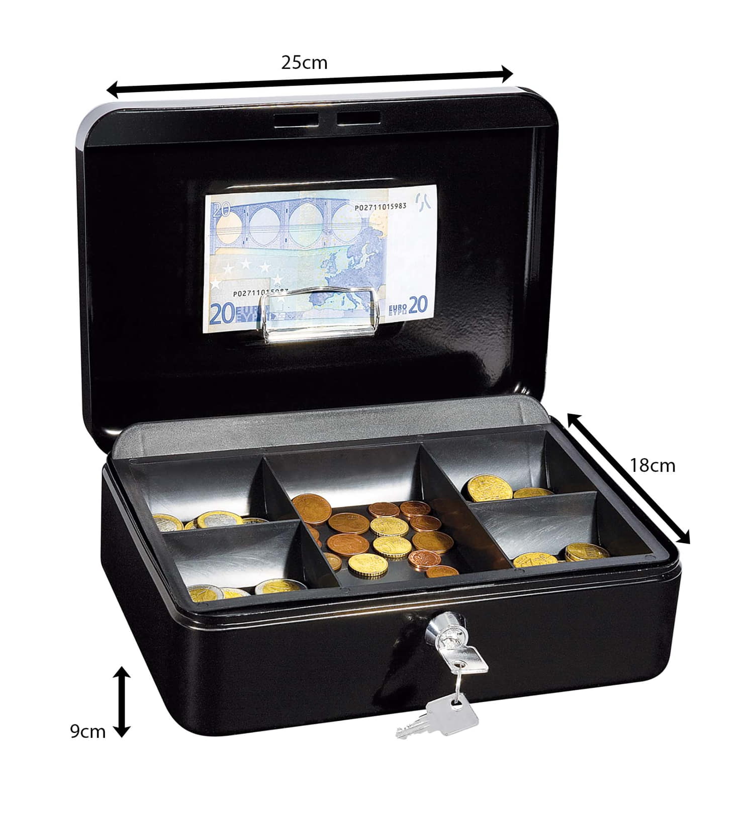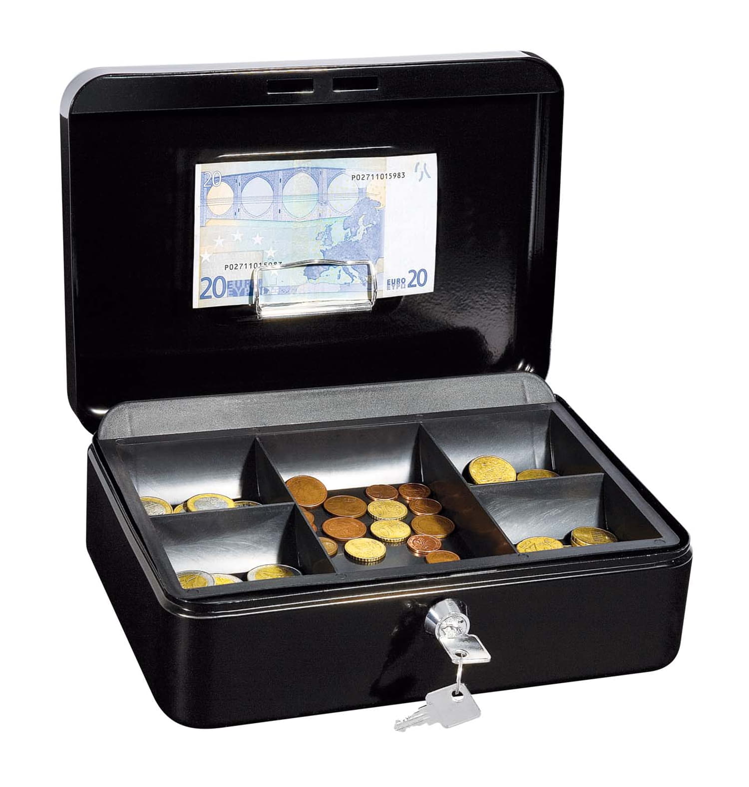 WEDO Geldkassette mit Geldnoten- und Belegklammer, Größe 3, schwarz. Die Geldkassetten der H-Serie bieten einen zusätzlichen praktischen Vorteil: Die im Innendeckel angebrachte Beleg- und Geldscheinklammer sammelt z.B. Tagesbelege, hält Scheine beim Kassieren etc. Die Geldkassetten sind aus nahtlos gezogenem Stahl mit Pulverbeschichtung gefertigt und mit einem versenkbaren Tragegriff, einem Münzeinsatz aus Kunststoff mit 5 Fächern sowie einem Sicherheits-Zylinderschloss mit 2 Schlüsseln ausgestattet. Die Schlüsselnummer ist auf dem Schloss eingraviert. Maße: 25,0 x 18,0 x 9,0 cm.