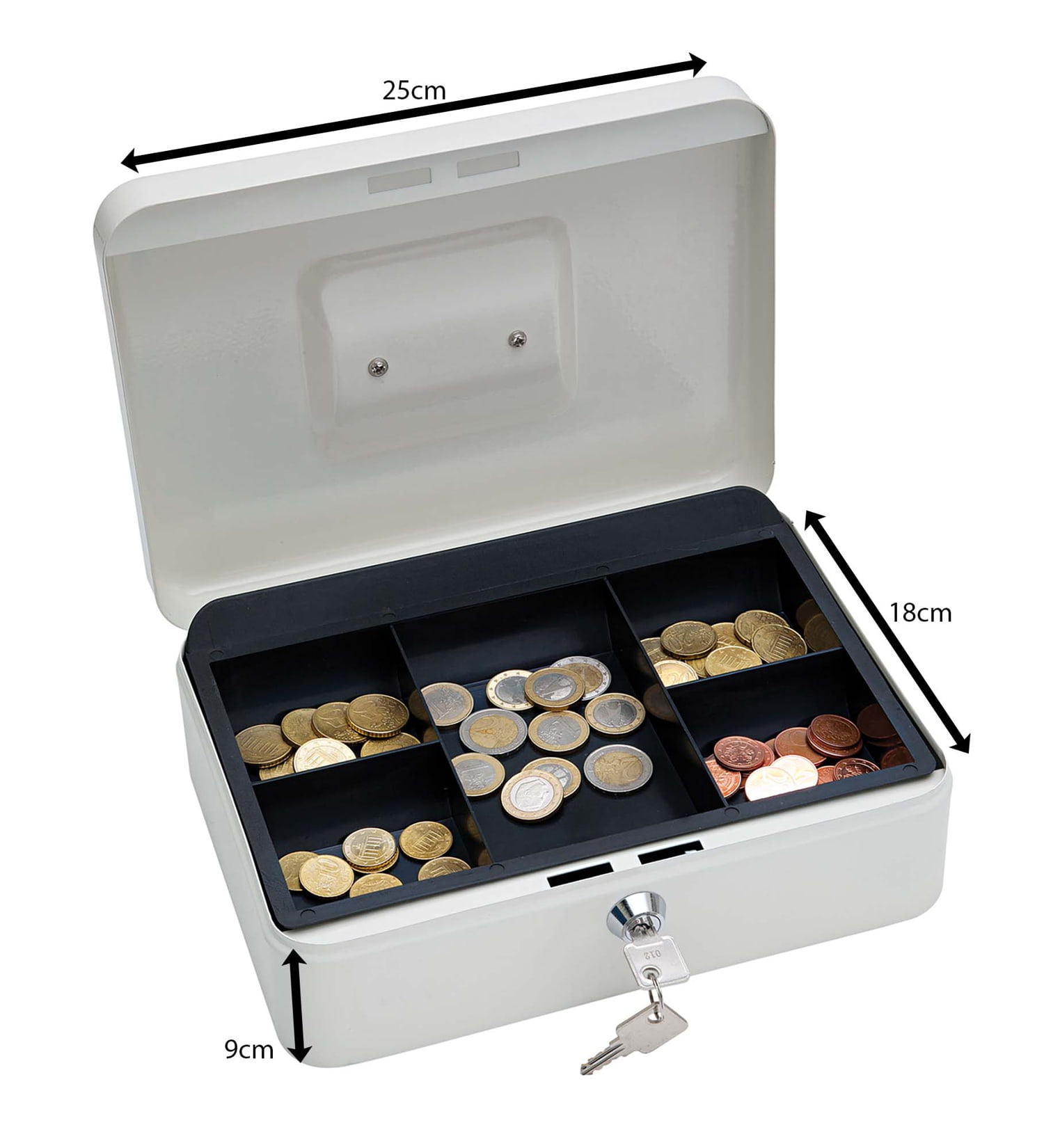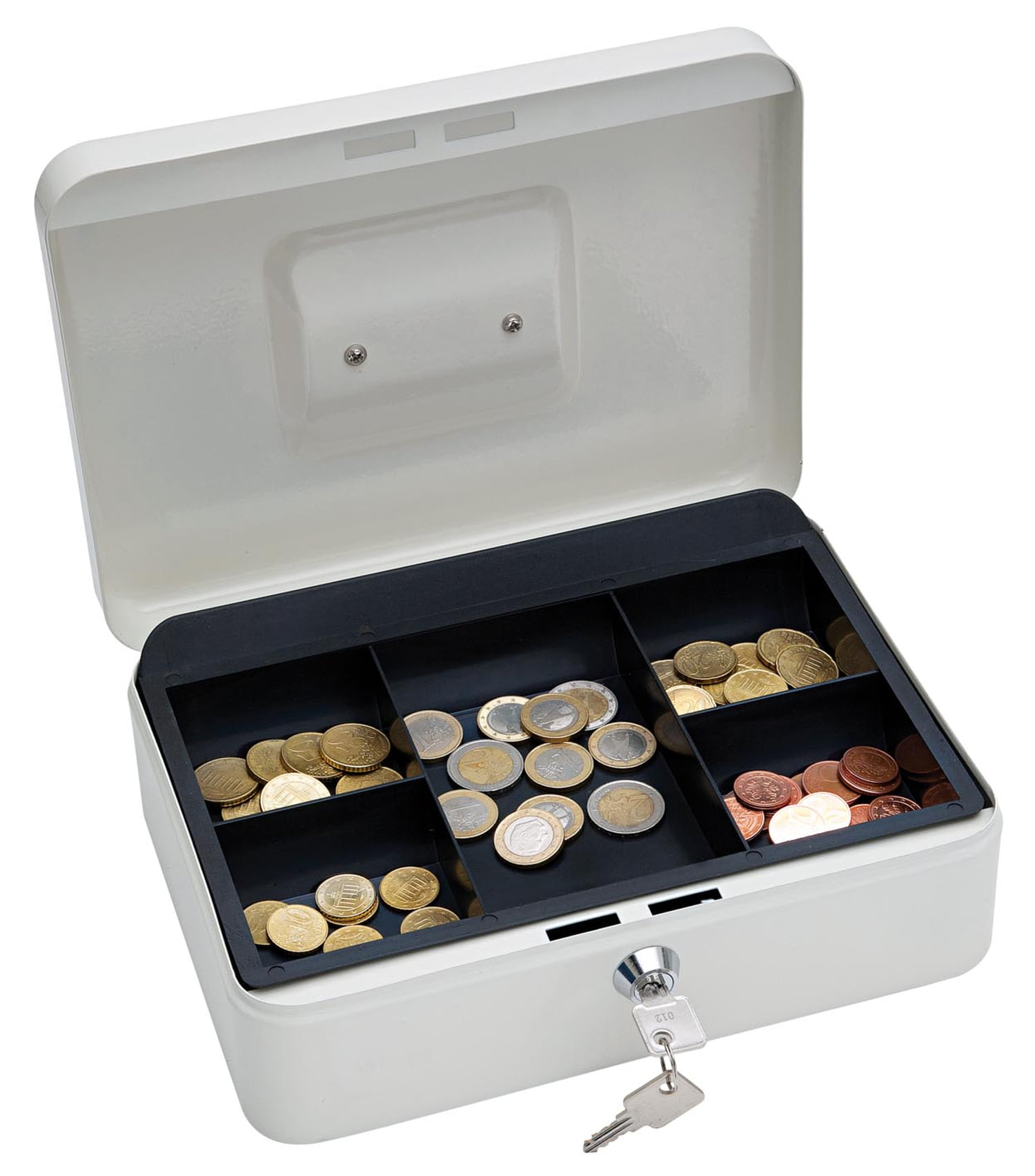 WEDO Geldkassette, Größe 3, weiß. Die Geldkassetten sind aus nahtlos gezogenem Stahl mit Pulverbeschichtung gefertigt und mit einem versenkbaren Tragegriff, einem Münzeinsatz aus Kunststoff mit 5 Fächern sowie einem Sicherheits-Zylinderschloss mit 2 Schlüsseln ausgestattet. Die Schlüsselnummer ist auf dem Schloss eingraviert. Maße: 25,0 x 18,0 x 9,0 cm.
