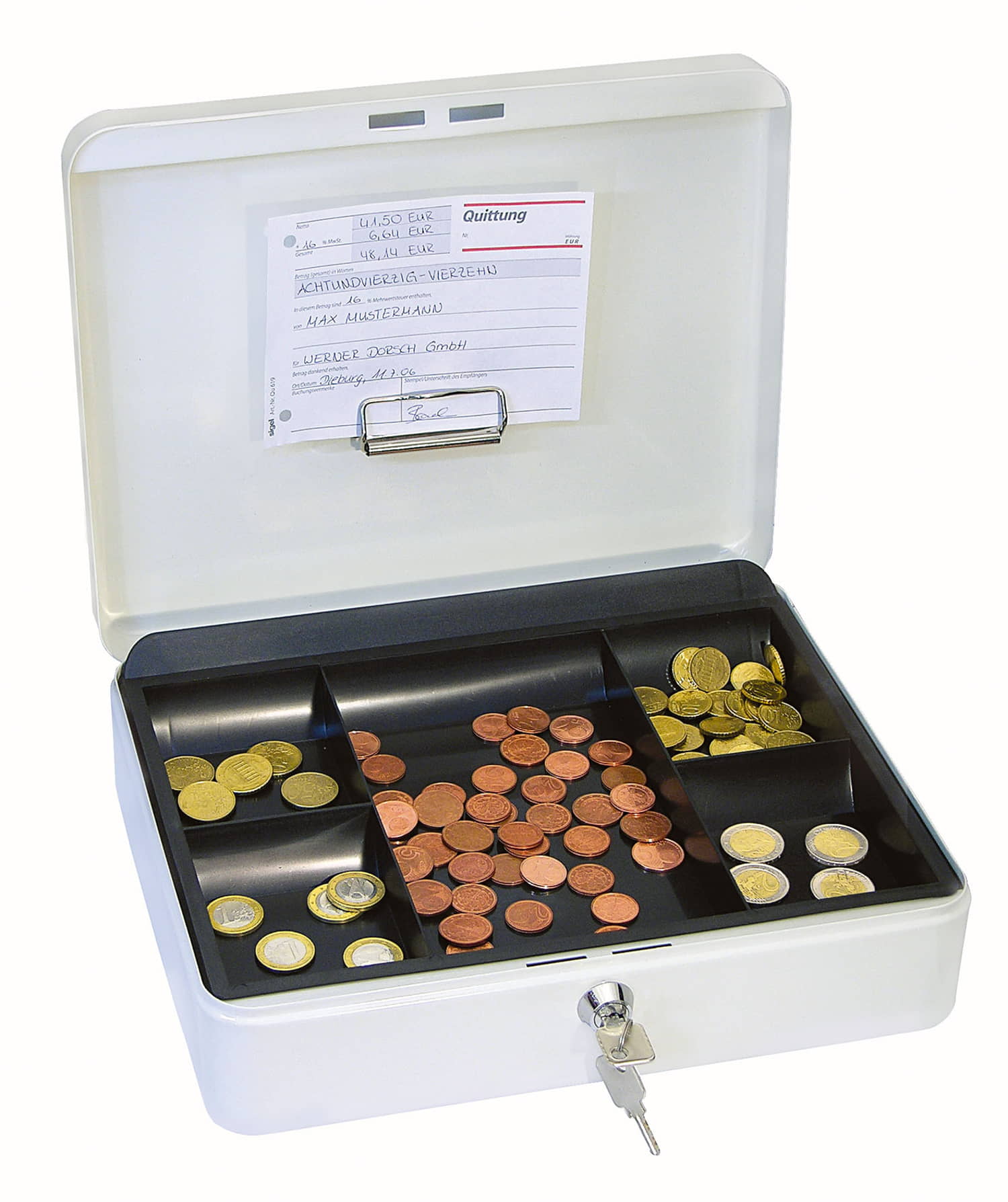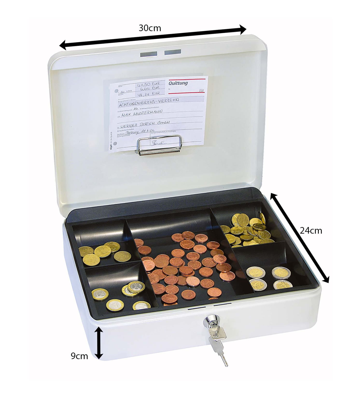 WEDO Geldkassette mit Geldnoten- und Belegklammer, Größe 4, weiß. Die Geldkassetten der H-Serie bieten einen zusätzlichen praktischen Vorteil: Die im Innendeckel angebrachte Beleg- und Geldscheinklammer sammelt z.B. Tagesbelege, hält Scheine beim Kassieren etc. Die Geldkassetten sind aus nahtlos gezogenem Stahl mit Pulverbeschichtung gefertigt und mit einem versenkbaren Tragegriff, einem Münzeinsatz aus Kunststoff mit 5 Fächern sowie einem Sicherheits-Zylinderschloss mit 2 Schlüsseln ausgestattet. Die Schlüsselnummer ist auf dem Schloss eingraviert. Maße: 30,0 x 24,0 x 9,0 cm.