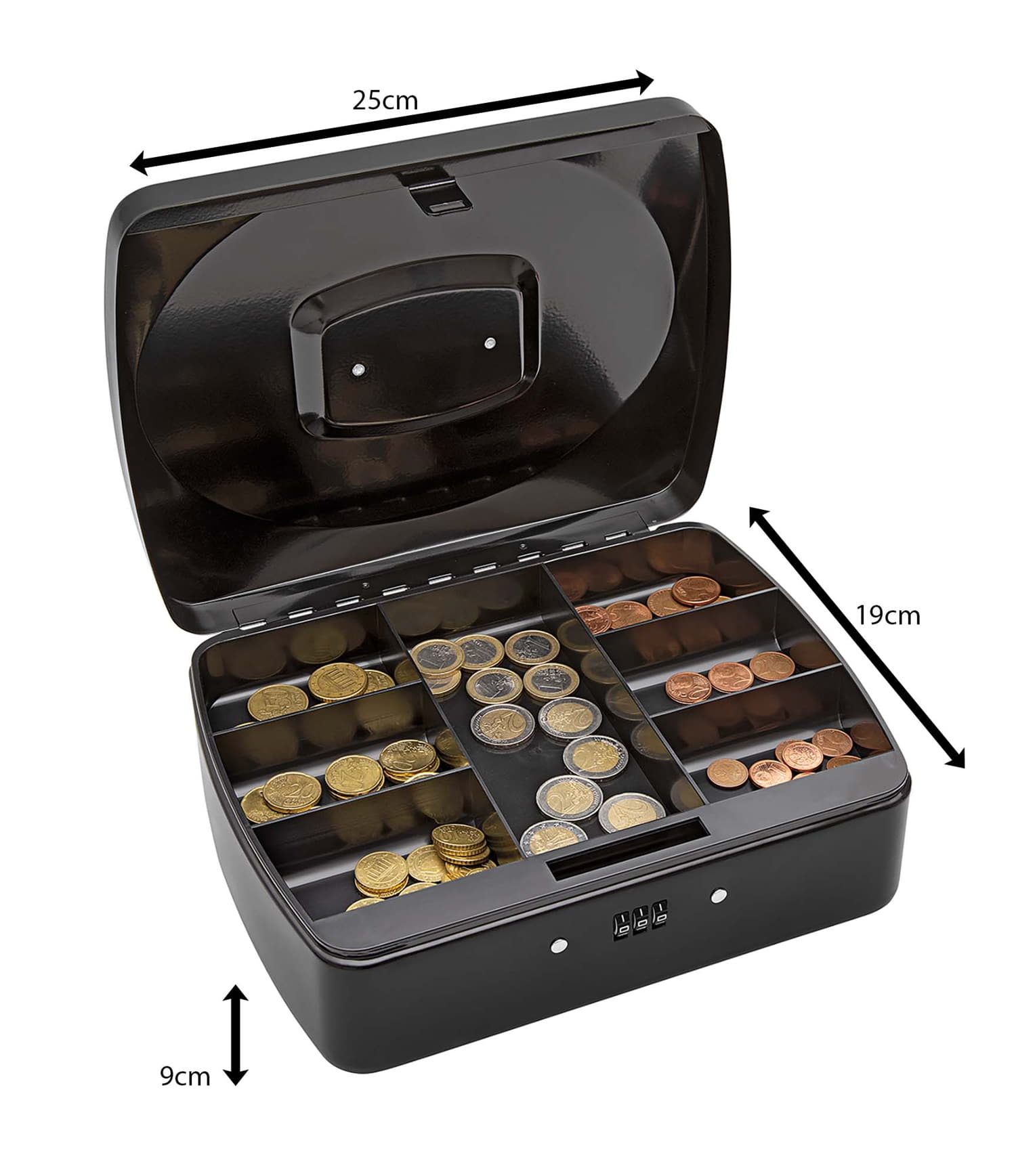 WEDO Geldkassette mit Zahlenschloss, Größe 3. Die Geldkassetten sind aus pulverbeschichtetem, nahtlos gezogenem Stahl gefertigt und mit einem versenkbaren Tragegriff sowie einem Münzeinsatz aus Kunststoff mit 7 Fächern ausgestattet. Das Sicherheitsschloss ist über einen 3-stelligen Zahlencode individuell einstellbar. Damit kann auch einer größeren Anzahl von Nutzern der Zugriff gewährt und jederzeit korrigiert werden, ohne dass Schlüssel notwendig sind. Farbe: schwarz. Maße: 25 x 19 x 9 cm. Lieferung im Karton.