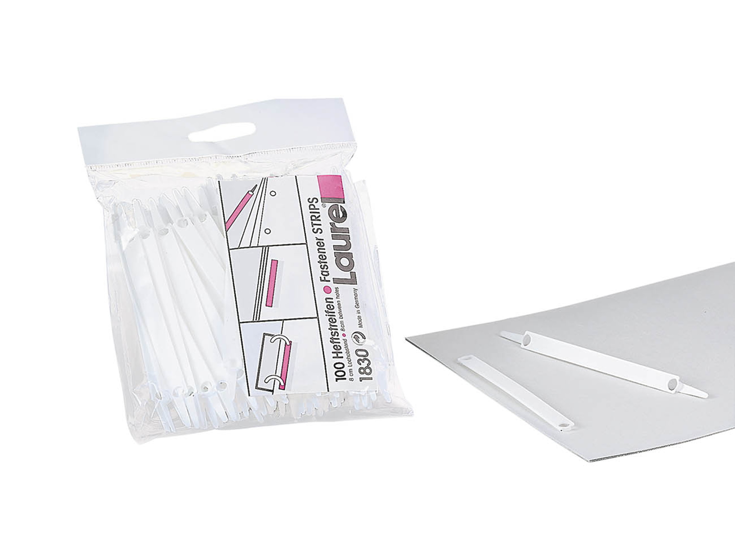Abheftstreifen EASY CLIP weiß, aus Polypropylen (PP). Bis zu 20 Blatt gelochtes Papier lassen sich damit leicht zusammenfassen und komplett mit dem Heftstreifen (Laurel 1830) abheften. Clipgröße: 11,5 x 0,8 cm, 8 cm Lochung, Füllhöhe bis 5 mm. Beutelinhalt: 100 Stück.