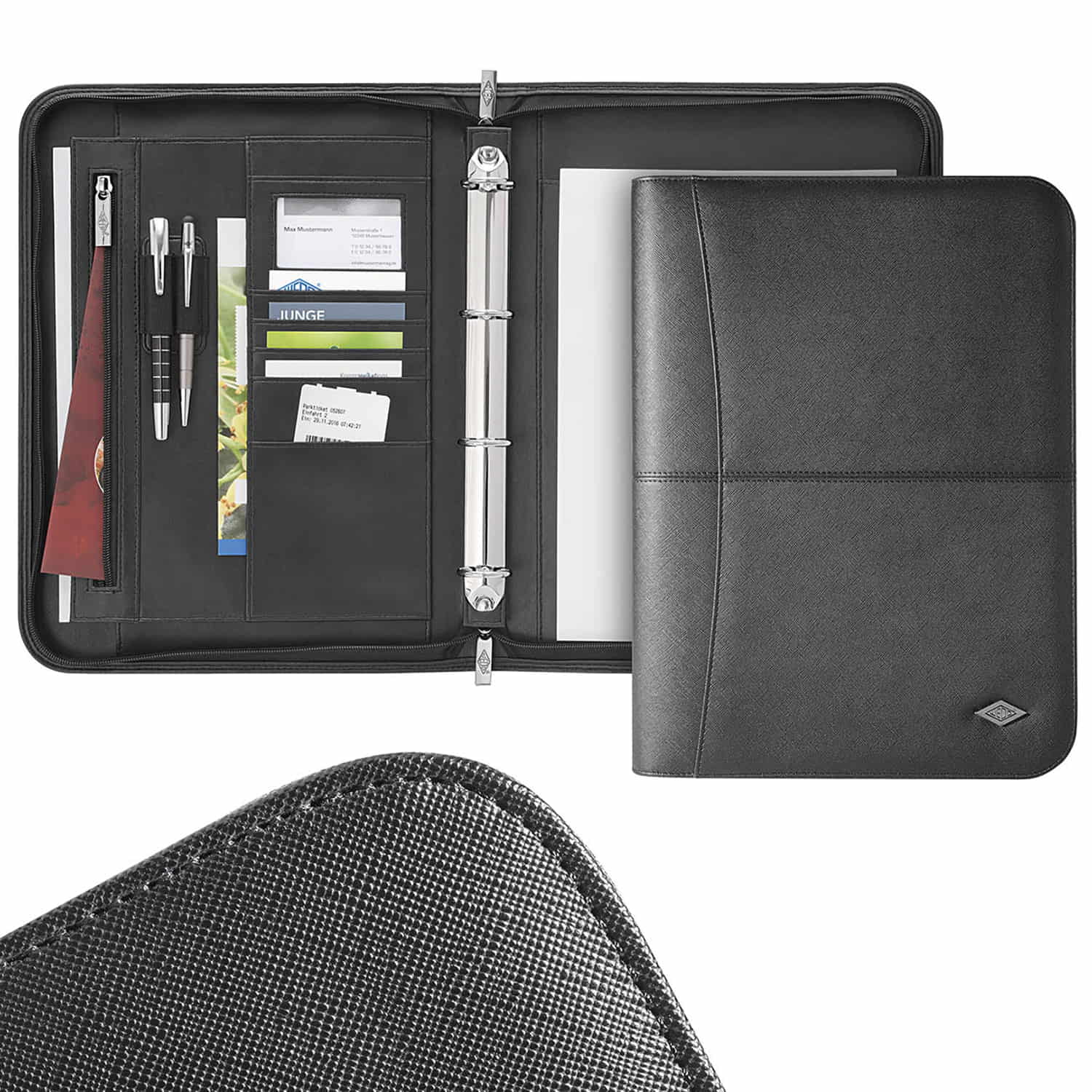 WEDO Konferenzmappe ACCENTO für DIN A4-Format. Hochwertig verarbeitete Konferenzmappe in modernem Design aus strukturiertem, strapazierfähigem Kunstleder mit einem A4-Außenfach vorne und einem Reißverschlussfach hinten. Sie wird mit einem zweiseitigen Reißverschluss verschlossen und ist mit einem A4-Schreibblock ausgestattet. Die 4-Ring-Mechanik (durchmesser 32 mm, Füllhöhe 21 mm) ist herausnehmbar. Weitere Ausstattung: ein A4-Faltfach, ein Reißverschlussfach, ein Sichtfenster für Visitenkarten, vier Kartenfächer, zwei weitere Einsteckfächer sowie zwei Gummizugschlaufen für Schreibgeräte. Farbe: schwarz, Maße: ca. 27,5 x 5,5 x 37,0 cm. Lieferung im bebilderten Karton.