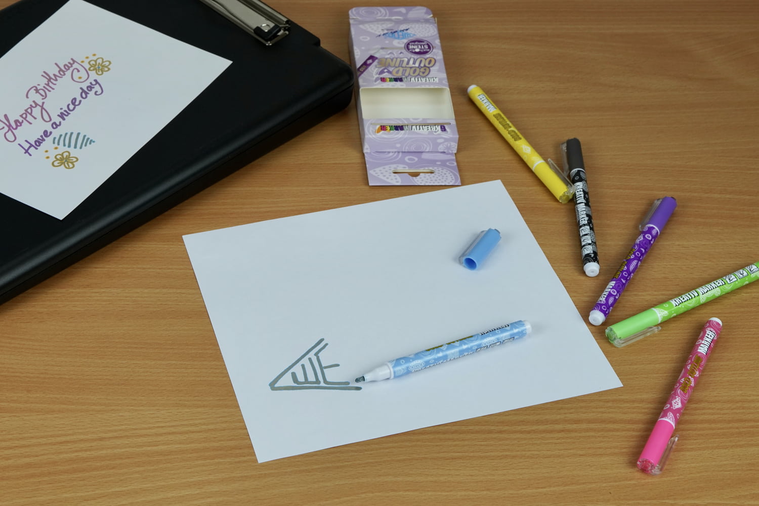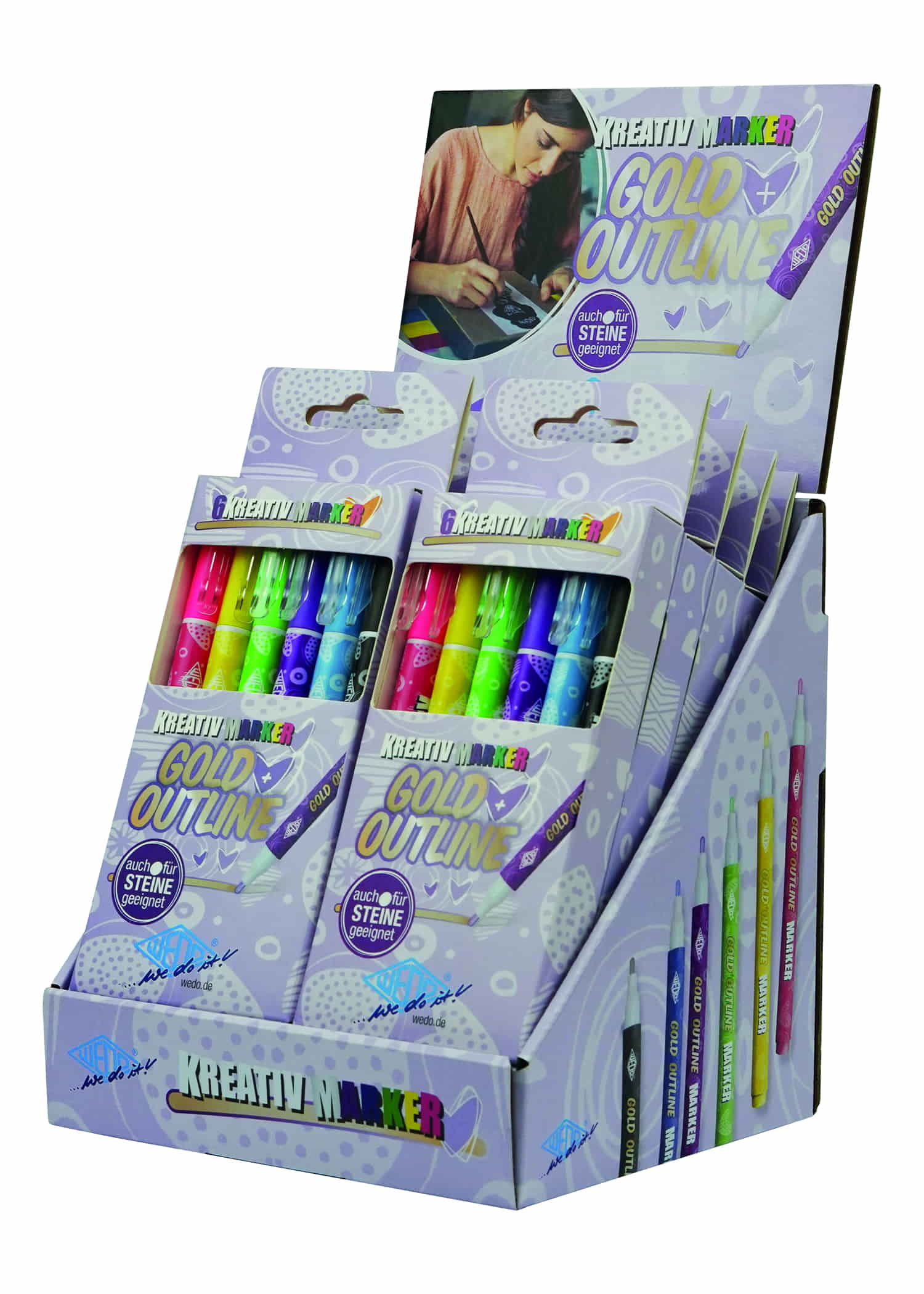 WEDO Kreativmarker Gold+Outline, das kreative Gestalten von netten Grußbotschaften oder das Schreiben von Karten fällt damit ganz leicht. Auch zum Bemalen von Steinen geeignet. Der goldene Schriftstrich wird nach kurzem Aufdrücken der Miene beim Schreiben oder Malen von einer dünnen farbigen Außenlinie umrandet. Die gesamte Strichstärke liegt je nach Druck zwischen 1-2 mm. Das Set umfasst 6 Stifte in Magenta, Gelb, Grün, Hellblau, Lila und Schwarz. Im attraktiven, kompakten Theken-Display sind 8 Sets enthalten. Stift-Maße: ca. Durchmesser 1,1 cm x 14,1 cm lang, 6-er Verpackung (L/B/H): ca. 18 x 7 x 2 cm, Display (L/B/H) ca. 14,5 x 15 x 27 cm.