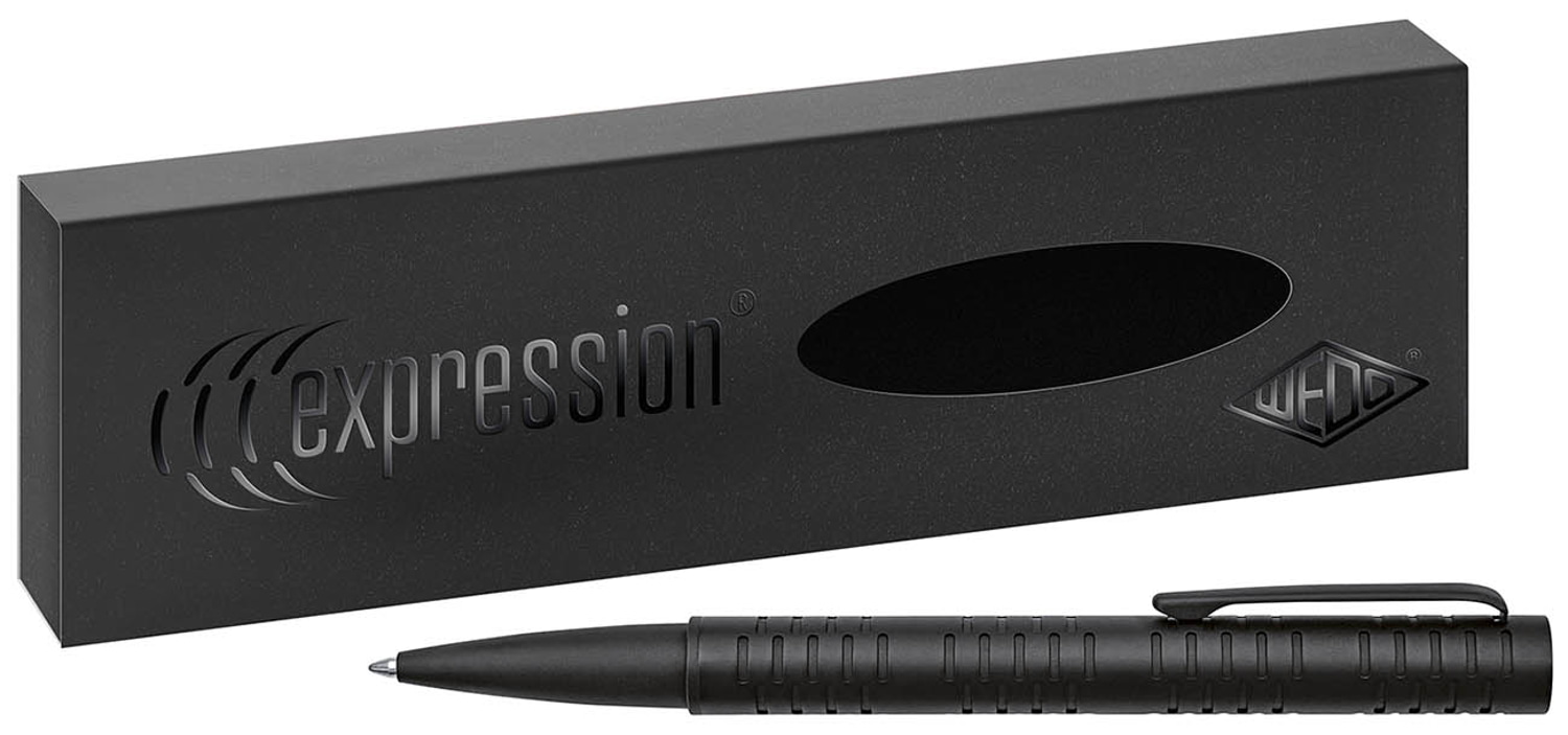 WEDO Design-Kugelschreiber EXPRESSION. Die Kugelschreiber Expression verbinden hohen Schreibkomfort mit markanter und einzigartiger Optik. Der doppelwändige Schaft erhält durch ein aufwändiges Verfahren sein extravagantes Erscheinungsbild. Das klare, geradlinige Muster ist durchgeätzt, so dass die veredelte Oberfläche der Innenhülse zu erkennen ist. Die Kugelschreiber mit Drehmechanik sind mit einer blauen Metall-Großraummine (Parker-System) ausgestattet. Farbe: mattschwarz. Lieferung im schwarzen Geschenkkarton.