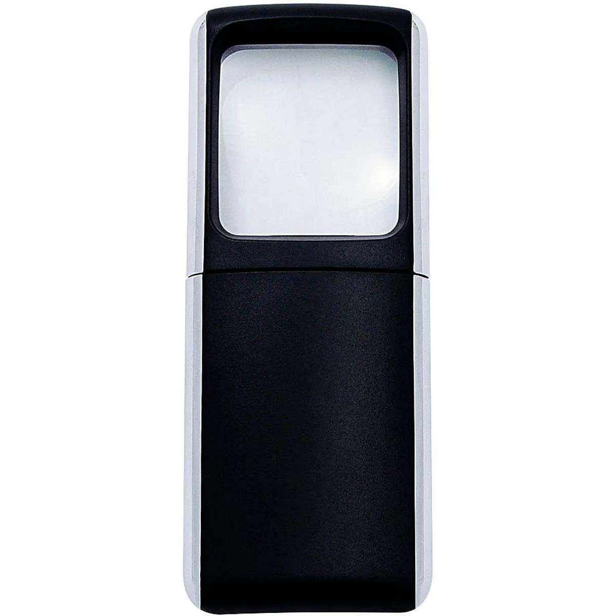 WEDO Rechtecklupen mit LED-Beleuchtung, schwarz. Das extrahelle weiße LED-Licht wird durch einfaches Hochziehen des Gehäuse-Oberteils eingeschaltet. Die ca. 3,5 x 3,8 cm große Kunststofflinse vergrößert 3-fach. Das elegante, flache Gehäuse mit mattierter Kunststoffoberfläche liegt leicht und angenehm in der Hand. Maße: ca. 11,8 x 4,7 x 1,4 cm, Gewicht: 48 g. Lieferung inkl. 2 x 3V CR1220-Batterien.