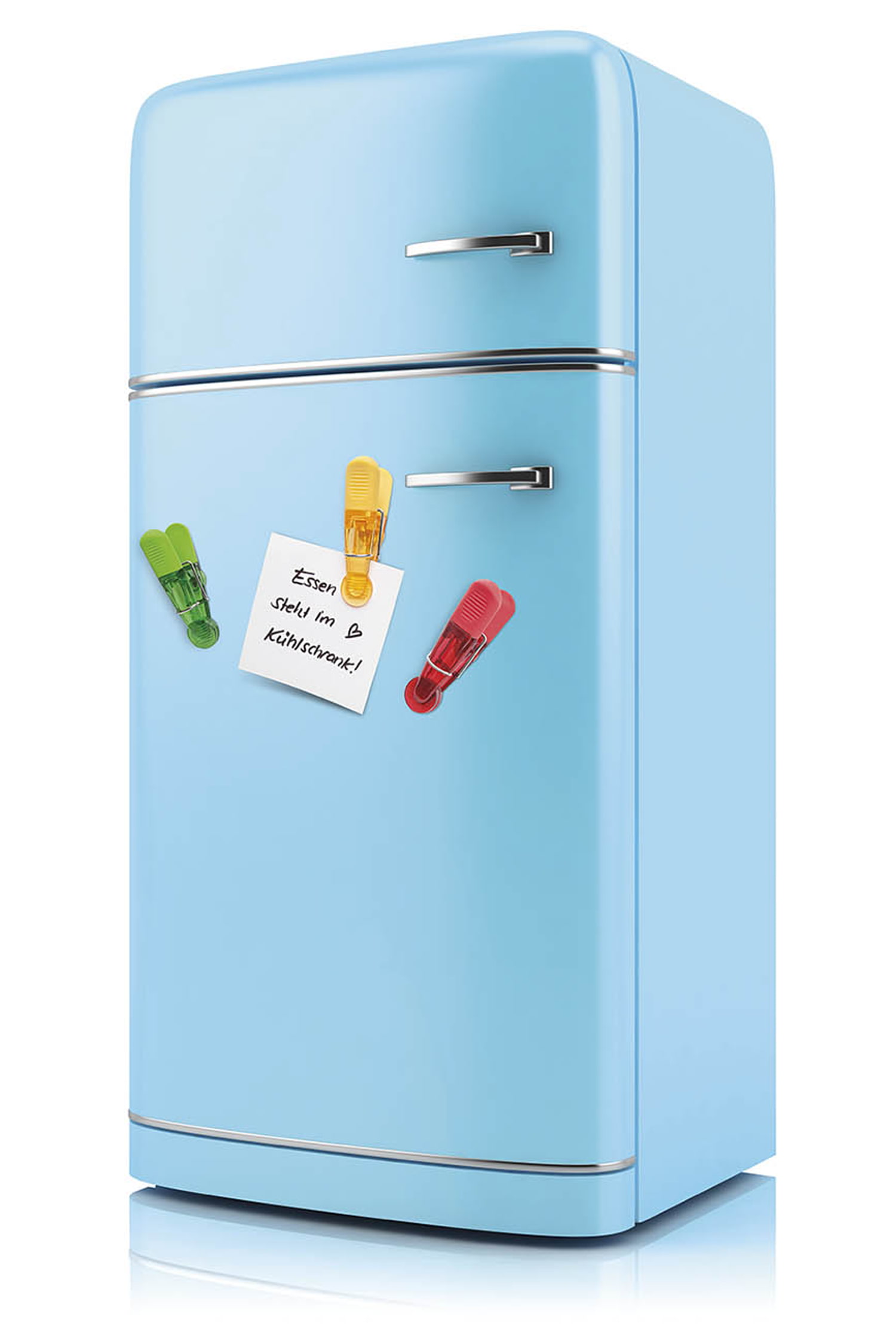 WEDO Notiz-Magnethalter GLOSSY. Die praktischen Klammern aus Kunststoff mit geriffelten Griffflächen strahlen in transparenten Farben und sind echte Hingucker. Ausgestattet mit einem starken Magneten sorgen sie dafür, dass Ihre Notizen dekorativ auf allen metallischen Oberflächen, wie z.B. Kühlschranktüren, haften bleiben. Haltekraft mind. 20 Blatt Papier im A4-Format (80 g/qm). Maße: ca. 8,4 x 4,0 x 2,1 cm. Lieferung im 4er-Set mit je 1 Klemmer in Gelb, Grün, Rot und Blau auf attraktiver SB-Karte.