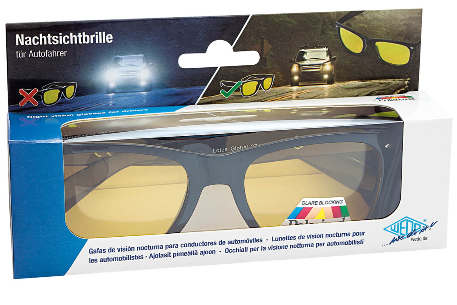 WEDO Nachtsichtbrillen für Autofahrer ... für gute Sicht bei Nacht und Nebel, Regen und Gegenlicht! Die polarisierenden Brillengläser reduzieren Blendungen durch grelle Scheinwerfer und Spiegelungen auf nassen Straßen. Bei trüben und diesigen Lichtverhältnissen verbessern sie das Kontrastsehen. Brillengestell schwarz mit gelb getönten, polarisierenden Gläsern. Produziert gemäß EN ISO 12312-1:2013+A1:2015, Filterkategorie 1 (leicht getönte Gläser mit eingeschränktem Schutz vor Sonneneinstrahlung). Lieferung inkl. Brillenhülle und Gebrauchsanleitung in attraktiver SB-Einzelverpackung mit Sichtfenster zu 12 Stück im Display (Displaygröße inkl. Kopfschild ca. 23,2 x 16,9 x 22,1 cm).
