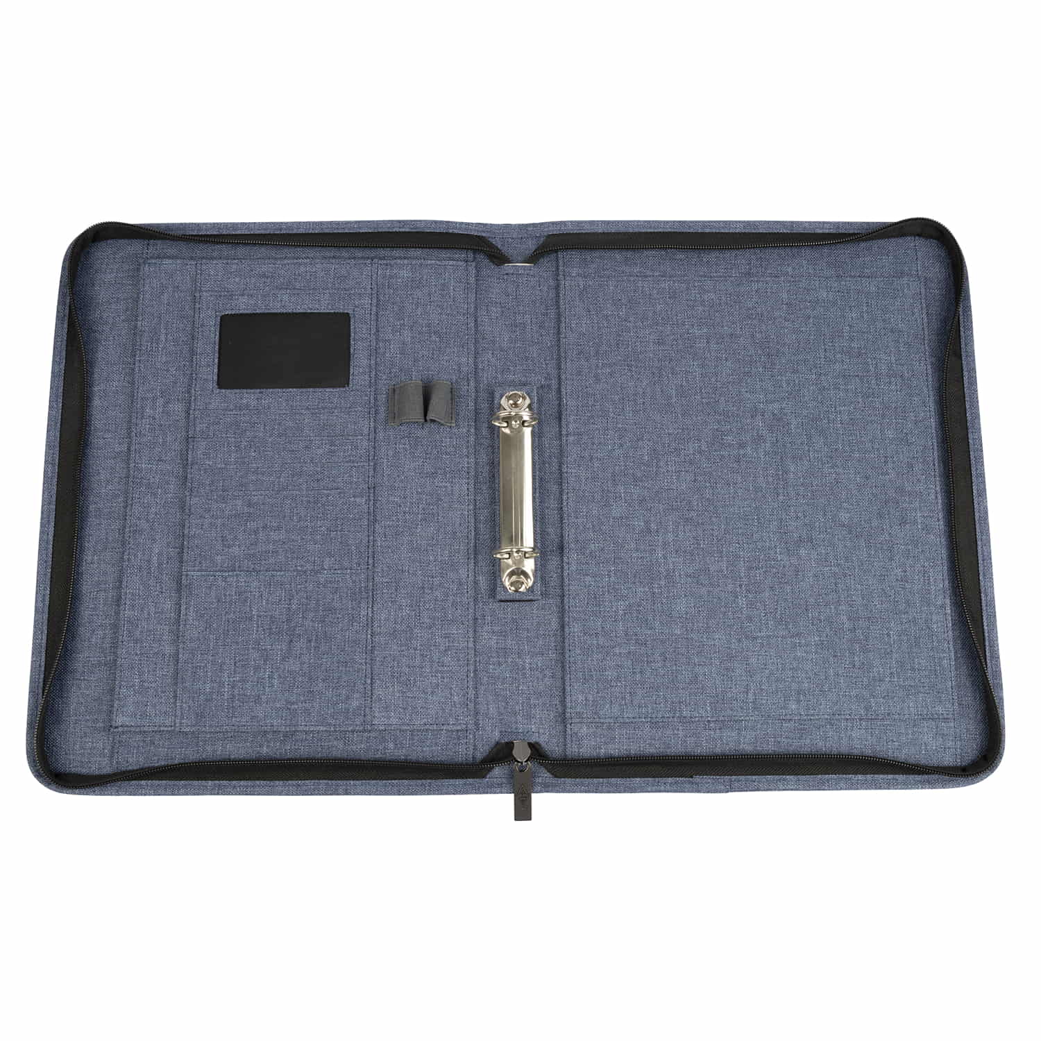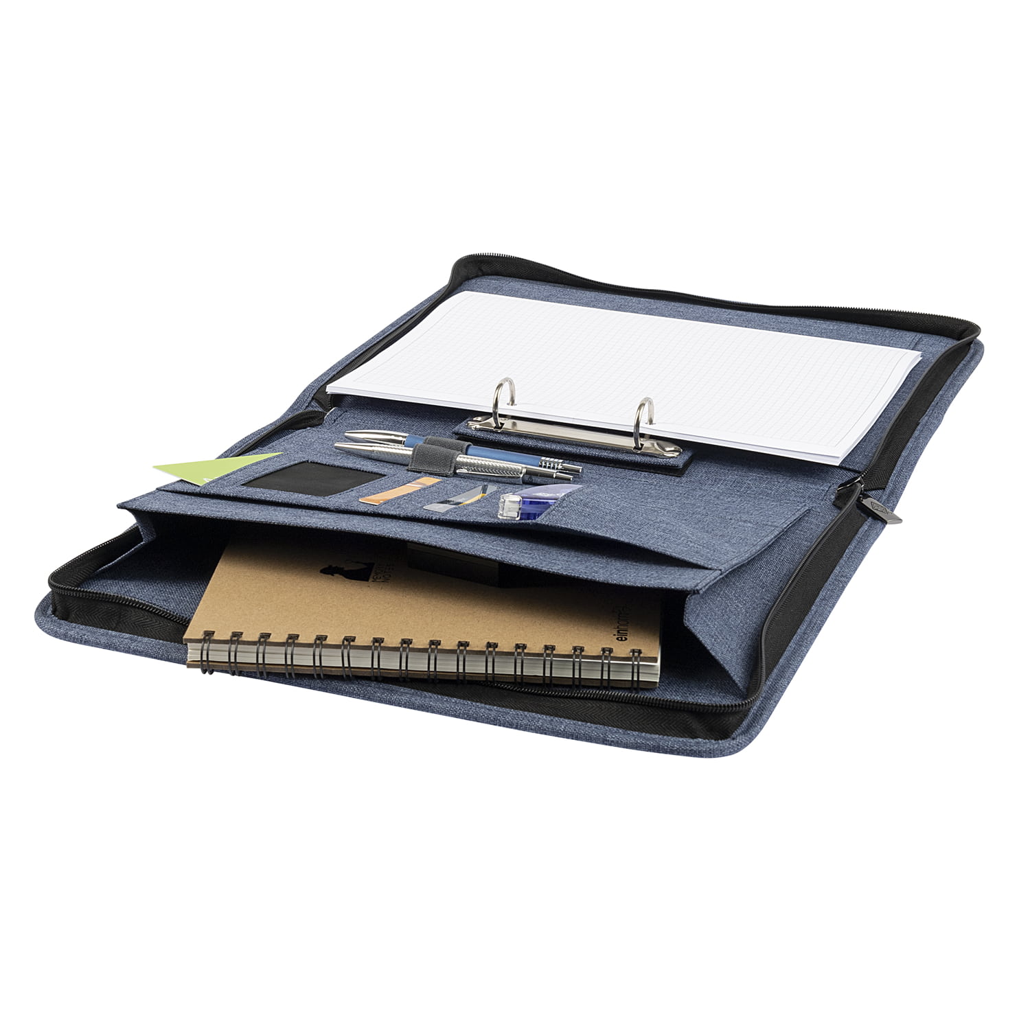 WEDO Ringbuchmappe DENIM für A4-Formate mit herausnehmbarer 2-Ring-Mechanik. Diese vielseitige Schreibmappe ist mit einer hochwertigen 2-Ring-Mechanik (Ø 30 mm, Füllhöhe 20 mm) ausgestattet und kann sowohl mit Standard- als auch mit Spiralblöcken bestückt werden. Der Blockeinschub ist von allen 4 Seiten möglich. Zahlreiche Einsteckfächer, zwei Gummizugschlaufen sowie ein großes A4-Faltfach bieten Platz für Karten, Stifte und weitere Unterlagen. Die hochwertig verarbeitete Ringbuchmappe mit umlaufendem Reißverschluss ist aus pflegeleichtem Polyester mit Leinenstruktur gefertigt, die der Mappe eine angenehme Haptik verleiht. Maße: ca. 28,0 x 4,7 x 35,5 cm, Farbe: blaumeliert. Aufklappbar in Folie verpackt mit je 1 Produktdatenblatt innen und außen.