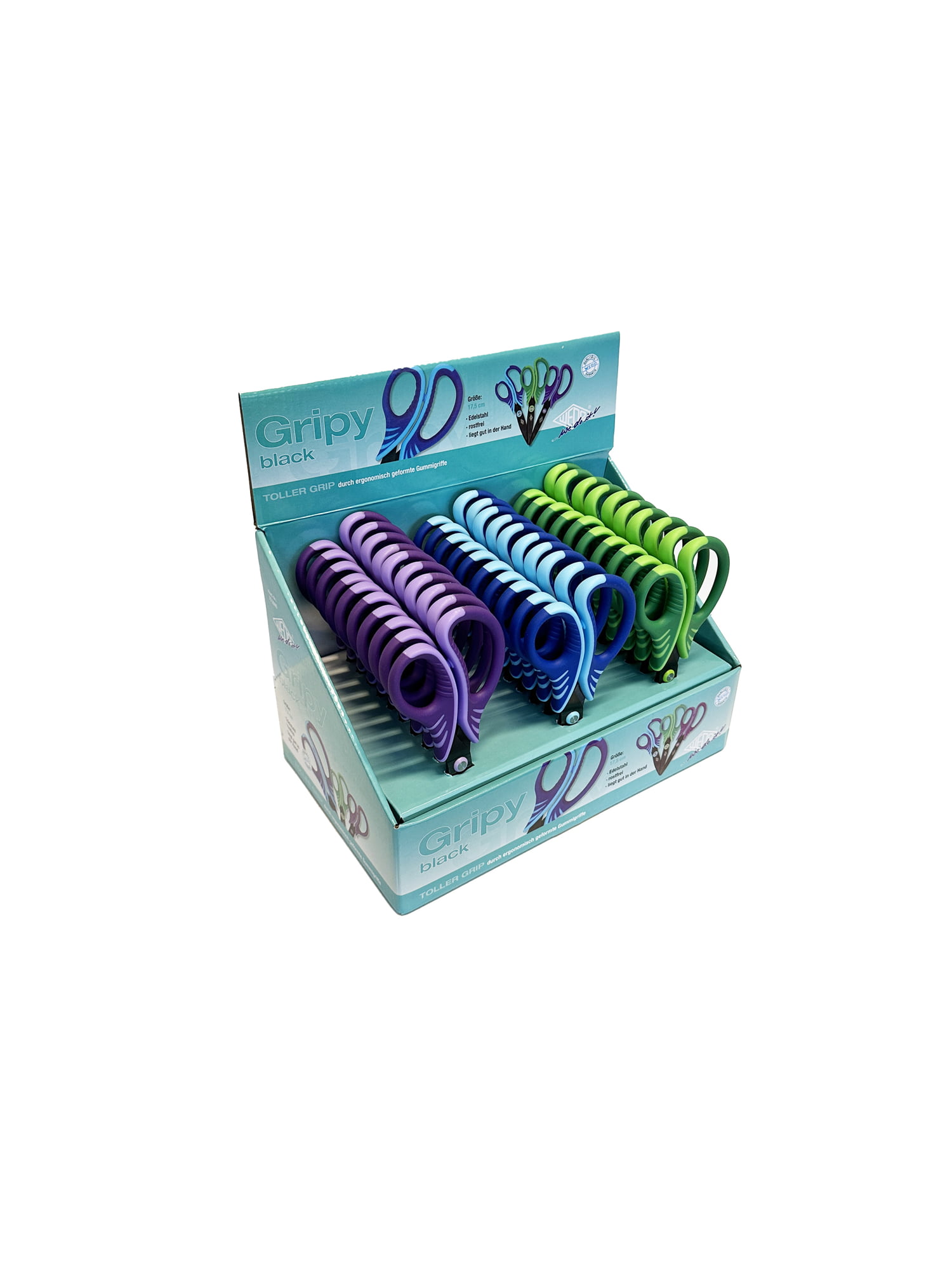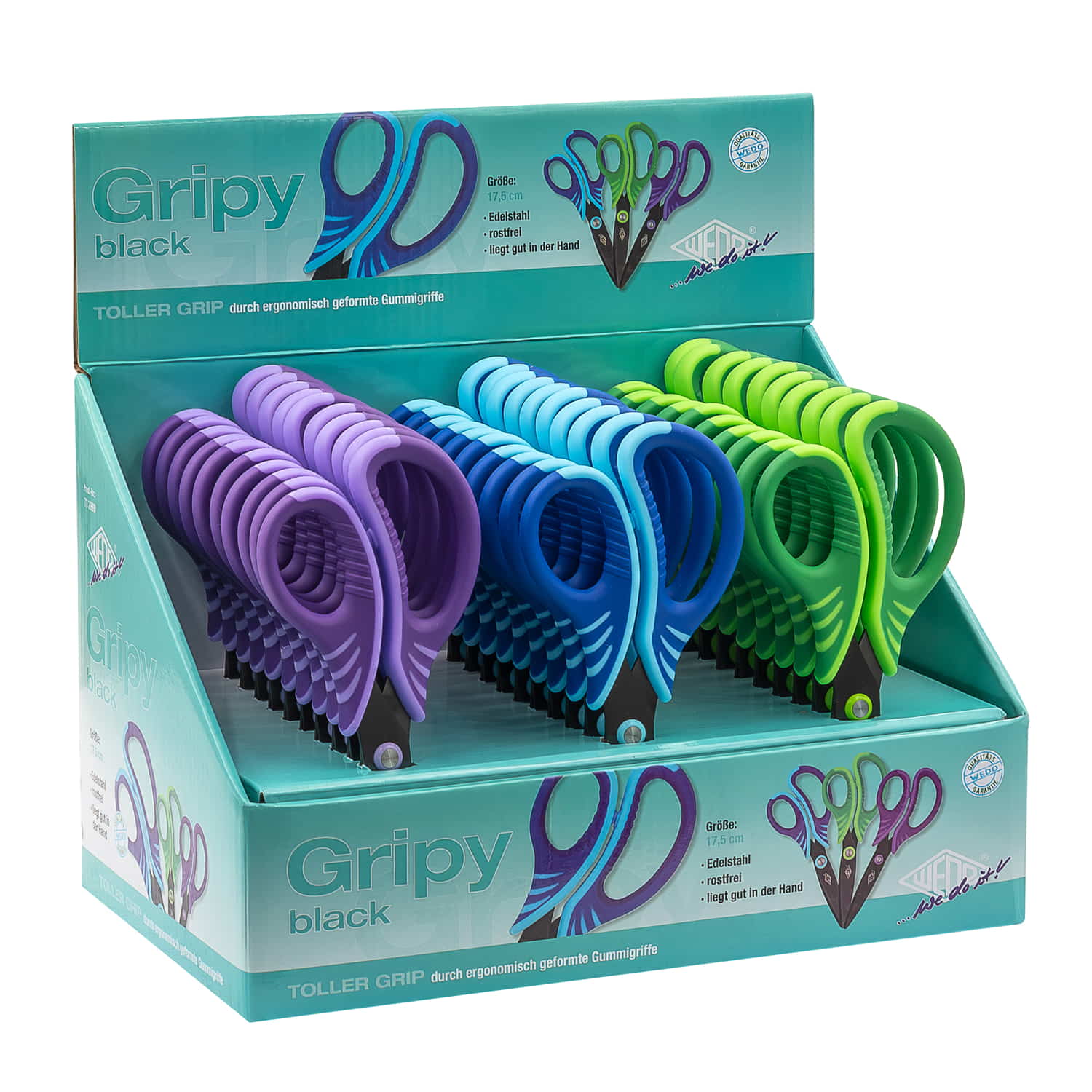 WEDO Bastelschere Gripy black, 17,5 cm. Die ergonomisch geformten Griffe mit Gummiprofil liegen einfach gut in der Hand und bieten sicheren Halt. Aus rostfreiem Edelstahl mit spitz geschliffenem Scherenblatt mit Titanum gun Lackierung gefertigt. Im attraktiven Verkaufsdisplay mit 30 Scheren, farbig sortiert in lila, grün und blau.