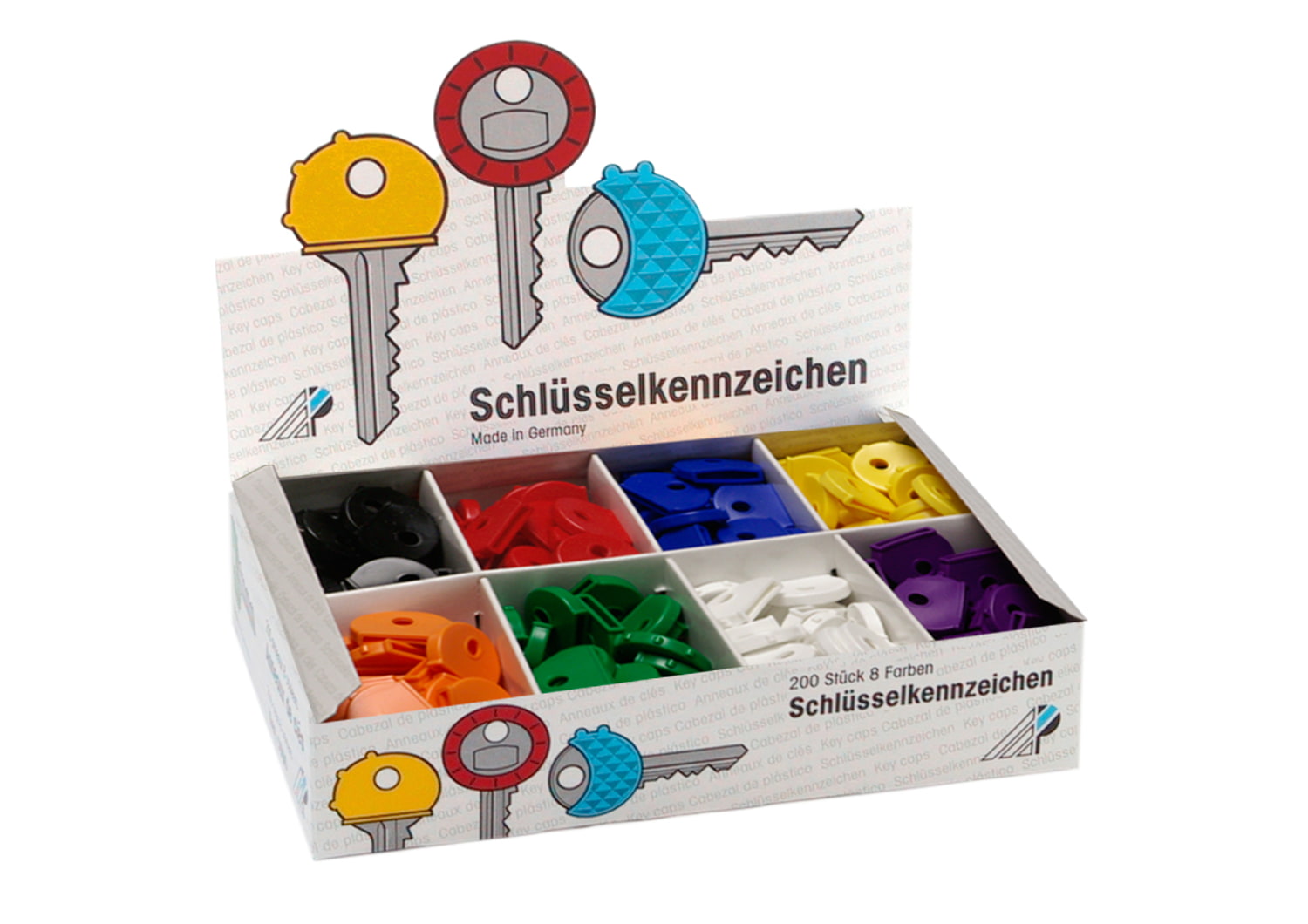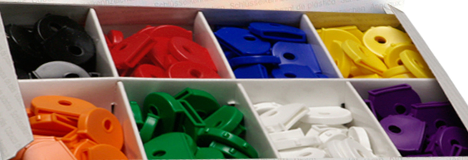 WEDO Schlüsselkappen, rund. Mit den bunten Schlüsselkappen aus flexiblem Kunststoff lassen sich die Schlüssel der zugeordneten Türen schnell erkennen. Die Kappen sind seitlich zusätzlich mit verschiedenen Tastzeichen versehen. Maße: 2,5 x 2,0 cm. Lieferung im Display mit 200 Stück in 8 Farben sortiert.