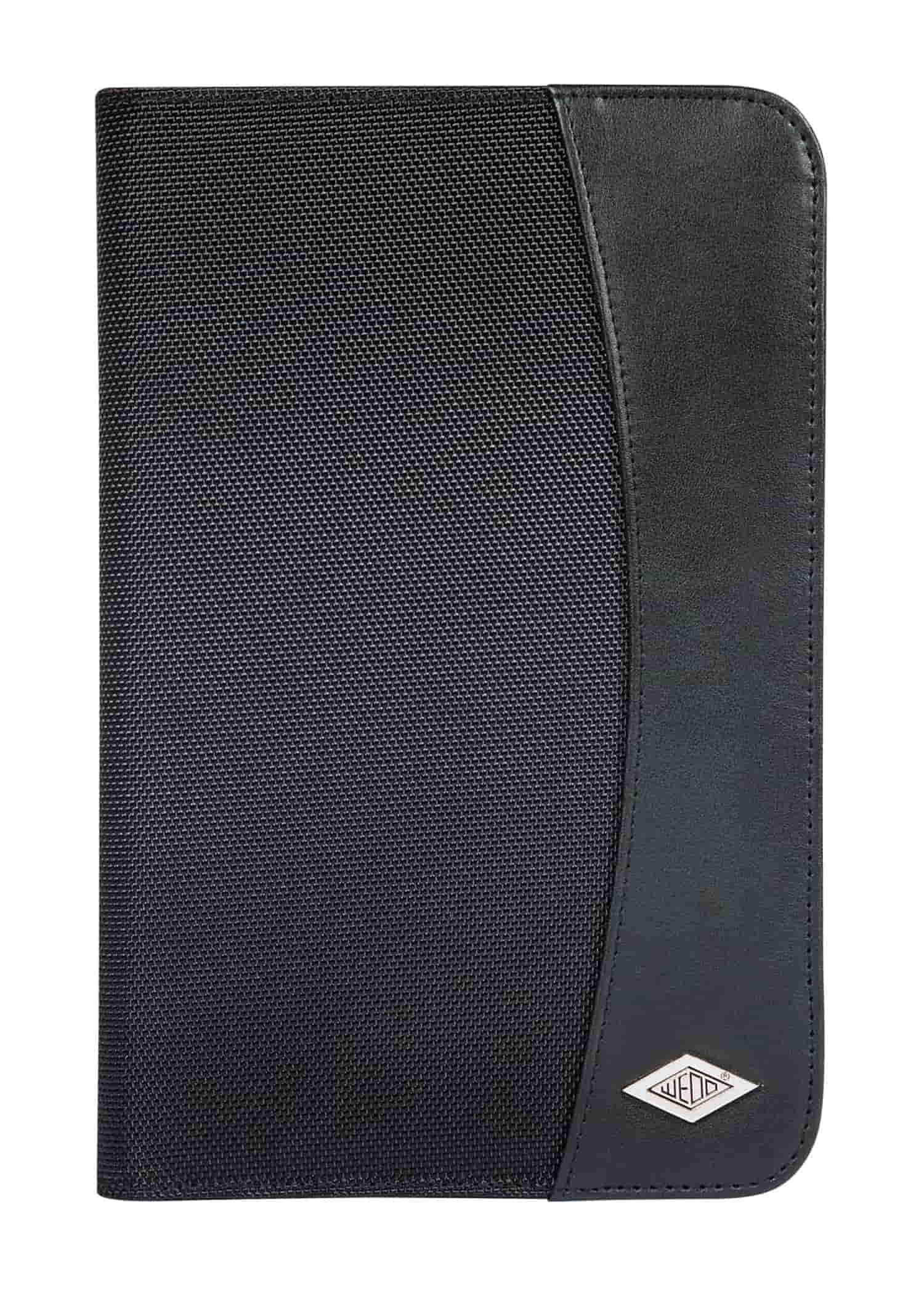 WEDO Schreibmappe "Elegance" für DIN A5-Formate. Handlich klein mit praktischer Innenaufteilung: Neben einem Einsteckfach für einen A5-Schreibblock und eine Gummizugschlaufe für ein Schreibgerät ist die Schreibmappe mit zwei Einsteckfächern für A5-Formate, vier Kartenfächern, einem Sichtfenster für Visitenkarten sowie einer großen Gummizugschlaufe für einen Taschenrechner o.ä. ausgestattet. Die außergewöhnliche Kombination von hochwertigem Kunstleder und strukturiertem Nylon gibt dieser Schreibmappe aus der „Elegance“-Taschenserie eine moderne und elegante Optik. (Lieferung ohne Inhalt) Maße: 26 x 1,5 x 17,5 cm. Farbe: schwarz. Verpackt im Polybeutel mit Einleger.