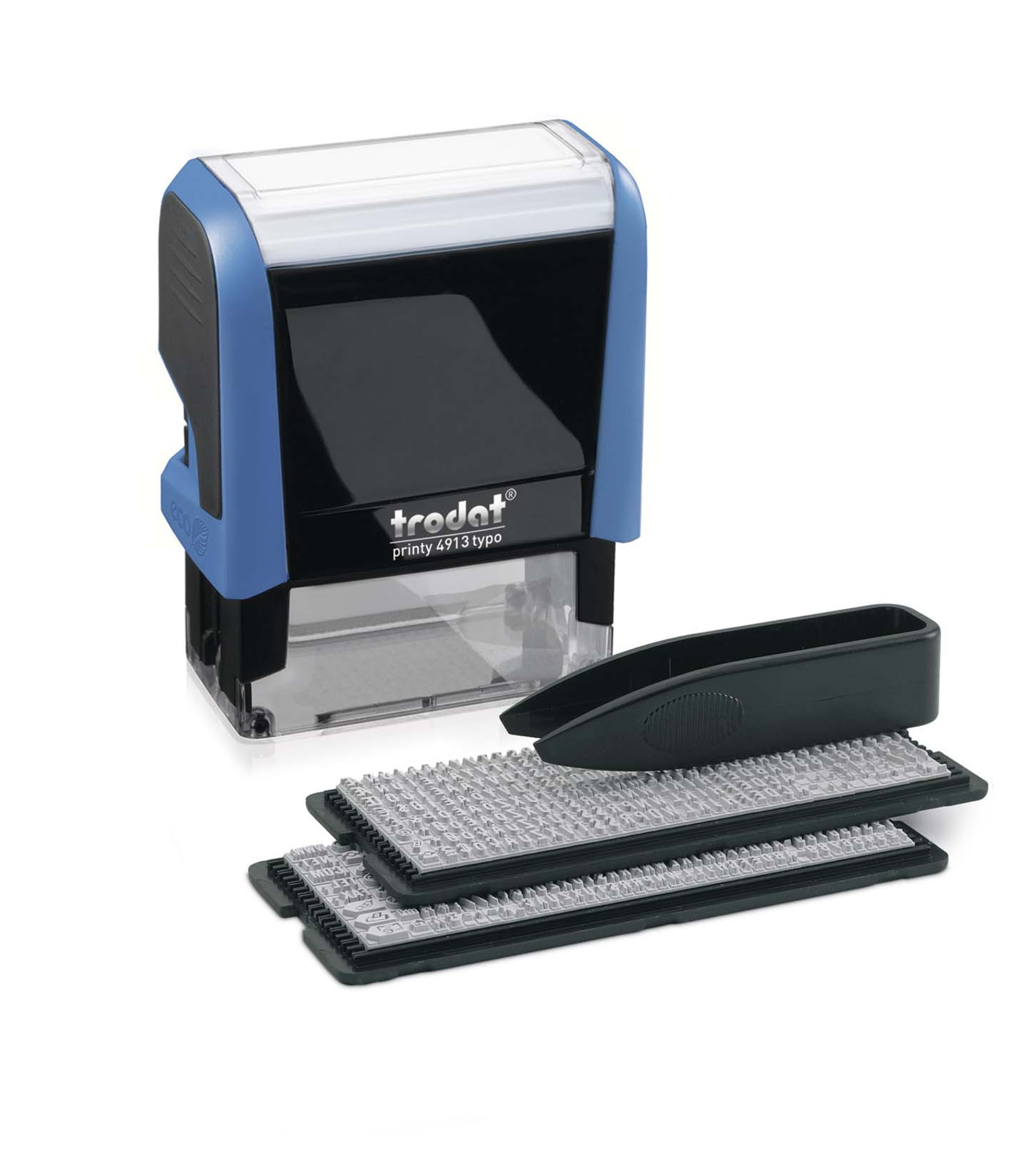 TRODAT 4913, Modell 4.0, Typo-Printy-Set 5-zeilig, selbstfärbend. Wenn Sie schnell einen Stempelabdruck brauchen oder öfters den Text ändern wollen, dann ist der Typo-Printy der ideale Stempel. Zubehör: 1 Set Gummitypen 3 mm (336 Zeichen), 1 Set Gummitypen 4 mm (288 Zeichen), 1 Pinzette, 1 Kissen in schwarz. 100% sauberer Kissenwechsel dank spezieller Griffzonen. Minimierter CO2-Fußabdruck. Die unvermeidbaren CO2-Emissionen werden durch Investitionen in vom WWF empfohlene Klimaschutzprojekte ausgeglichen (mehr unter www.umwelt.trodat.de). Das glasklare Positionierungsfenster und die transparenten Bodenkanten garantieren ein ultrapräzises Ausrichten. Ein kleiner, leichter Stempel in edlem Hochglanzdesign. Stempelgröße 7,5 x 3,9 x 8,5 cm, Farbe: blau, Abdruckgröße max. 58 x 22 mm.