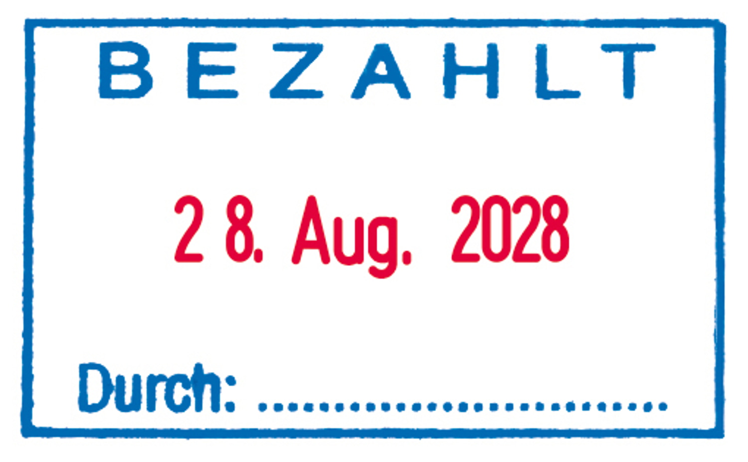 TRODAT 4750/L Datumstempel mit Textplatte, selbstfärbend. Text: BEZAHLT / Durch. Datum Schrifthöhe 4 mm, Monat in Buchstaben. Abdruckgröße 4,0 x 2,3 cm. Datumeinstellung mittels Antriebsrädern. Mit 2-farbigem Stempelkissen, Text in Blau und Datum in Rot. Stempelgröße 6,1 x 3,9 x 10,6 cm.