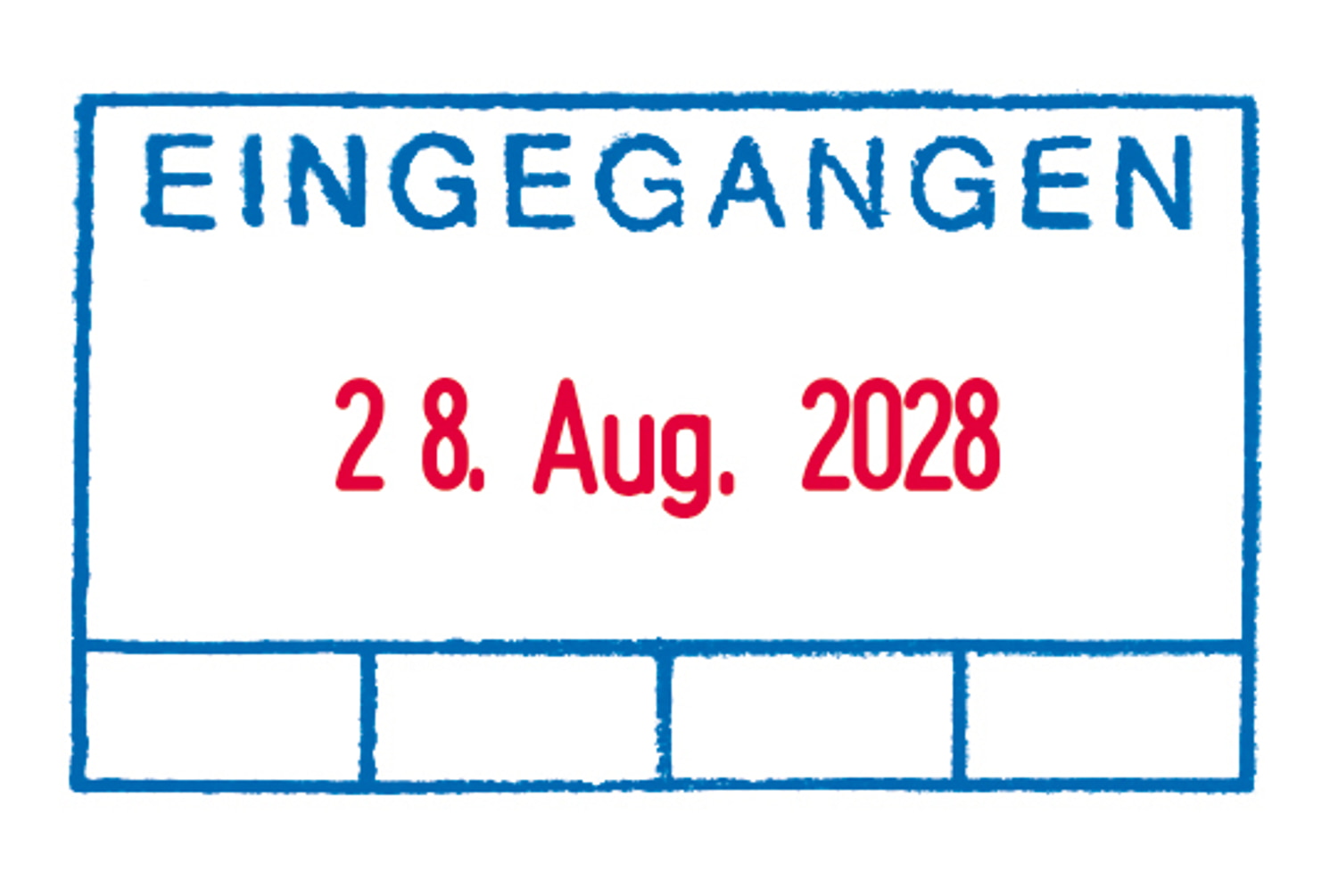 TRODAT 4750/L Datumstempel mit Textplatte, selbstfärbend. Text: EINGEGANGEN mit 4 Feldern. Datum Schrifthöhe 4 mm, Monat in Buchstaben. Abdruckgröße 4,0 x 2,3 cm. Datumeinstellung mittels Antriebsrädern. Mit 2-farbigem Stempelkissen, Text in Blau und Datum in Rot. Stempelgröße 6,1 x 3,9 x 10,6 cm.