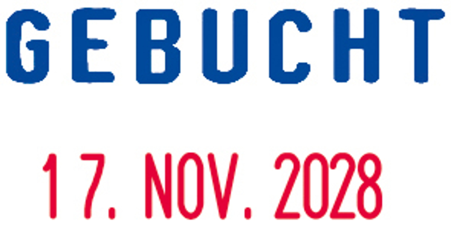 TRODAT 4850/L7 Datumstempel mit Textplatte, selbstfärbend. Text: GEBUCHT. Schrifthöhe Datum 3,8 mm, Monat in Buchstaben. Abdruckgröße 2,3 x 1,2 cm. Datumeinstellung mittels Antriebsrädern. Mit 2-farbigem Stempelkissen, Text in Blau und Datum in Rot. Stempelgröße 4,0 x 2,2 x 7,6 cm.