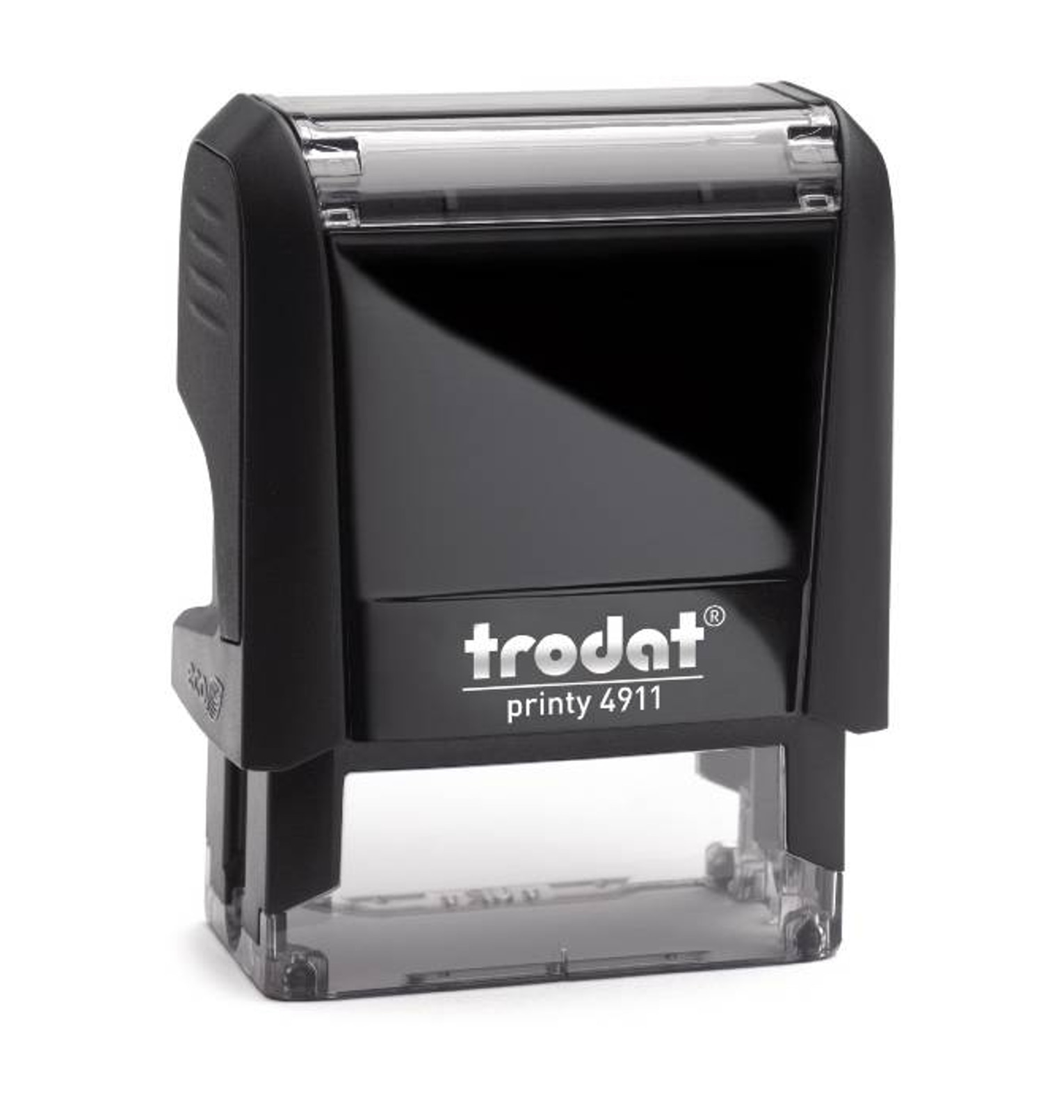 TRODAT PRINTY 4911, Modell 4.0. 4-zeiliger Textstempel, selbstfärbend, mit integriertem Stempelkissen in Schwarz. Absolut sauberer Kissenwechsel dank spezieller Griffzonen. Minimierter CO2-Fußabdruck. Die unvermeidbaren CO2-Emissionen werden durch Investitionen in vom WWF empfohlene Klimaschutzprojekte ausgeglichen (mehr unter www.umwelt.trodat.de). Das glasklare Positionierungsfenster und die transparenten Bodenkanten garantieren ein ultrapräzises Ausrichten. Der kleine, leichte Taschenstempel im edlen Hochglanzdesign wird mit einem Gutschein zur Anfertigung einer individuellen Textplatte geliefert. Vier Schriftarten stehen zur Auswahl, zusätzliche Schriften und Einbindung eines Logos bei Bestellung der Stempelplatte online unter www.stempeltextplatten.trodat.de. Stempelgröße: 5,4 x 3,0 x 6,9 cm. Farbe: schwarz. Max. Abdruckgröße 38 x 14 mm.