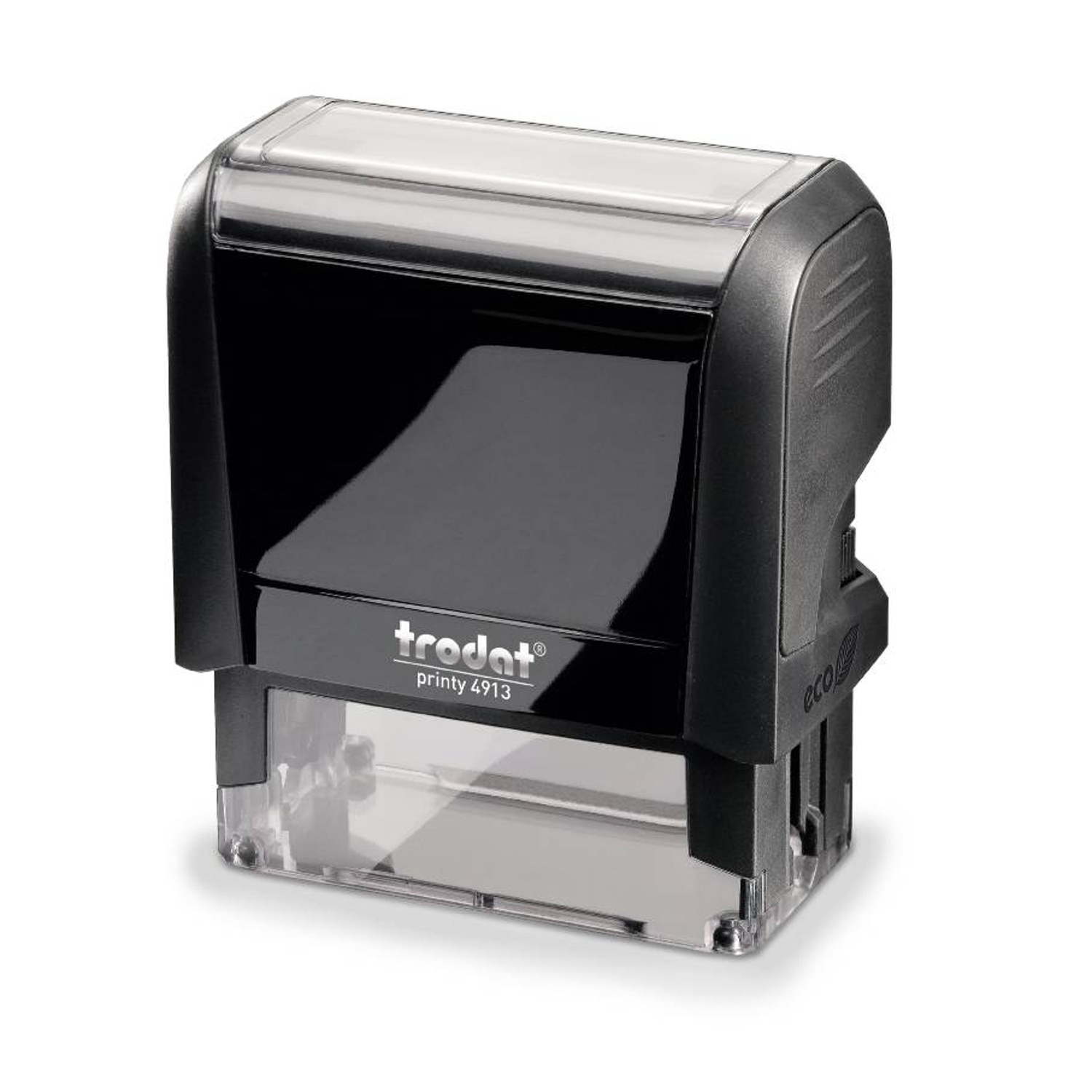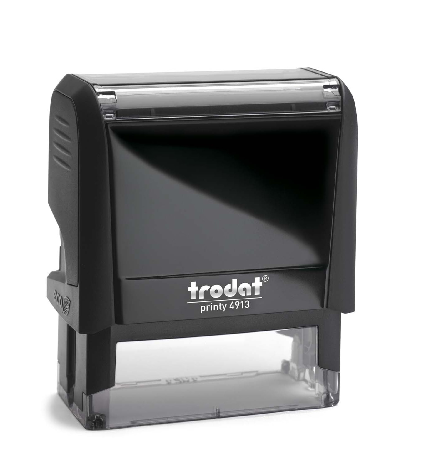 TRODAT PRINTY 4913, Modell 4.0. 6-zeiliger Textstempel, selbstfärbend, mit integriertem Stempelkissen in Schwarz. Absolut sauberer Kissenwechsel dank spezieller Griffzonen. Minimierter CO2-Fußabdruck. Die unvermeidbaren CO2-Emissionen werden durch Investitionen in vom WWF empfohlene Klimaschutzprojekte ausgeglichen (mehr unter www.umwelt.trodat.de). Das glasklare Positionierungsfenster und die transparenten Bodenkanten garantieren ein ultrapräzises Ausrichten. Der kleine, leichte Taschenstempel im edlen Hochglanzdesign wird mit einem Gutschein zur Anfertigung einer individuellen Textplatte geliefert. Vier Schriftarten stehen zur Auswahl, zusätzliche Schriften und Einbindung eines Logos bei Bestellung der Stempelplatte online unter www.stempeltextplatten.trodat.de. Stempelgröße: 7,5 x 3,9 x 8,5 cm. Farbe: schwarz. Max. Abdruckgröße 58 x 22 mm.