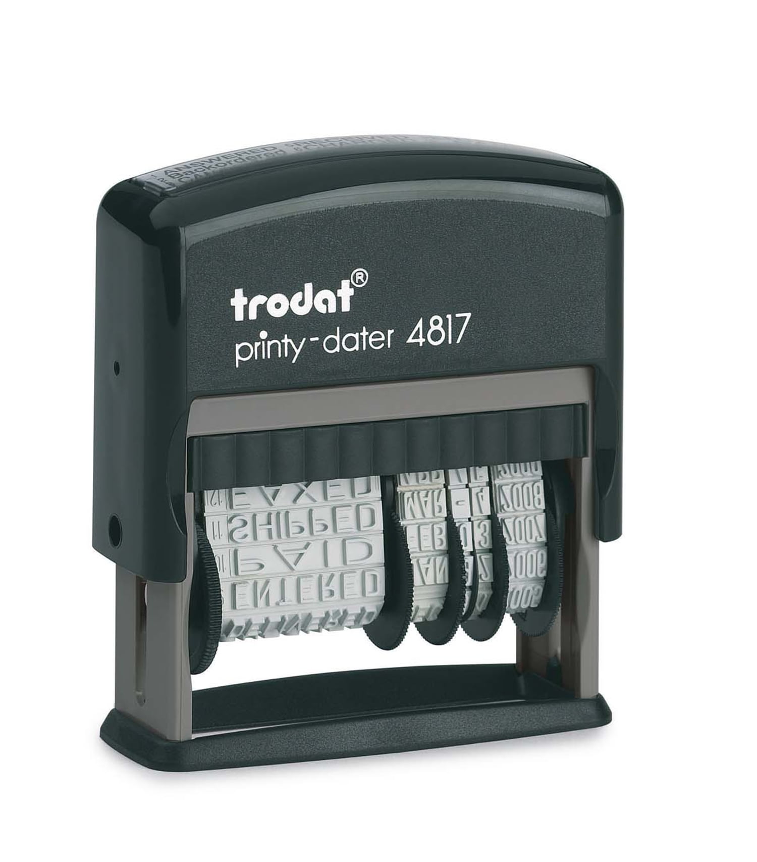 TRODAT 4817 Wortbandstempel mit Datum, selbstfärbend. Die Texte werden individuell mittels Einstellrad verstellt. 12 Texte: EINGEGANGEN AM, ERLEDIGT AM, BESTELLT AM, BEZAHLT AM, VERSENDET AM, BETRAG ERH. AM, FAKTURIERT AM, KONTROLLIERT AM, GEBUCHT AM, GESCANNT AM, PER E-MAIL AM, TELEFONIERT AM. Das Datum (Monat in Buchstaben) lässt sich ebenfalls individuell einstellen. Ein schwarzes Stempelkissen gehört zum Lieferumfang. Abdruckgröße 3,8 x 46 mm. Stempelgröße: 7,0 x 2,5 x 8,0 cm