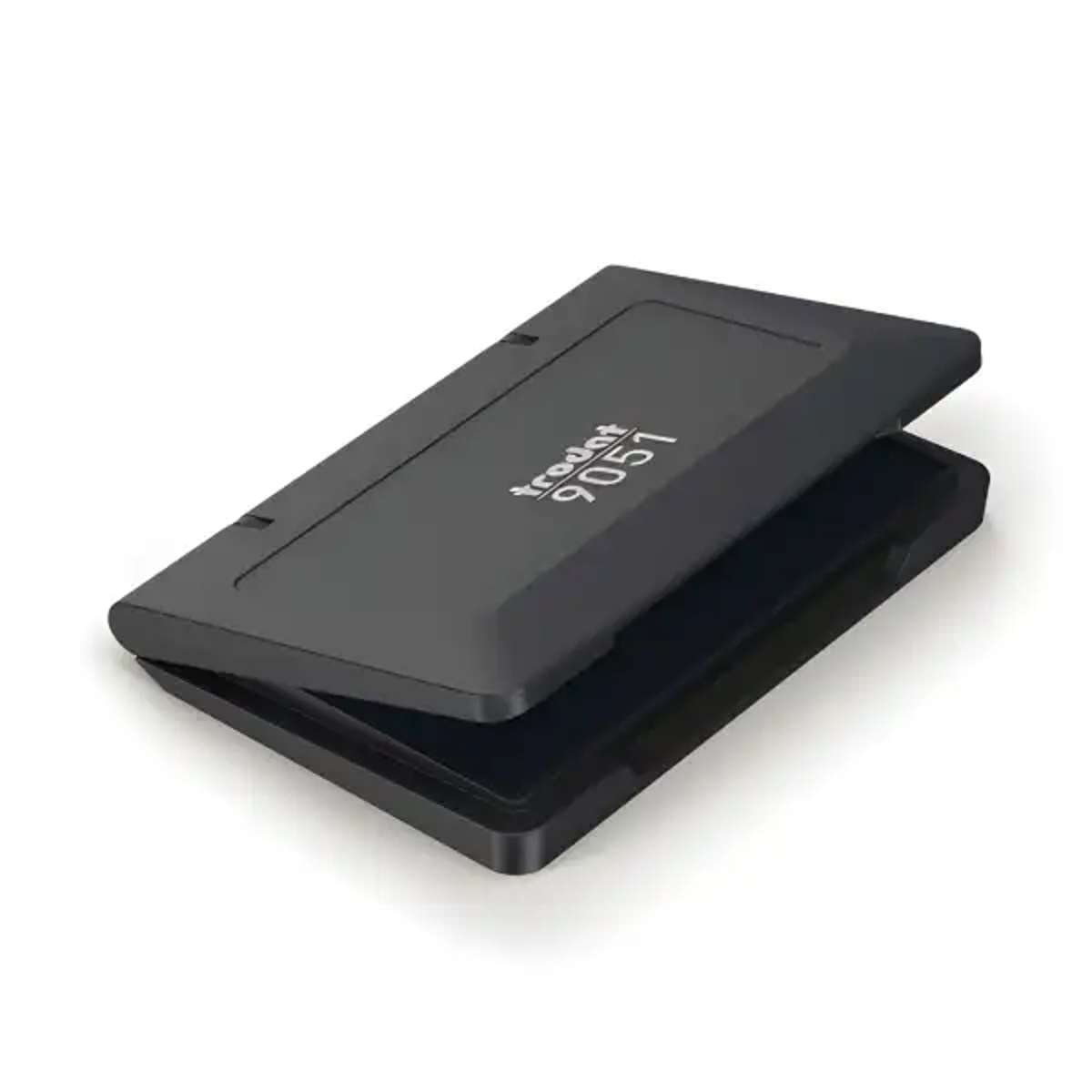 Trodat Handstempelkissen, schwarz. Stabiles Kunststoffgehäuse, das sich mit einer Hand öffnen lässt. Kisseneinlage aus Filz. Reicht für tausende von sauberen Abdrucken. Kein Austrocknen, auch bei längerem Öffnen. Dokumentenechte, wasserbasierende Stempelfarbe. Kissengröße 9 x 5 cm.