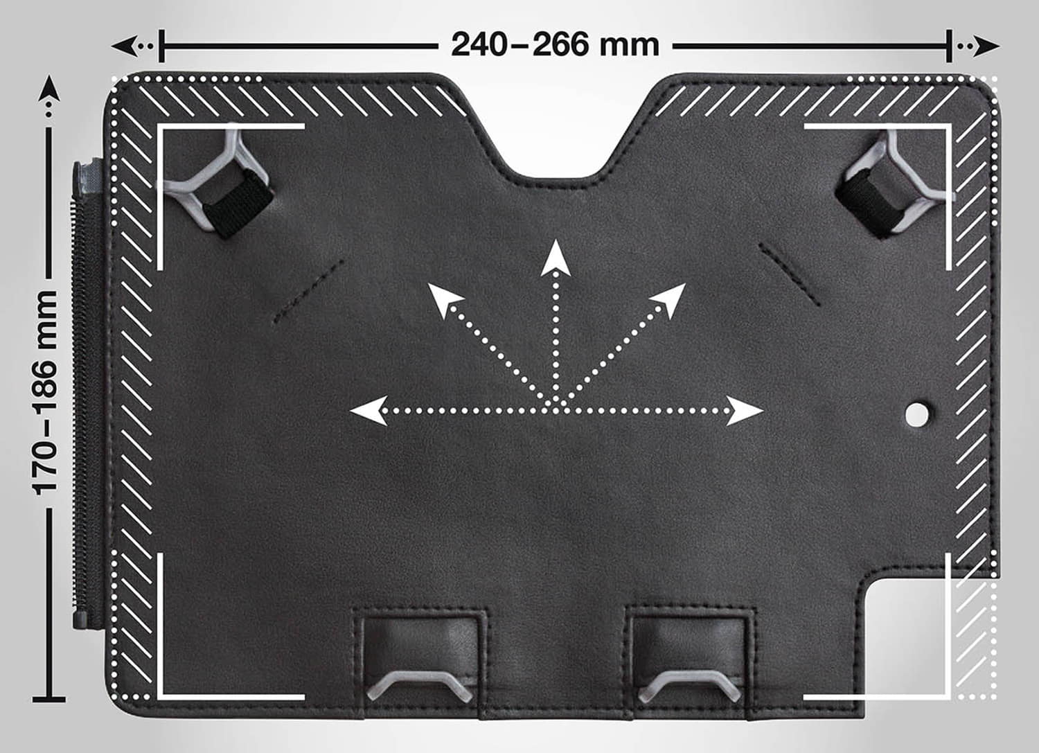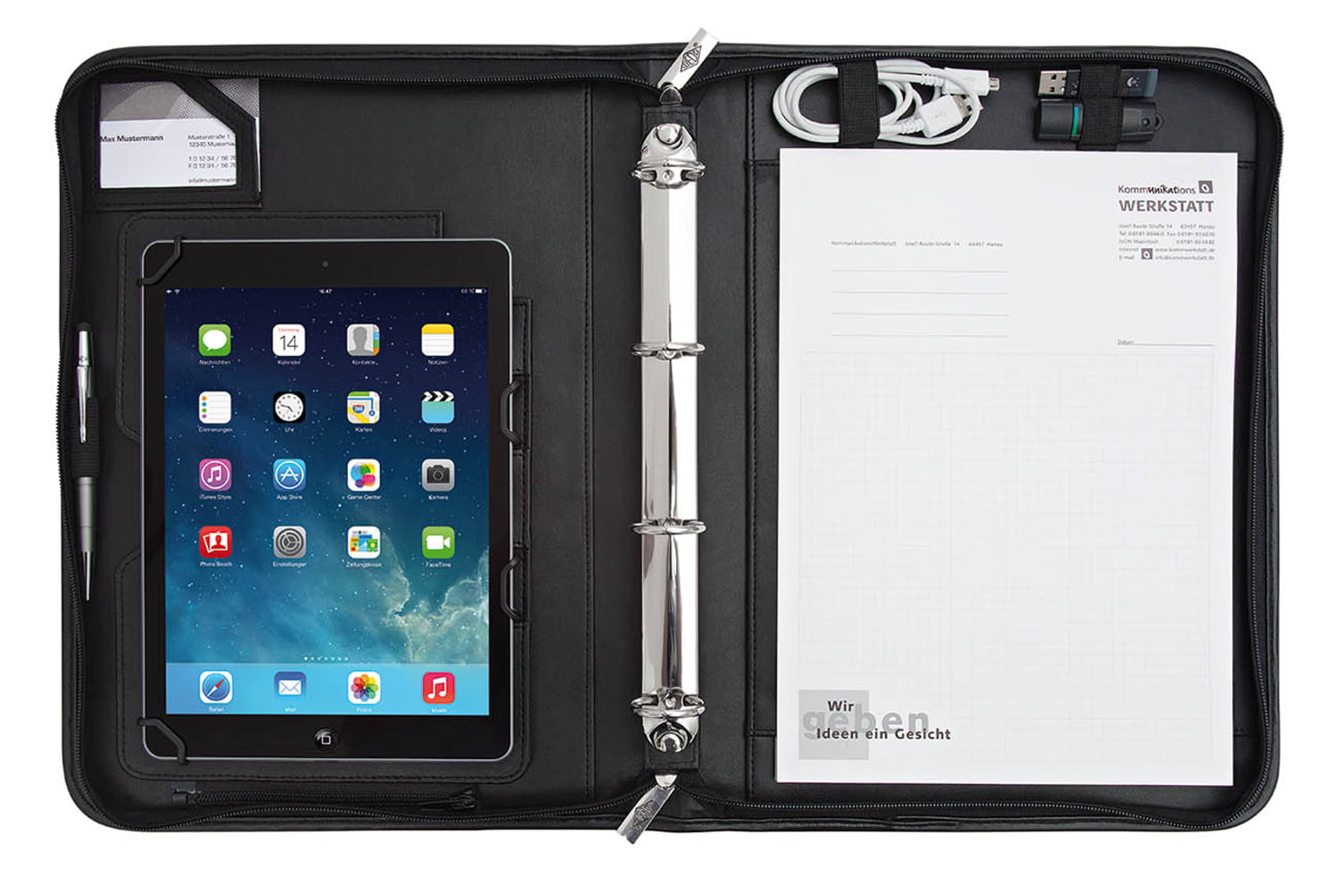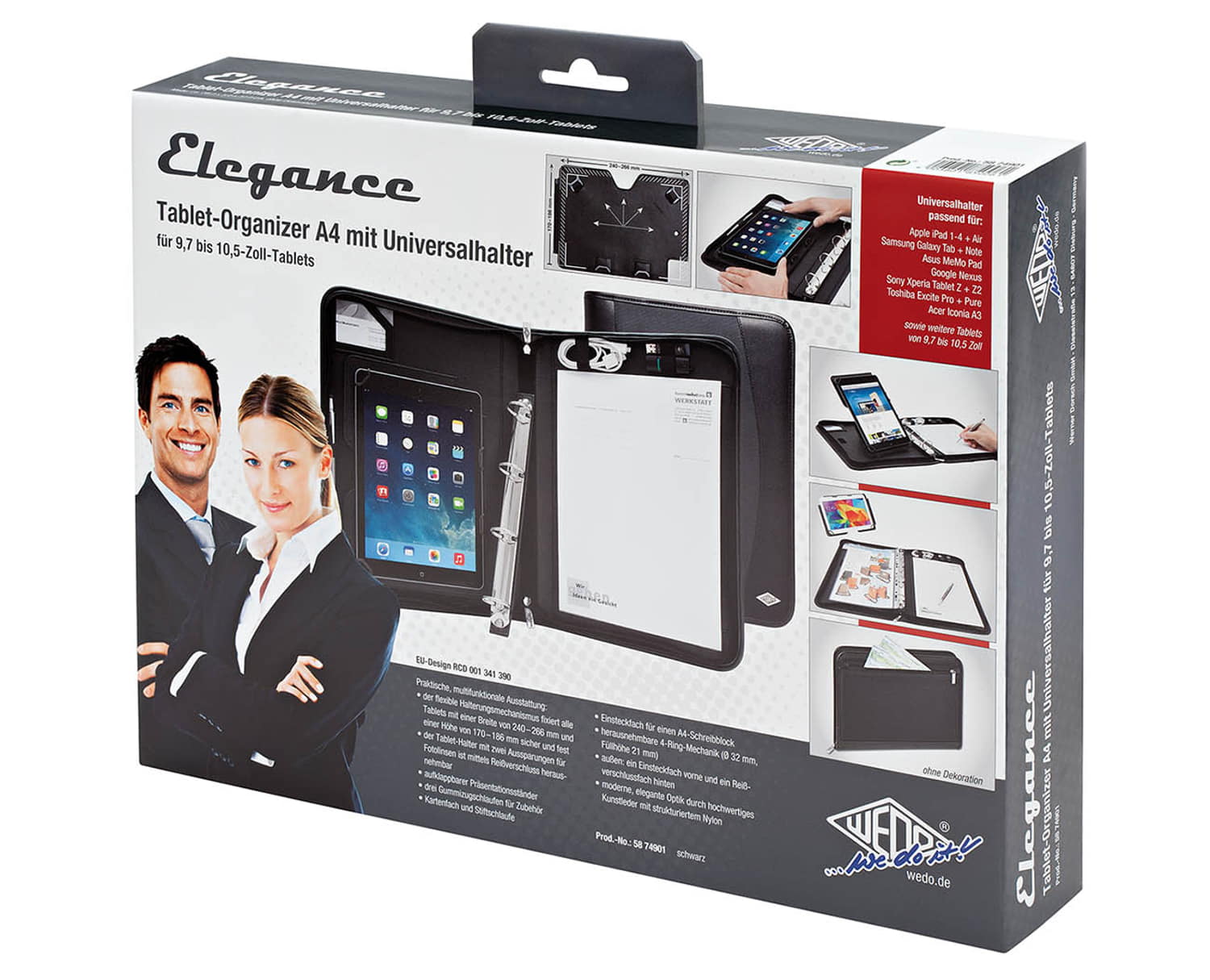 WEDO Tablet-Organizer A4 ELEGANCE mit herausnehmbarer 4-Ring-Mechanik und Universallhalter für 9,7 bis 10,5-Zoll-Tablets. Der flexible Halterungsmechanismus fixiert alle Tablets mit einer Breite von 240 - 266 mm und einer Höhe von 170 - 186 mm sicher und fest. Der Tablet-Halter mit 2 Aussparungen für Fotolinsen ist durch einen Reißverschluss herausnehmbar (EU-Design RCD 001 341 390). Der integrierte Ständer kann sowohl für quer- als auch für hochformatige Präsentationen aufgeklappt werden. Die weitere Innenausstattung umfasst: drei Gummizugschlaufen für Zubehör, ein Kartenfach, eine Stiftschlaufe, ein Einsteckfach für einen A4-Schreibblock und eine herausnehmbare 4-Ring-Mechanik (Durchmesser 32 mm, Füllhöhe 21 mm). Außen bieten ein Einsteckfach vorne und ein flaches Reißverschlussfach hinten Platz für weitere Unterlagen. Moderne, elegante Optik durch die Kombination von hochwertigem Kunstleder und strukturiertem Nylon. Farbe: schwarz, Maße: ca. 28,0 x 5,0 x 37,0 cm. Lieferung im bebilderten Karton mit Euroloch. Universallhalter passend für: Apple iPad 1-4 + Air, Samsung Galaxy Tab + Note, Asus MeMo Pad, Google Nexus, Sony Xperia Tablet Z + Z2, Toshiba Excite Pro + Pure, Acer Iconia A3 sowie weitere Tablets von 9,7 bis 10,5 Zoll