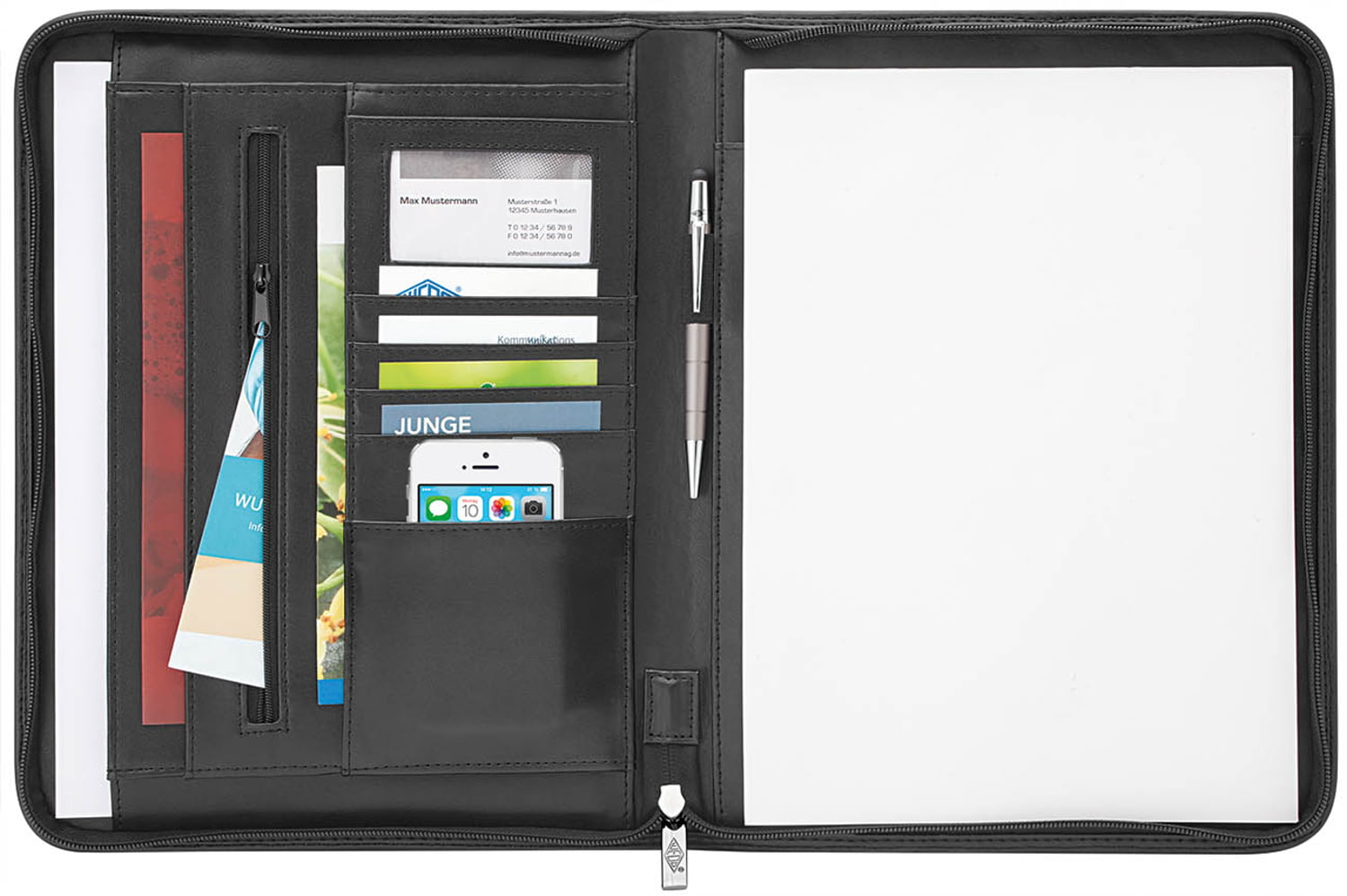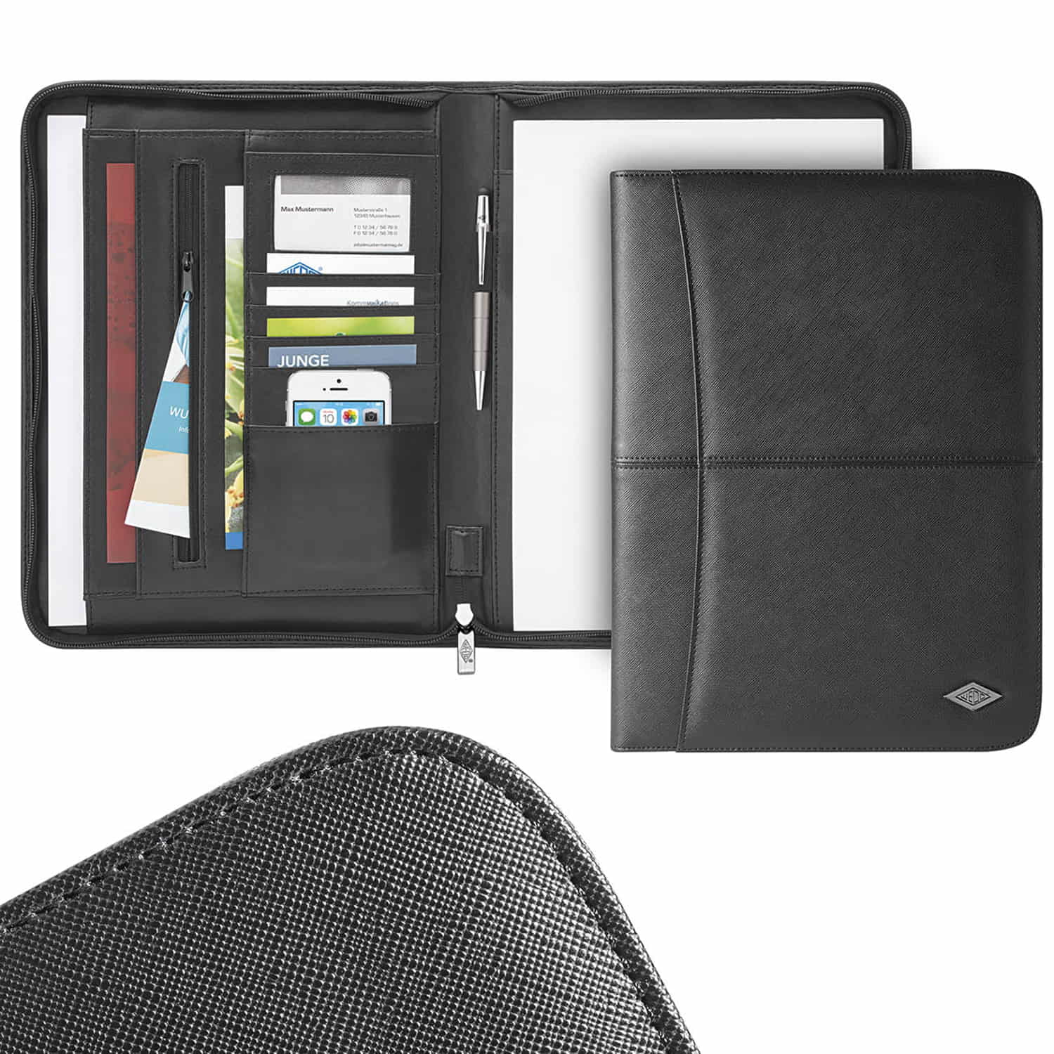 WEDO Tagungsmappe ACCENTO für DIN A4-Format. Hochwertig verarbeitete Tagungsmappe in modernem Design aus strukturiertem, strapazierfähigem Kunstleder mit A4-Außenfach und umlaufendem Reißverschluss. Sie wird inklusive einem A4-Schreibblock geliefert. Die praktische Innenaufteilung umfasst je ein A4-Faltfach und A5-Einsteckfach, ein Reißverschlussfach, ein Sichtfenster für Visitenkarten, vier Kartenfächer, zwei weitere Einsteckfächer sowie eine Gummizugschlaufe für ein Schreibgerät. Farbe: schwarz. Maße: ca. 25,5 x 4,5 x 33,5 cm. Lieferung im bebilderten Karton.