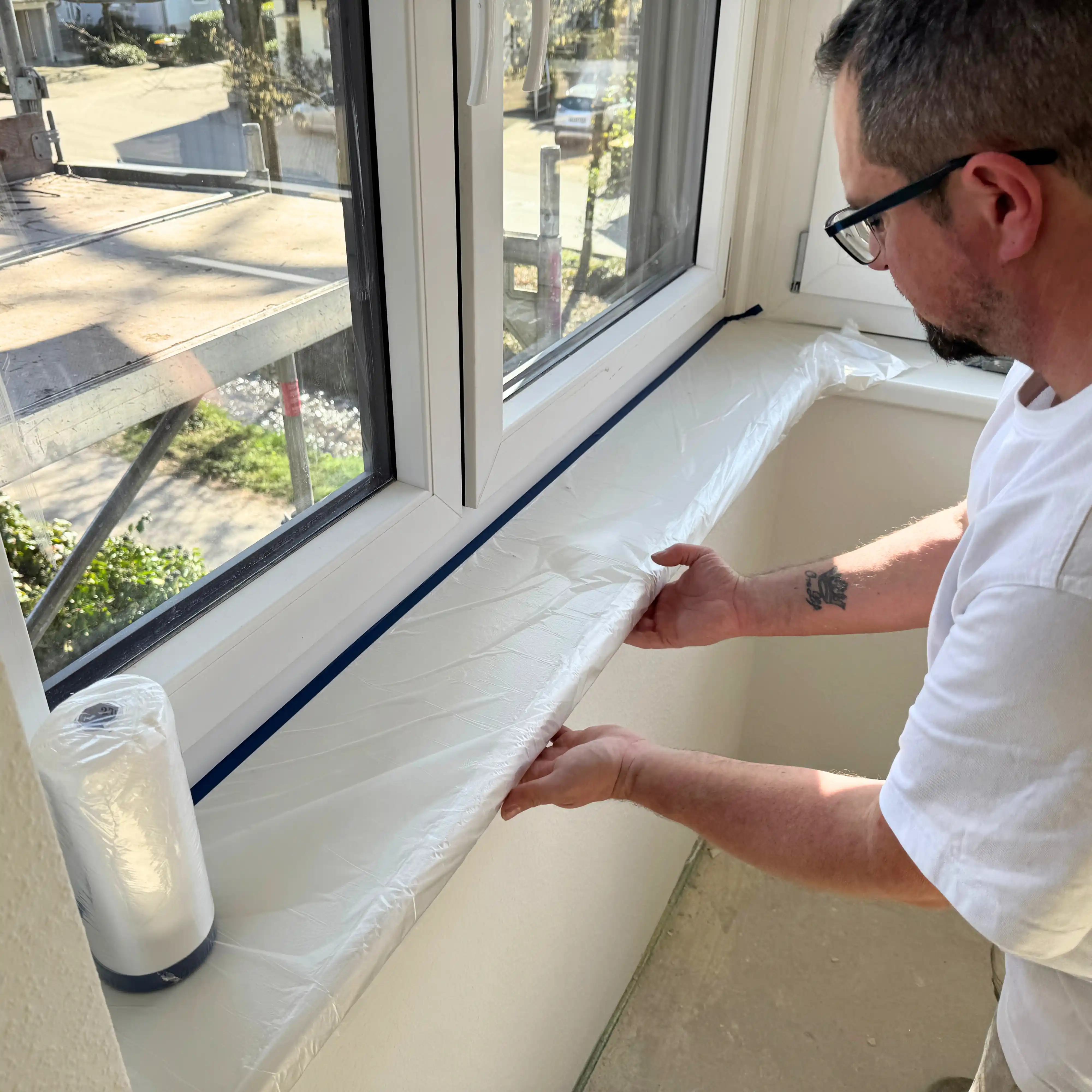- Die Abdeckfolie ist leicht statisch aufgeladen und schmiegt sich so selbständig an den Untergrund an.
