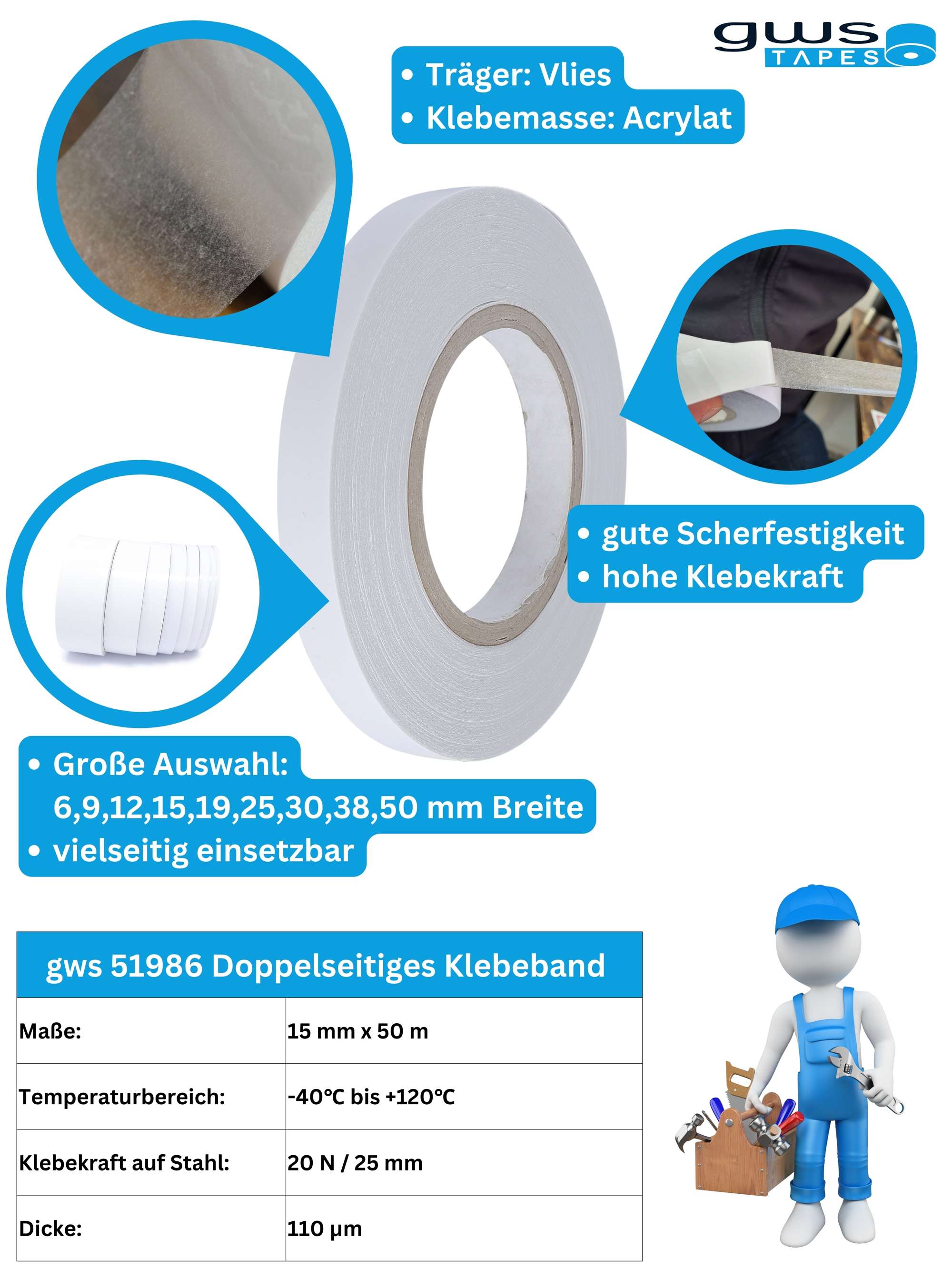 gws Fix UNIVERSAL ist ein doppelseitig klebendes, weißes Vliesband mit mod. Acrylat-Klebmasse.