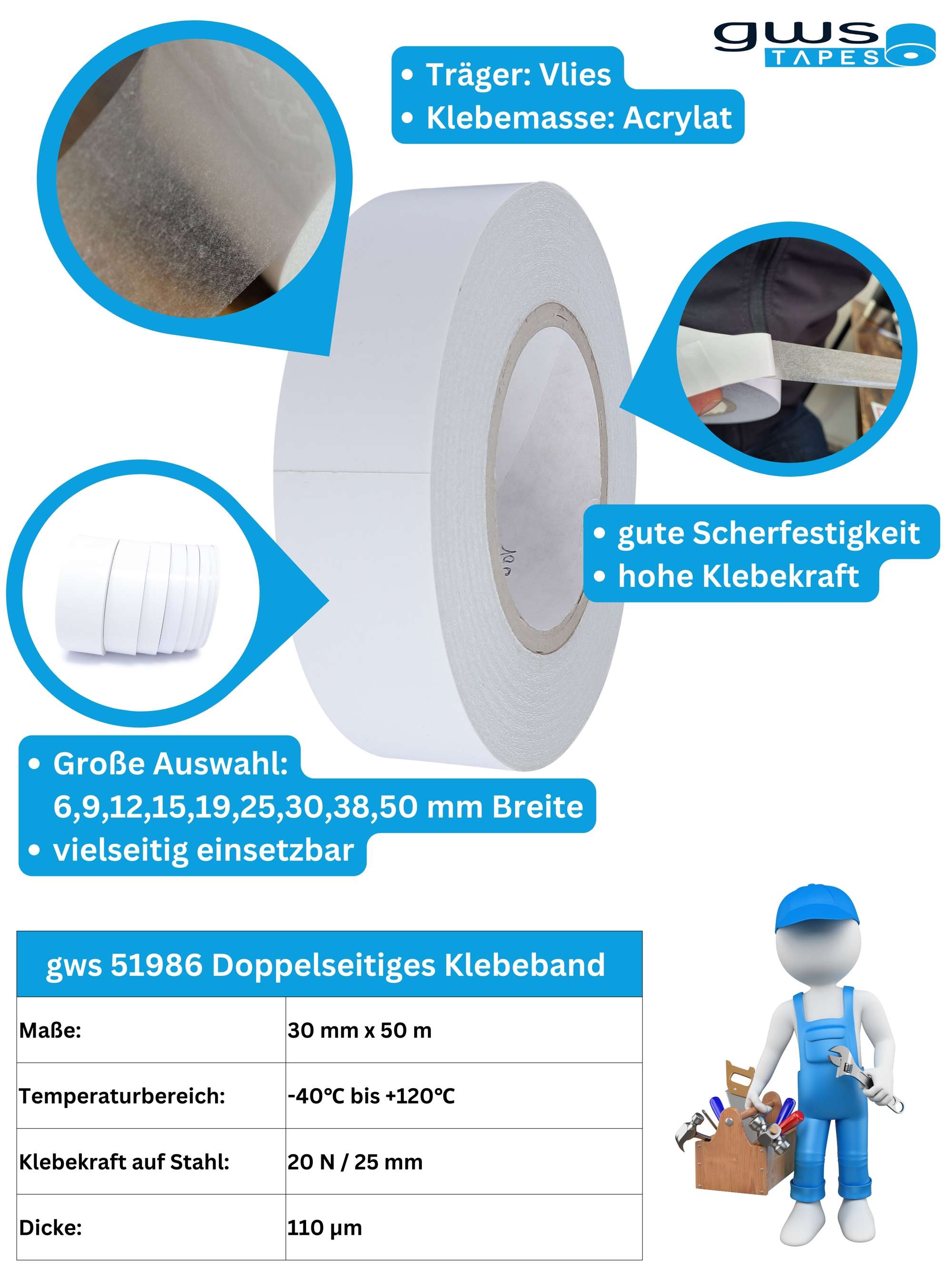 gws Fix UNIVERSAL ist ein doppelseitig klebendes, weißes Vliesband mit mod. Acrylat-Klebmasse.