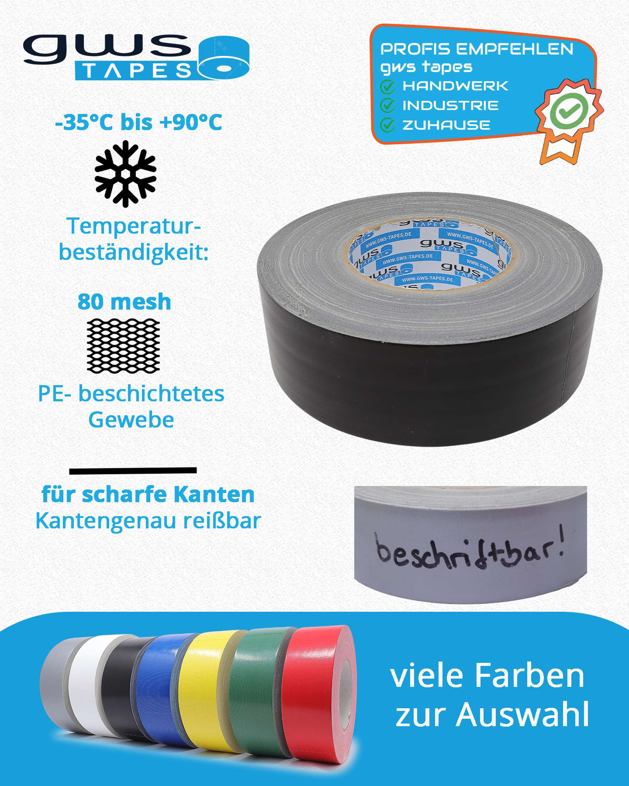 - PREMIUM QUALITÄT: Das hochwertige gws Premium Gewebeband begeistert mit seiner hohen Beständigkeit und seiner erstklassigen Klebkraft. Durch seine Beschriftbarkeit eignet es sich auch hervorragend als Markierungsband. Wählen Sie zwischen verschiedenen Farben und Längen/Breiten!