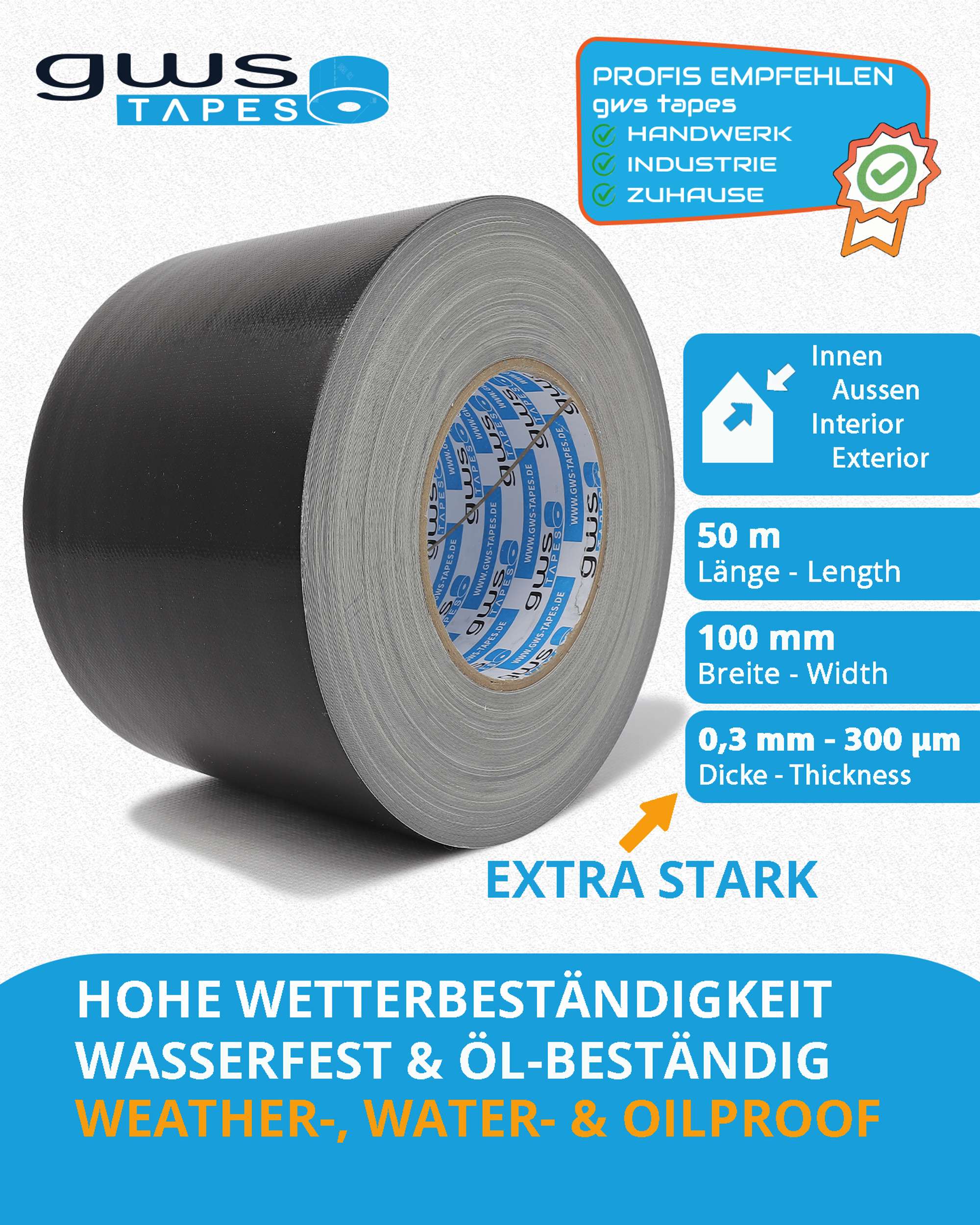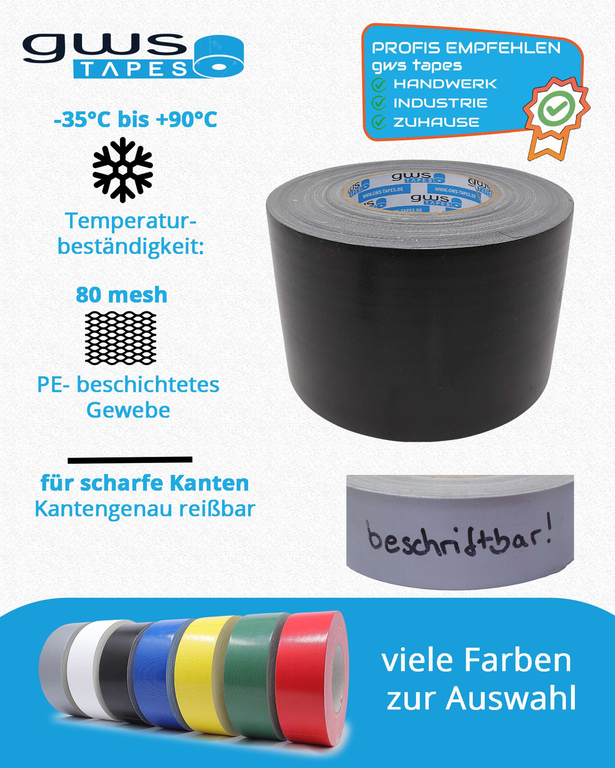 - PREMIUM QUALITÄT: Das hochwertige gws Premium Gewebeband begeistert mit seiner hohen Beständigkeit und seiner erstklassigen Klebkraft. Durch seine Beschriftbarkeit eignet es sich auch hervorragend als Markierungsband. Wählen Sie zwischen verschiedenen Farben und Längen/Breiten!
