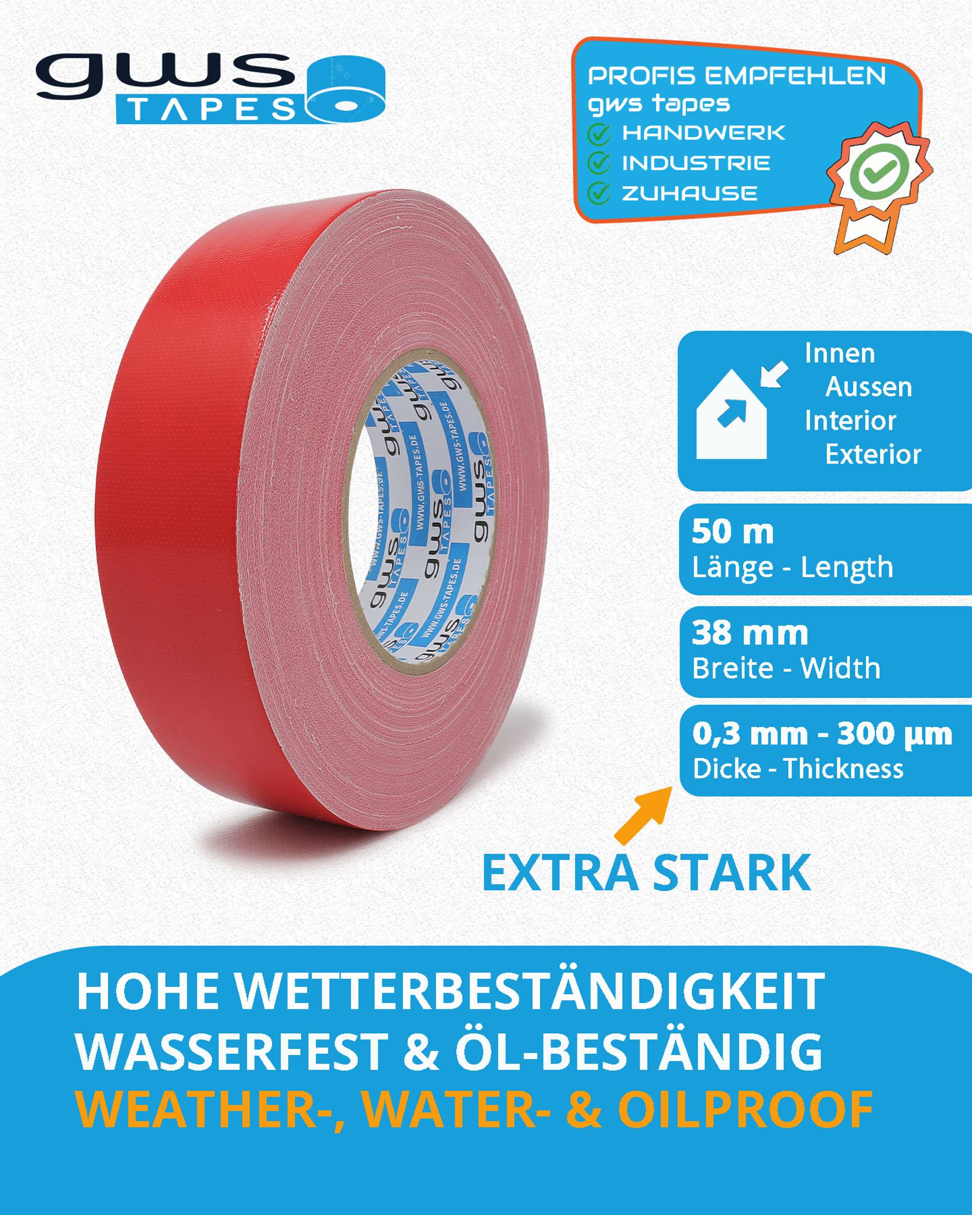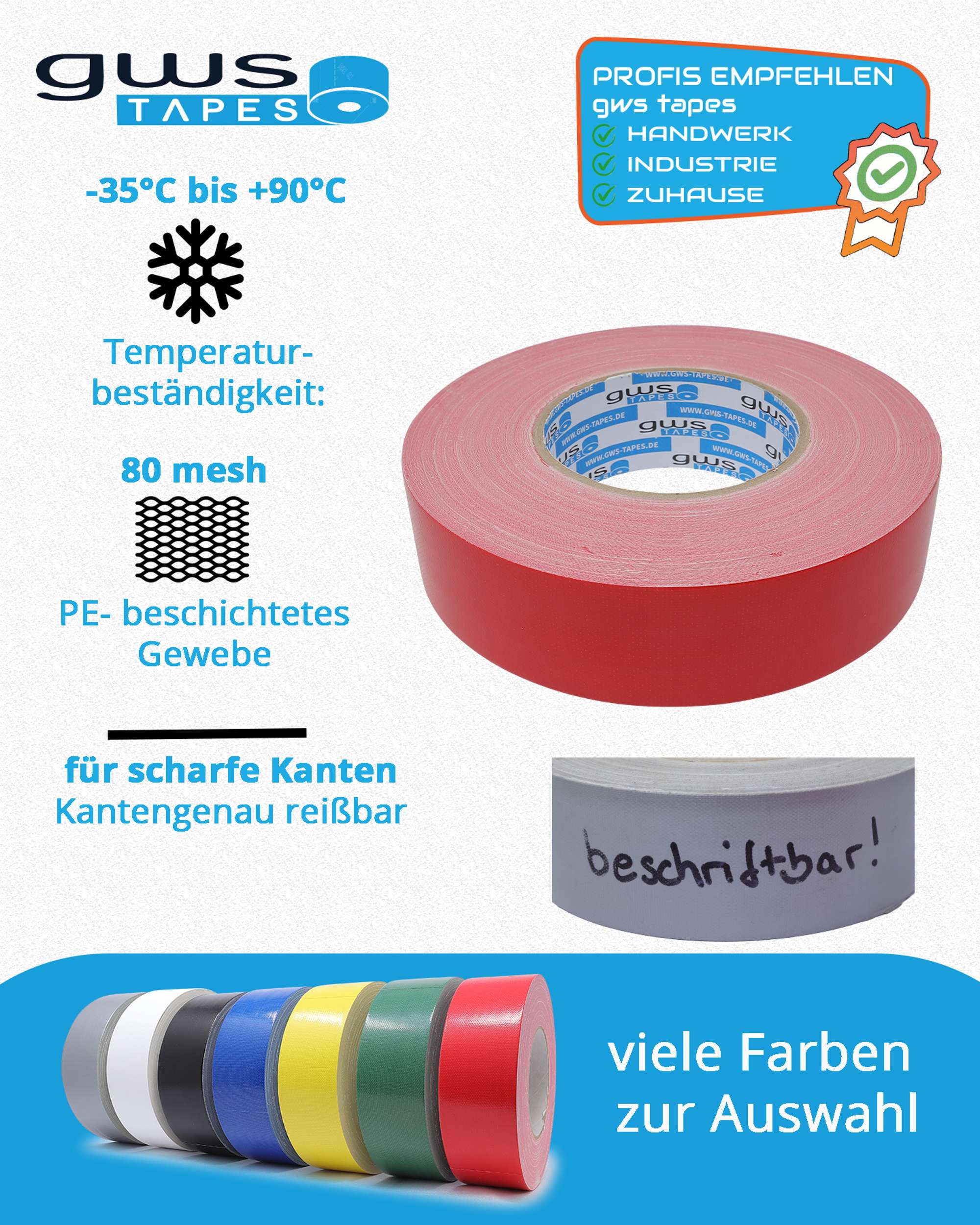 - PREMIUM QUALITÄT: Das hochwertige gws Premium Gewebeband begeistert mit seiner hohen Beständigkeit und seiner erstklassigen Klebkraft. Durch seine Beschriftbarkeit eignet es sich auch hervorragend als Markierungsband. Wählen Sie zwischen verschiedenen Farben und Längen/Breiten!