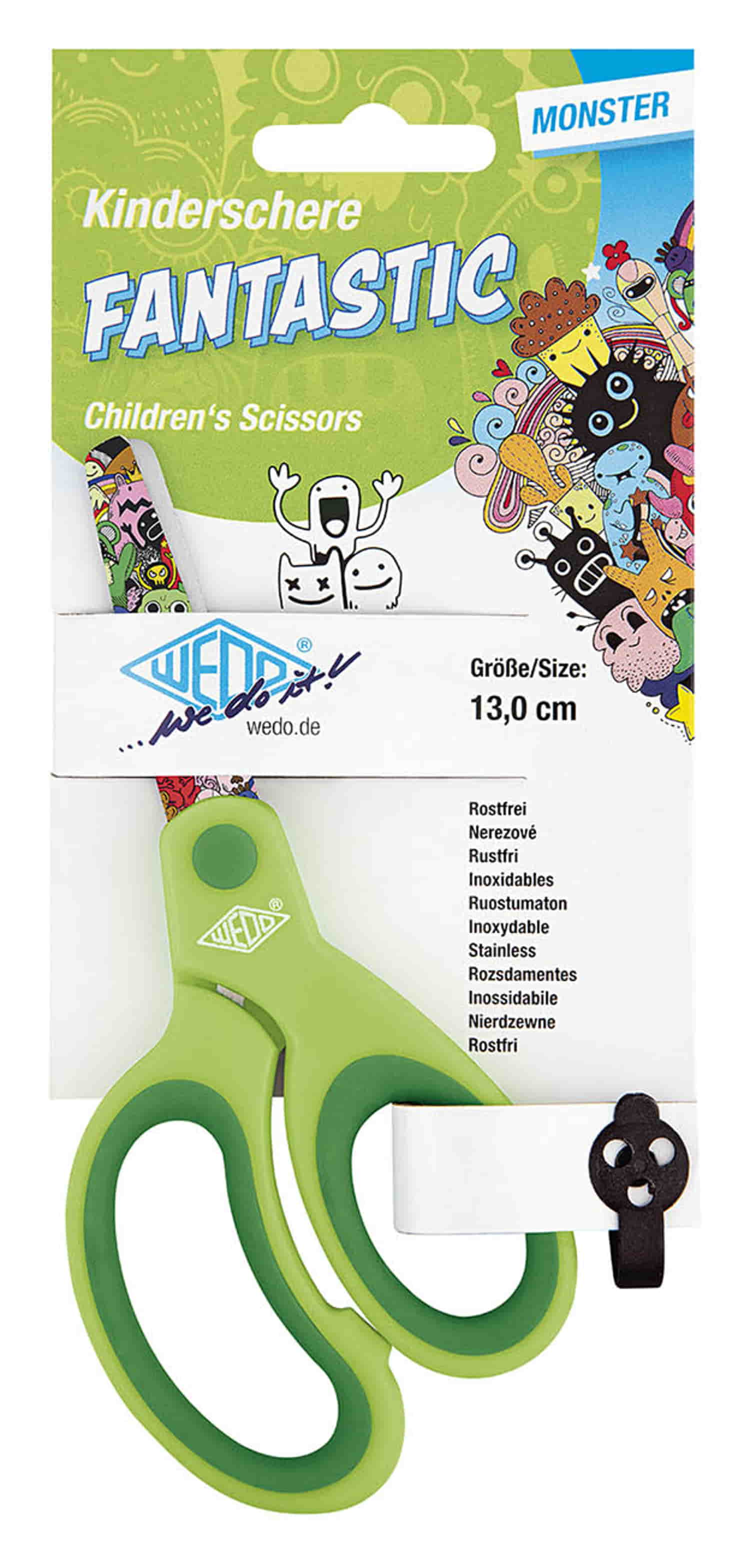 WEDO Kinderscheren FANTASTIC mit Motivdruck MONSTER, Grifffarbe grün. Die kleine, handliche Bastelschere liegt mit ihren ergonomisch geformten Softgriffen bequem in der Kinderhand. Und mit dem coolen Motivaufdruck macht das Schneiden gleich doppelt so viel Spaß. Mit einer Länge von 13 cm hat die Schere die ideale Größe für alle Bastelarbeiten. Die abgerundeten Scherenblätter aus rostfreiem Edelstahl sorgen für präzise Schnitte. Lieferung auf attraktiver SB-Probierkarte.