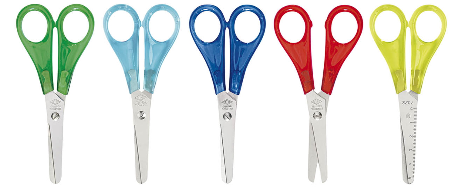 WEDO Bastelschere 13 cm. Rund geformte Scherenblätter aus rostfreiem Stahl mit Cm-Einteilung auf dem Scherenblatt. Kindgerechte Kunststoffgriffe in leuchtenden ICE-Farben. Verpackt im 30er Verkaufsdisplay, farbig sortiert.
