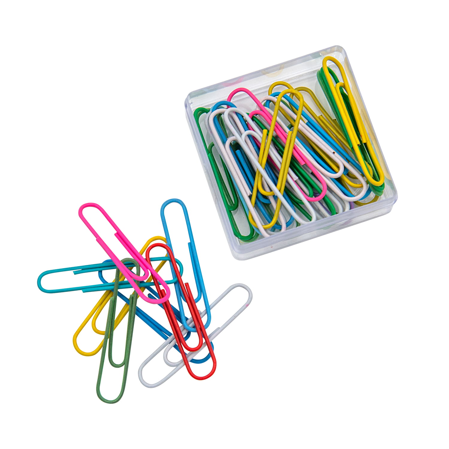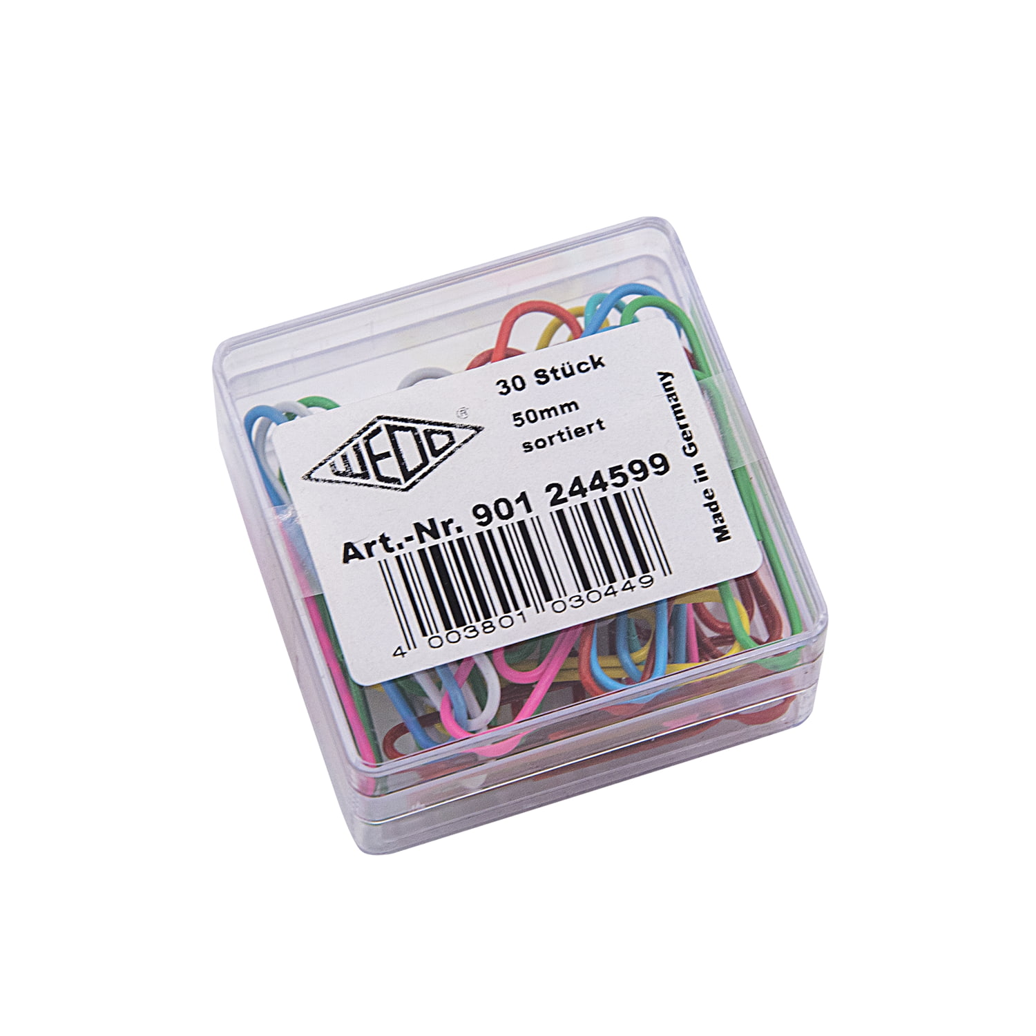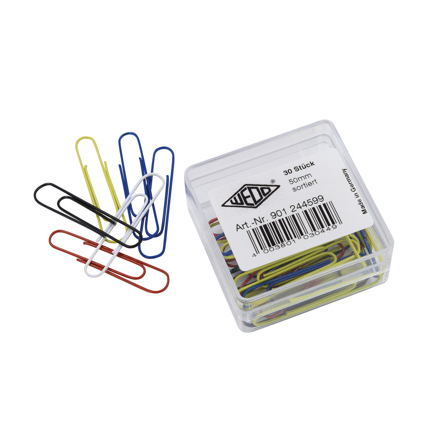 WEDO Büroklammern/Aktenklammern 50 mm farbig sortiert. Aus Metall, mit farbigem Kunststoffüberzug, verpackt in praktischer Klarsichtdose mit 30 Stück.